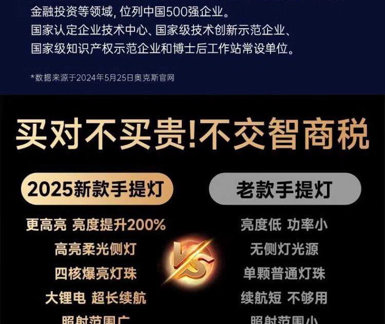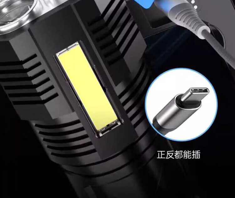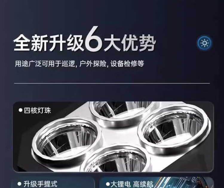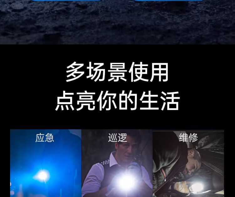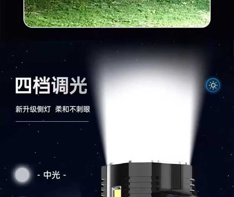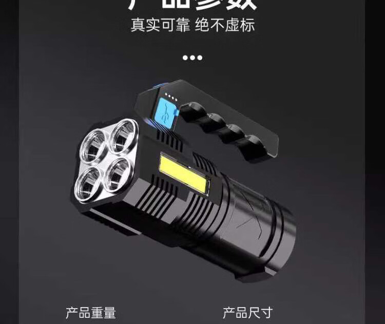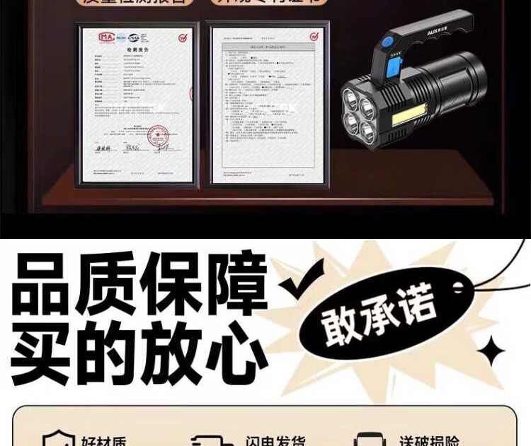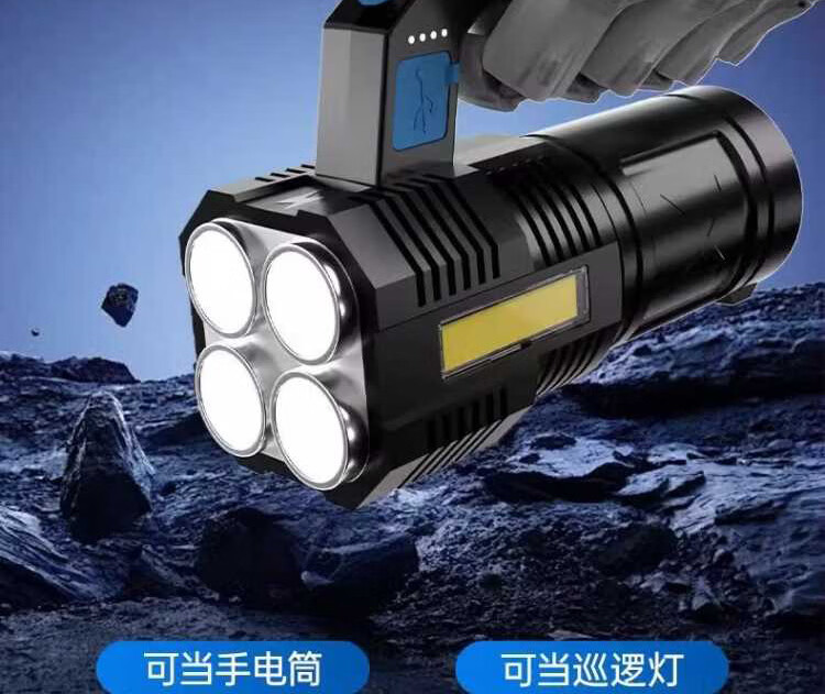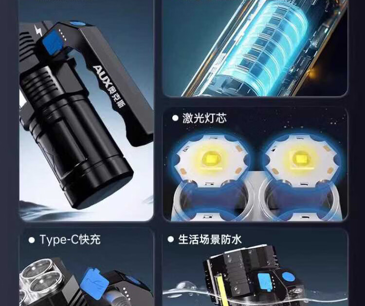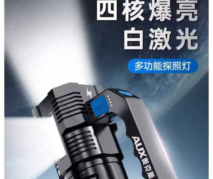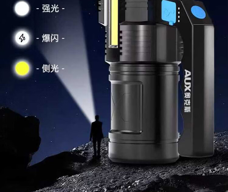 奥克斯强光手电筒超长续航野外探照灯巡检手提灯带侧灯可充电应急巡逻灯 四核灯珠+升级侧灯+电量显示