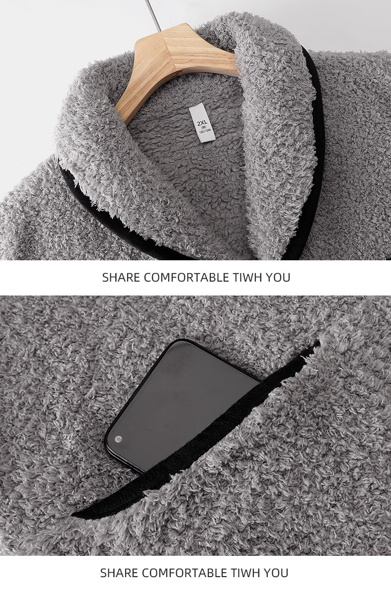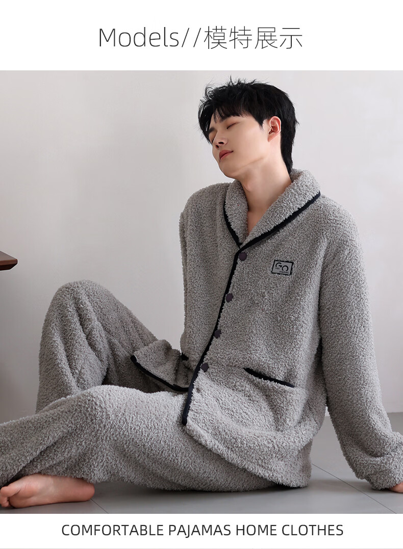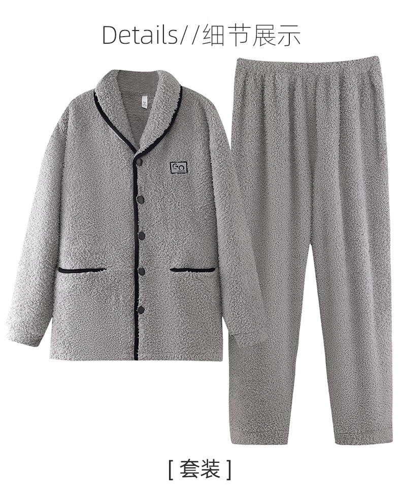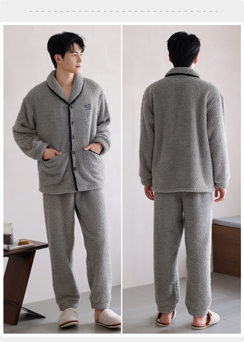 允织半边绒睡衣男士冬季加厚加绒秋冬款开衫高级感冬天家居服保暖套装 9060-烟灰 M (165) :建议100-120斤穿着