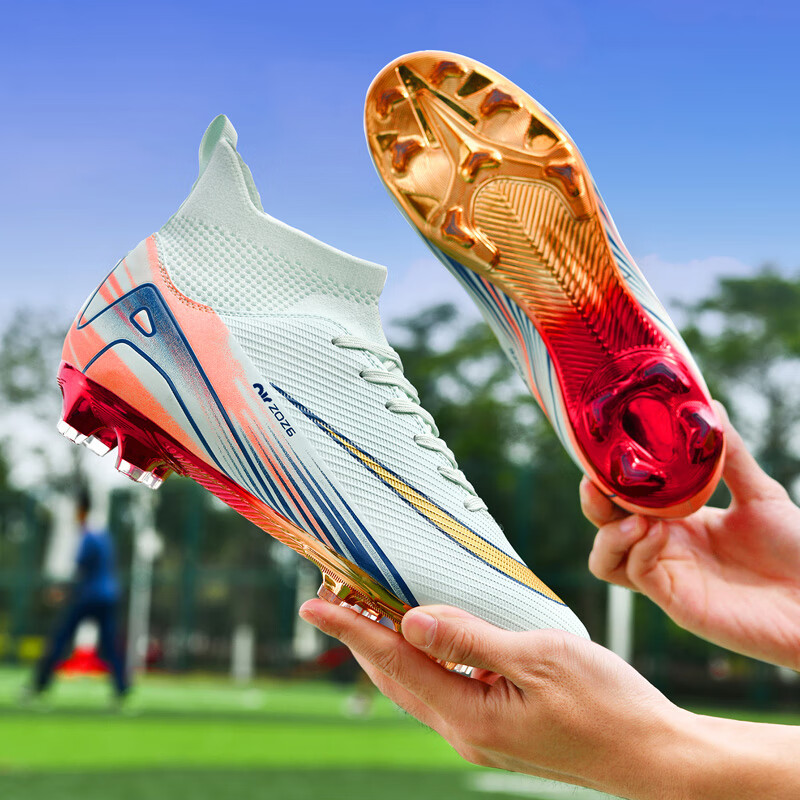 KUNY耐磨新品C罗刺客电镀成人儿童足球鞋男童AG长钉T碎钉学生训练鞋 2501浅月色高帮长钉 袜子+护腿 38