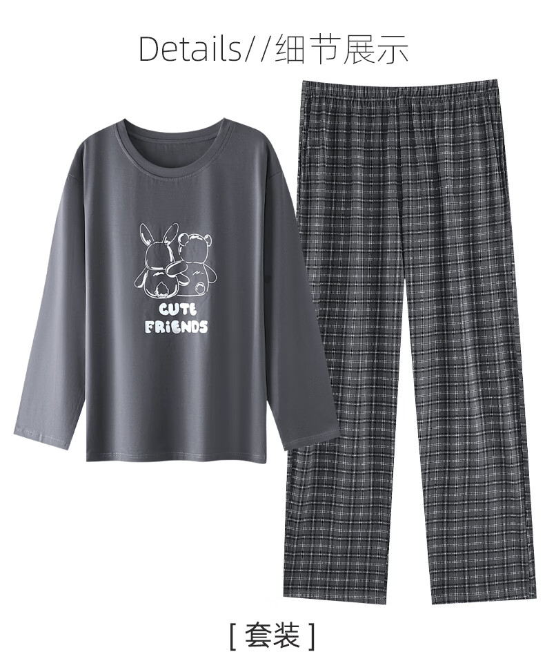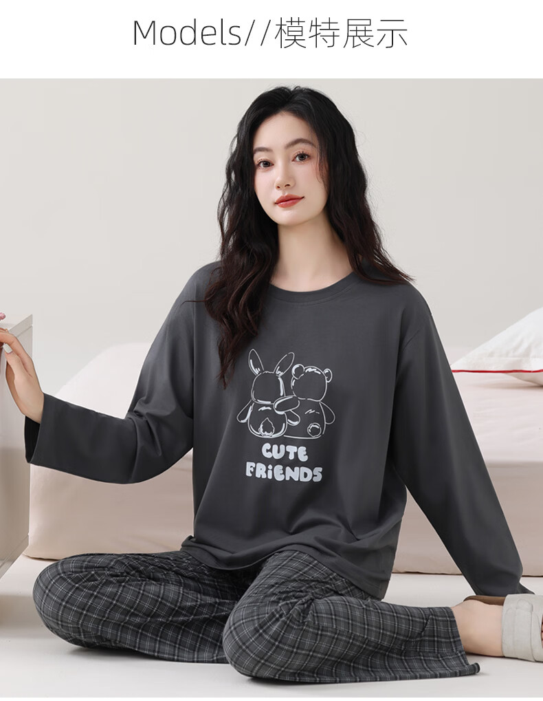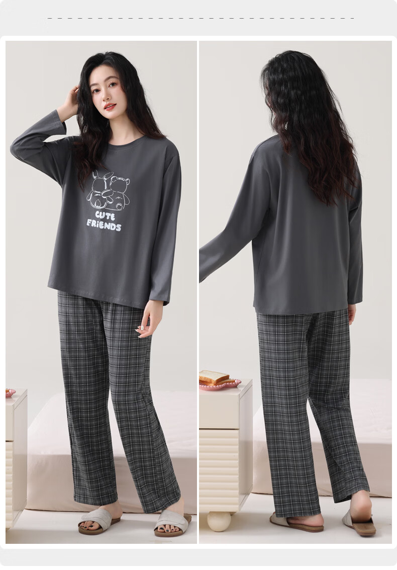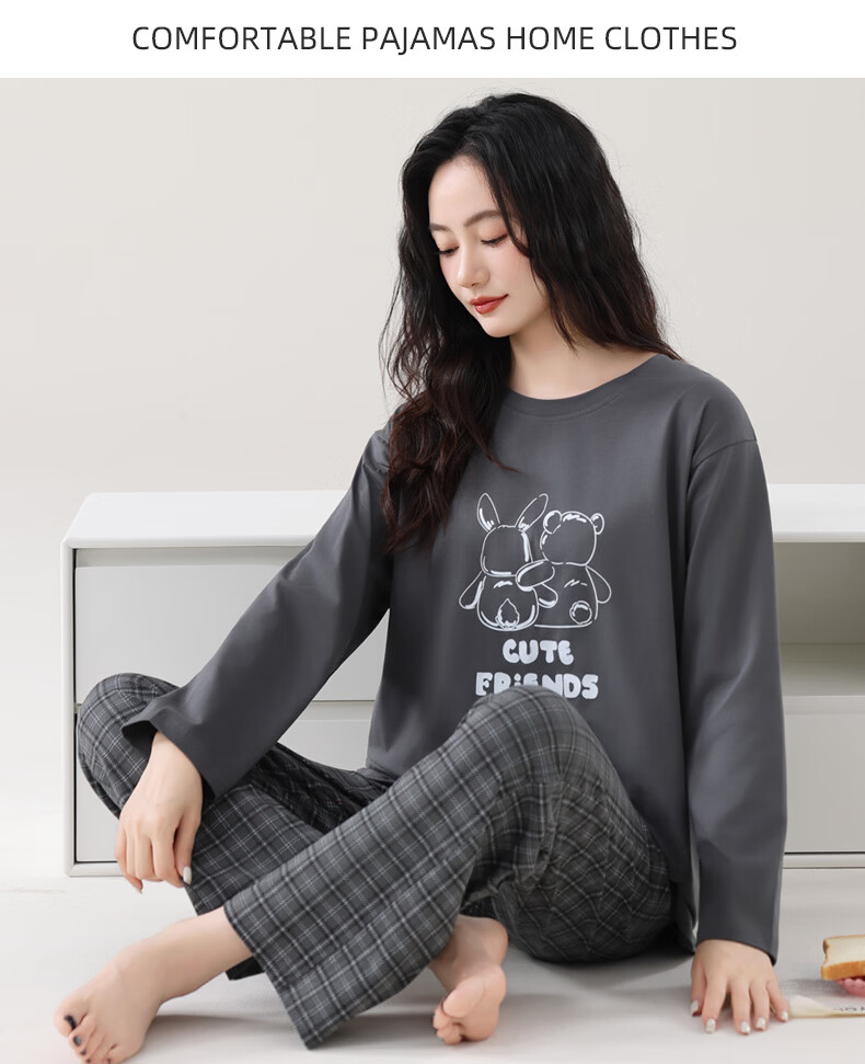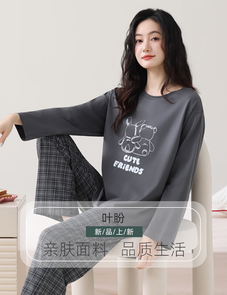 叶盼(yepan)睡衣女春秋季纯棉长袖套头薄款宽松大码休闲女款可外穿家居服套装 86031-灰色 M (160) :建议90-110斤穿着