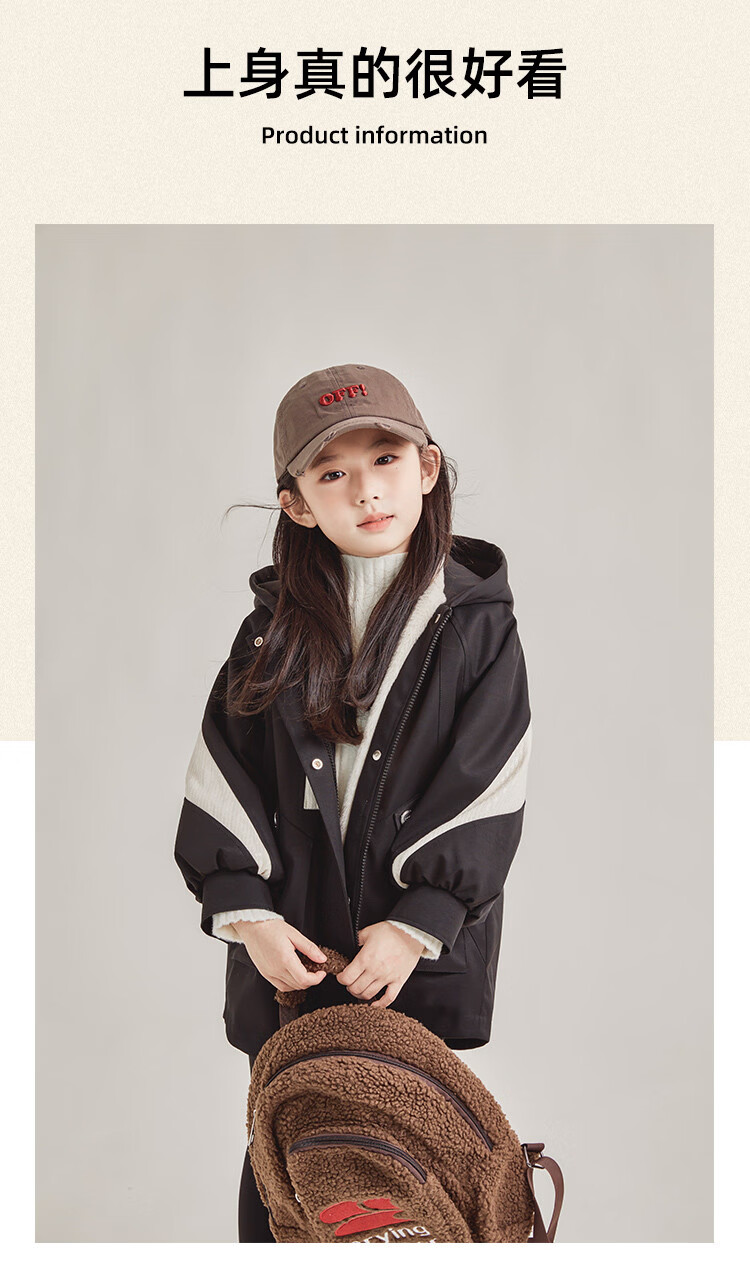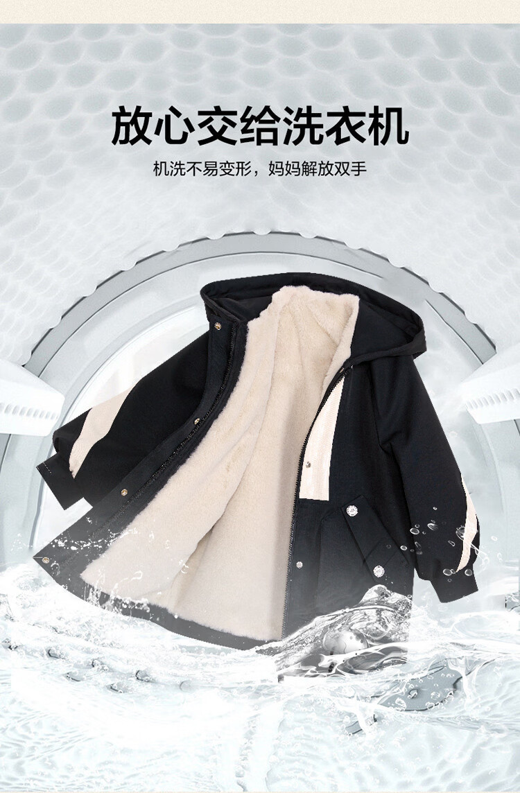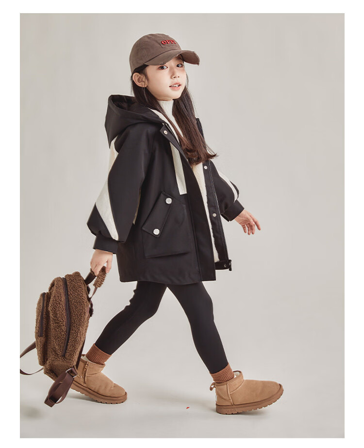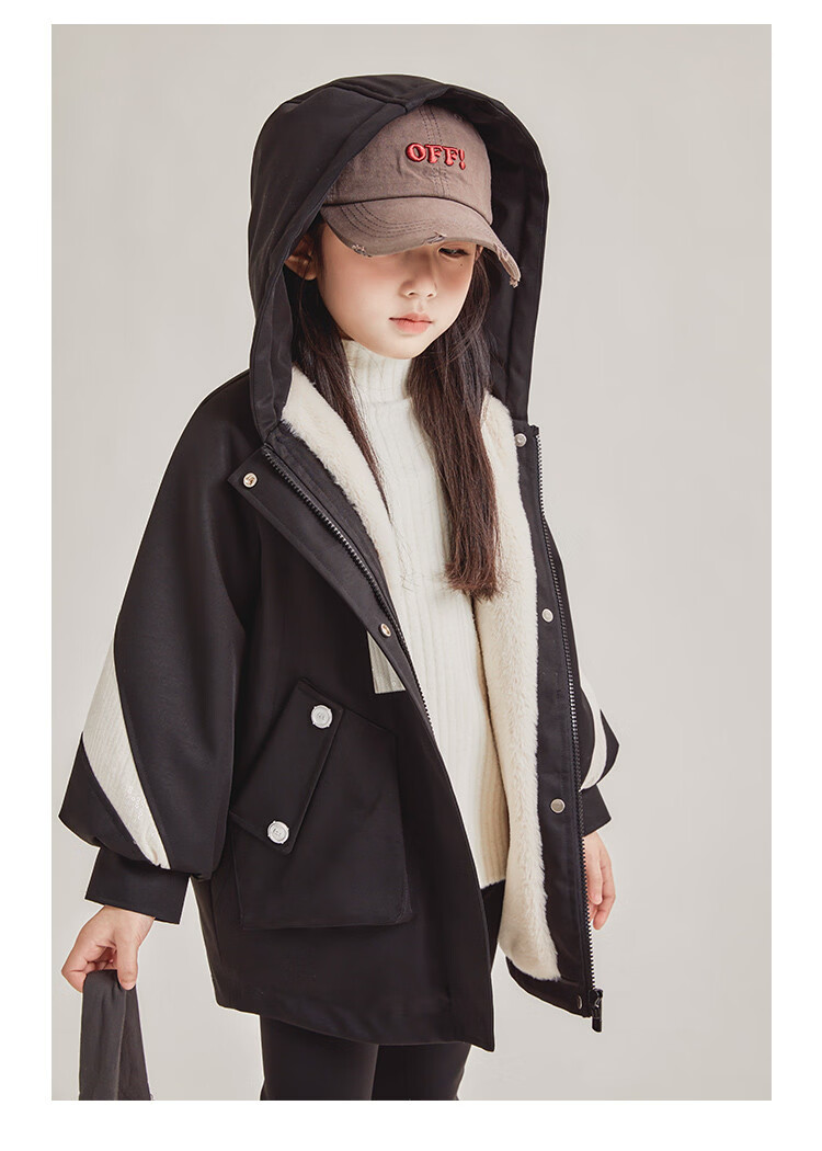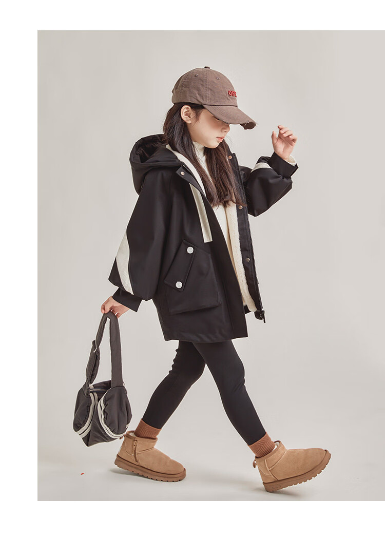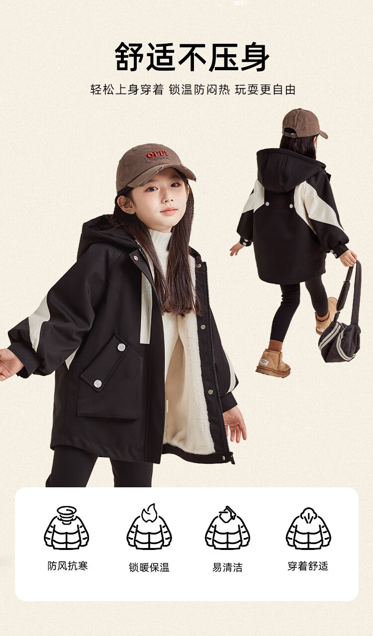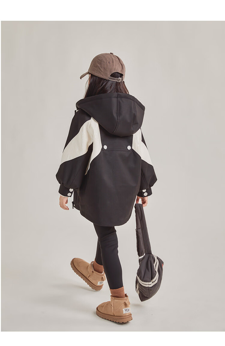 媛媛公主女童派克服外套冬季连帽加绒加厚简约拼色中大童休闲百搭保暖外套 黑色(保暖锁温,不易掉毛) 110