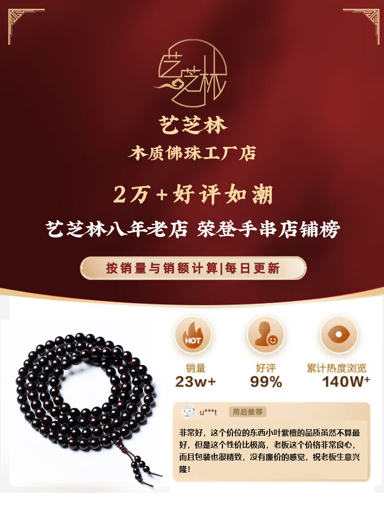 艺芝林正宗小叶紫檀手串108颗佛珠金星老料紫檀原木念珠男女款礼物 金星款8mm