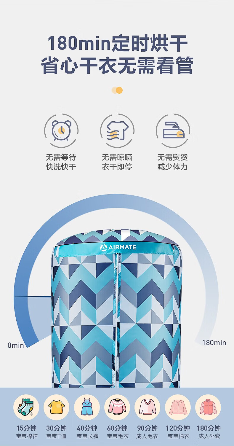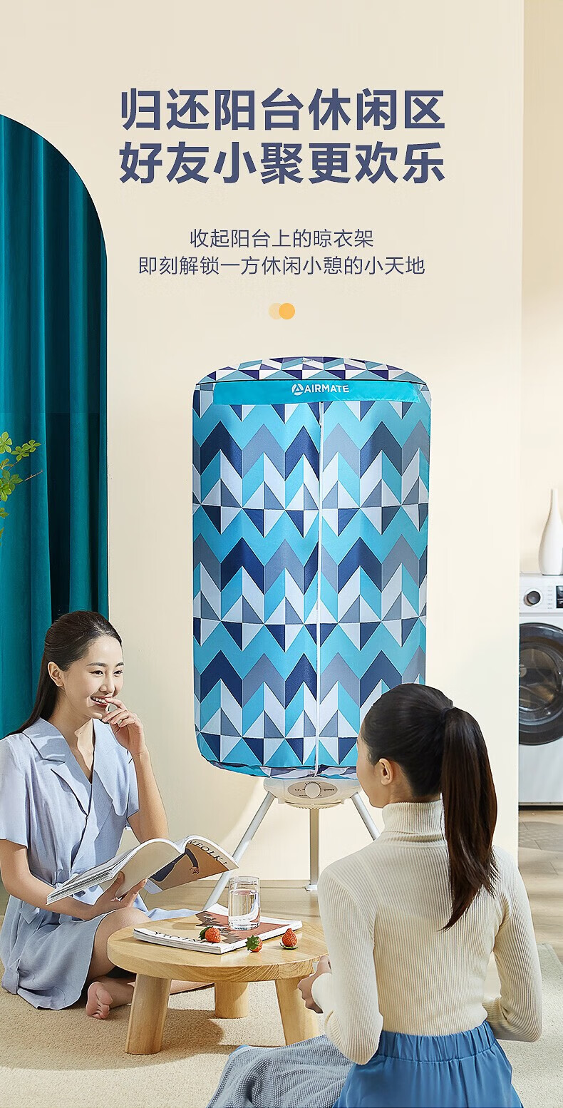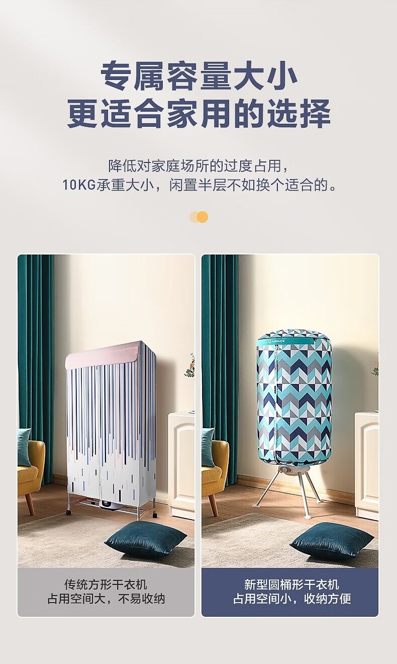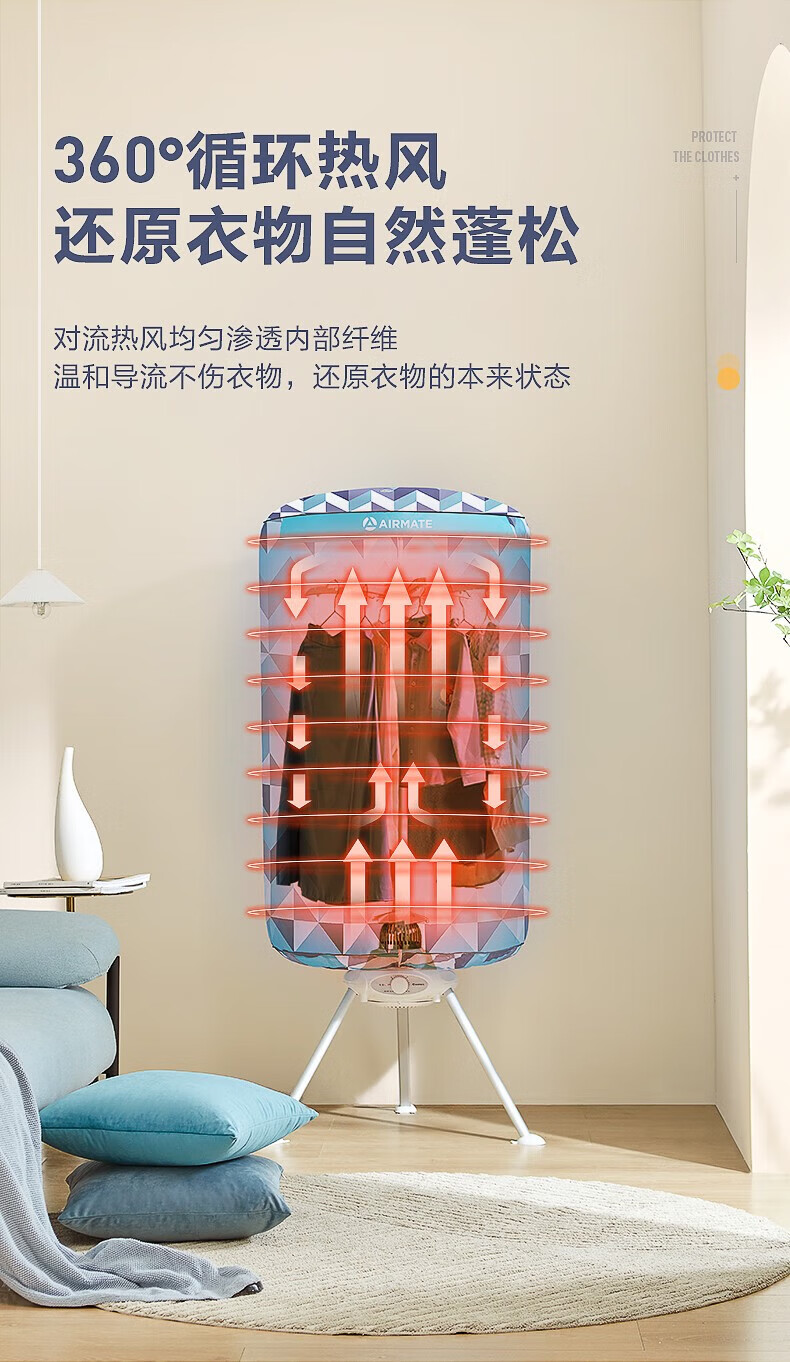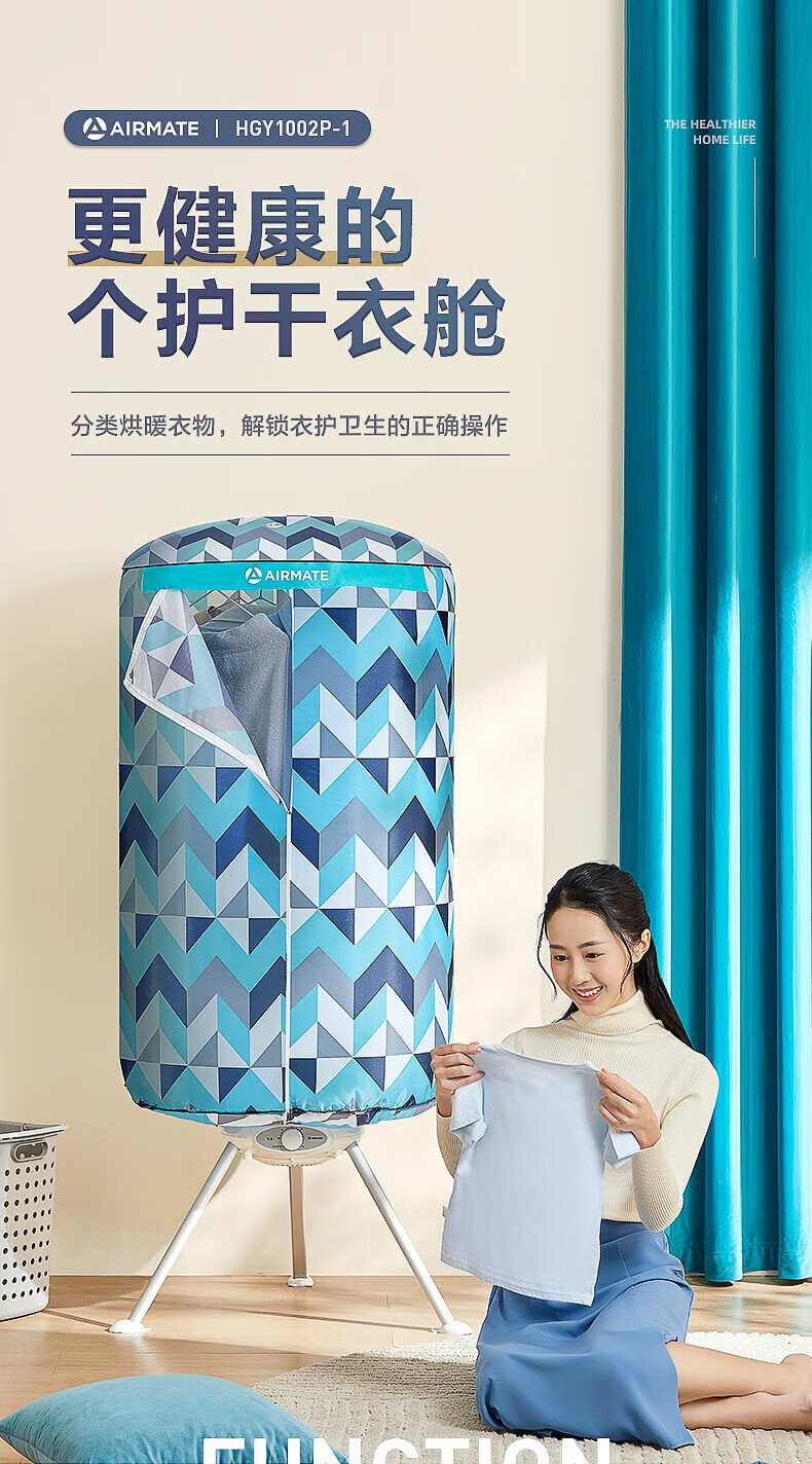 艾美特(AIRMATE)【家用烘干机】干衣机烘衣服母婴儿优选衣物内衣小型宿舍圆筒烘衣机折叠晾衣架巴氏杀菌消毒风干机 花色 1000W速烘 3H定时【巴氏杀菌】 300L