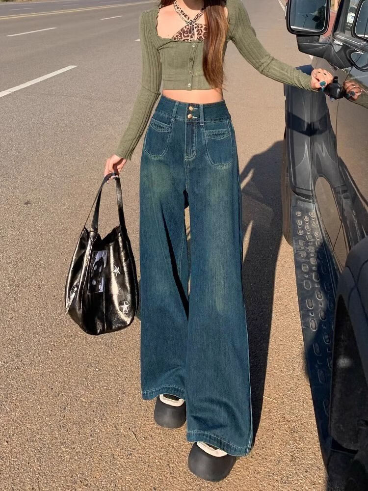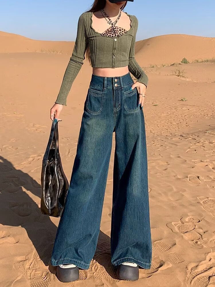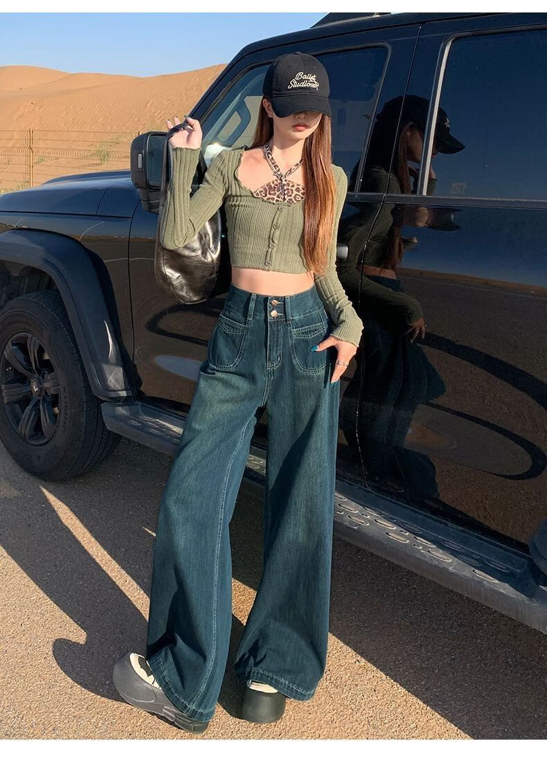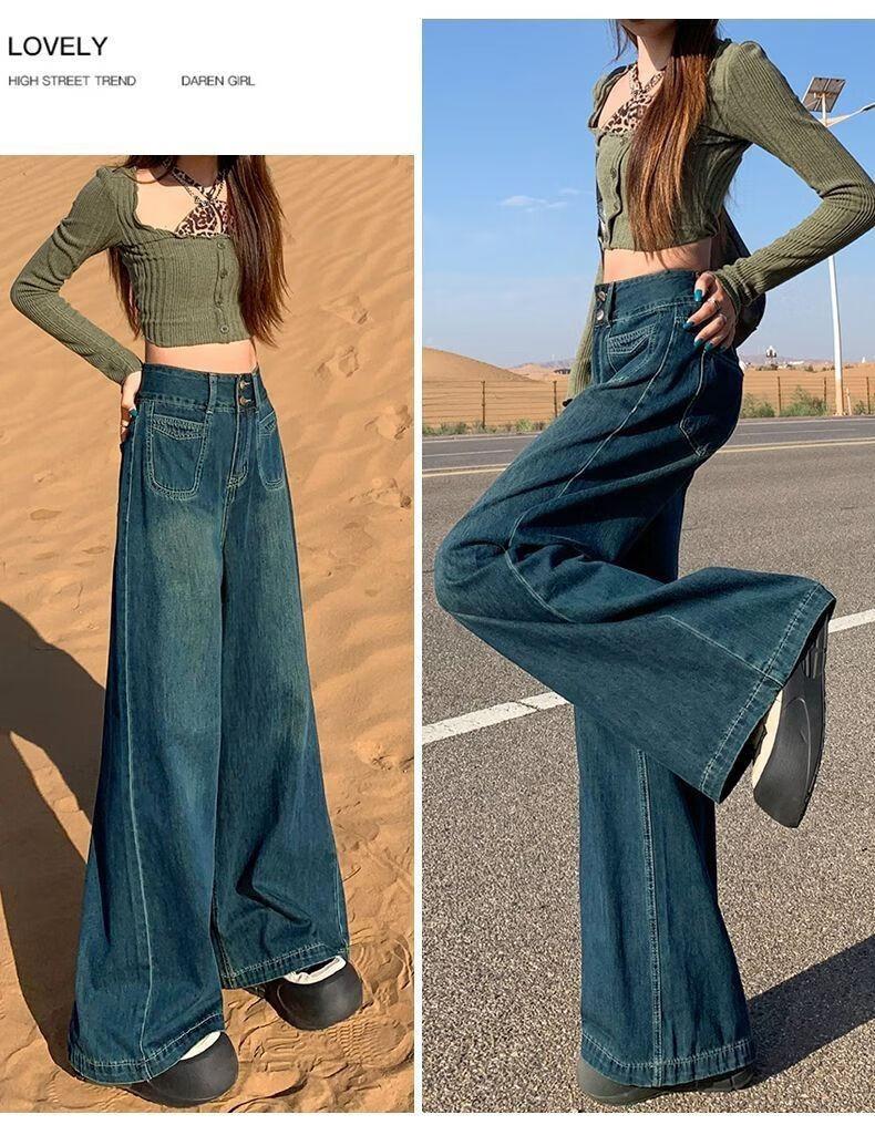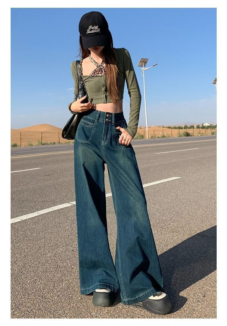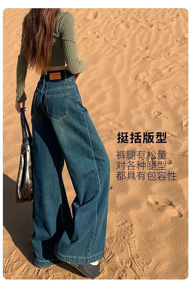 燠阳高腰阔腿牛仔裤女春秋季新款2025宽松显瘦遮胯大裤脚百搭拖地潮裤 2068深蓝色 M 【93-105斤】
