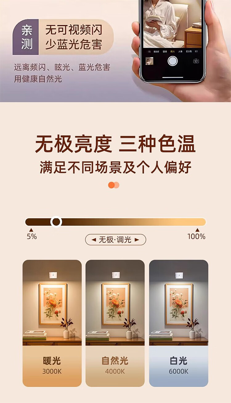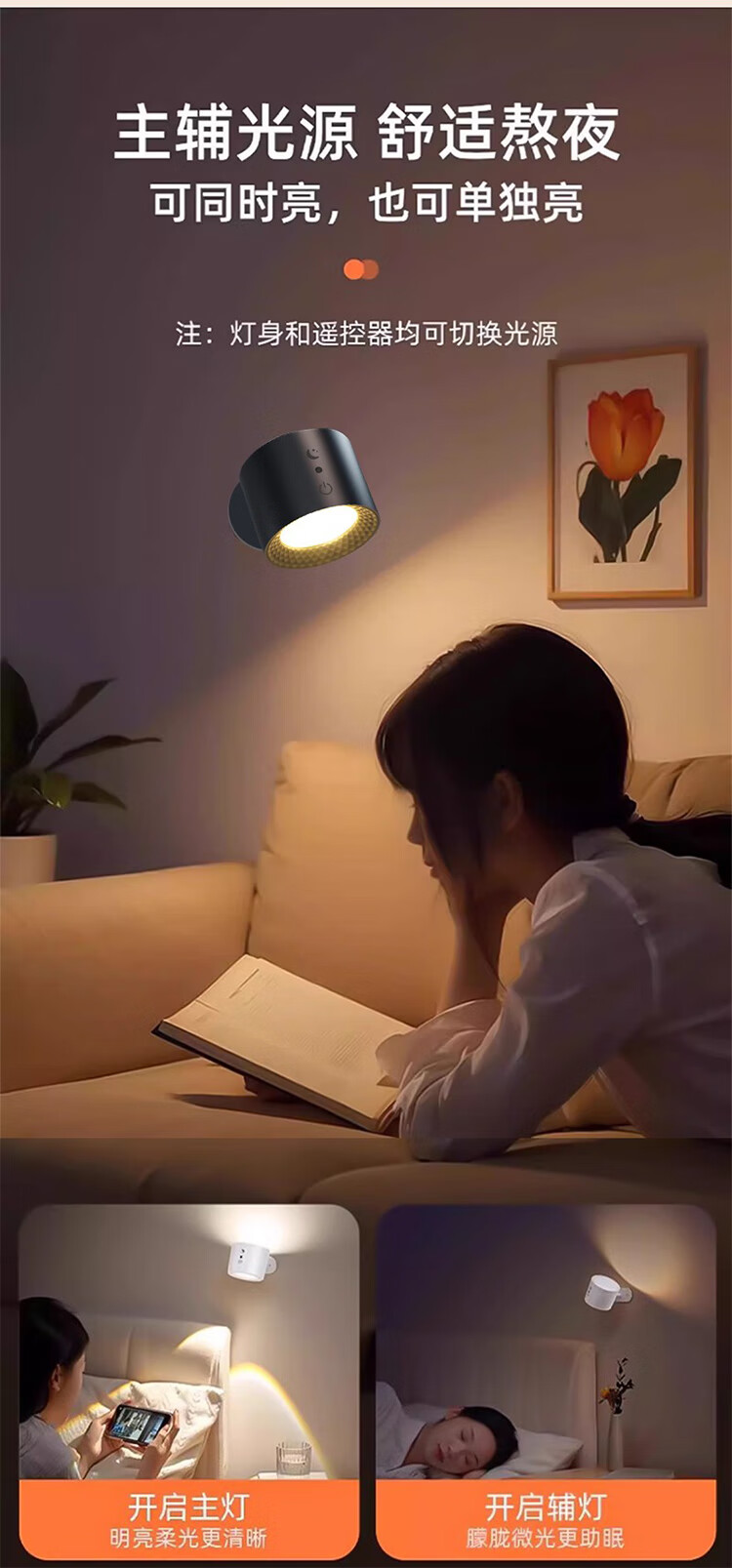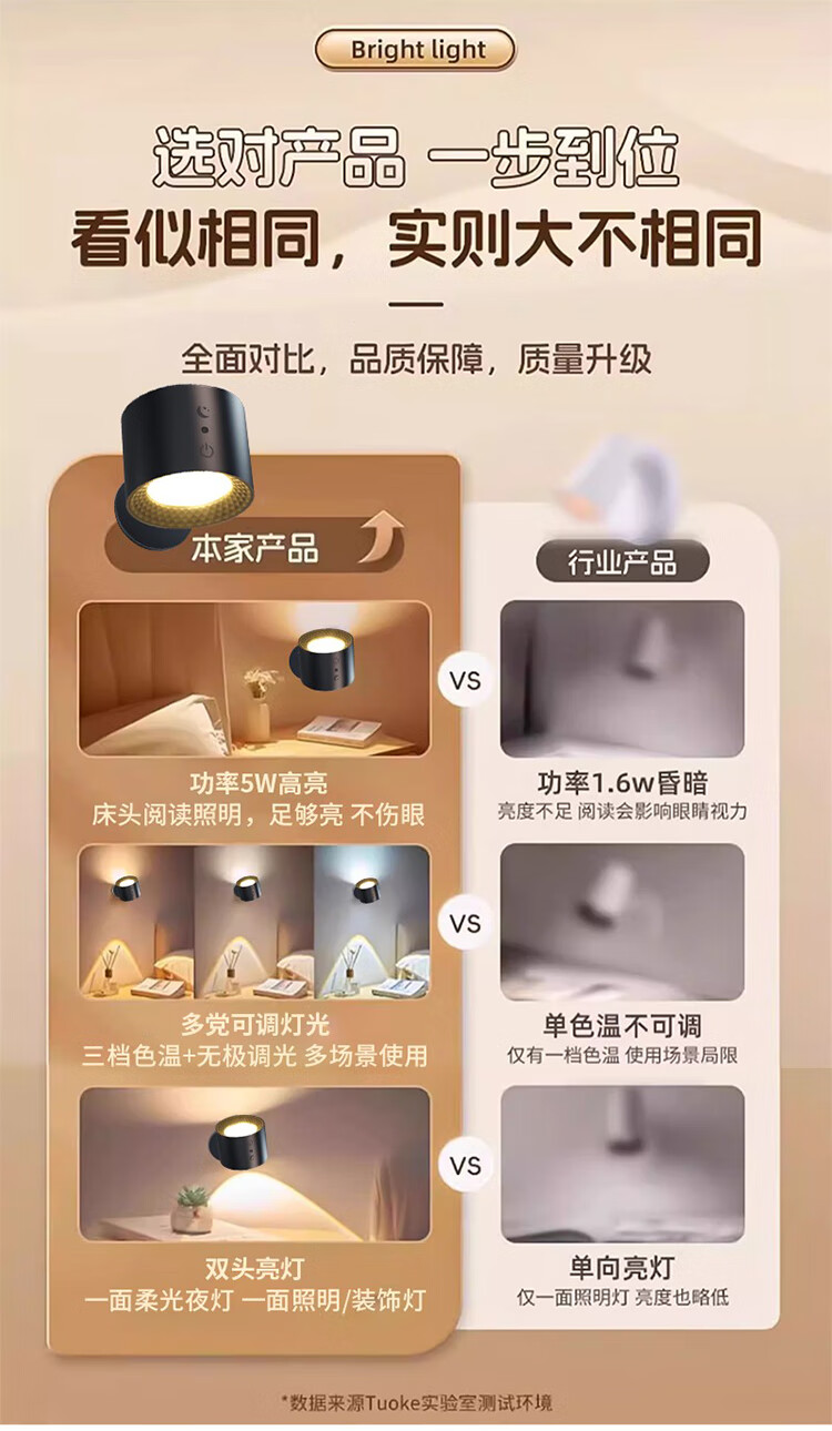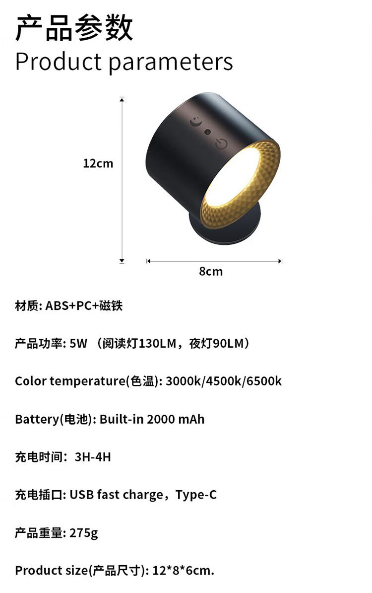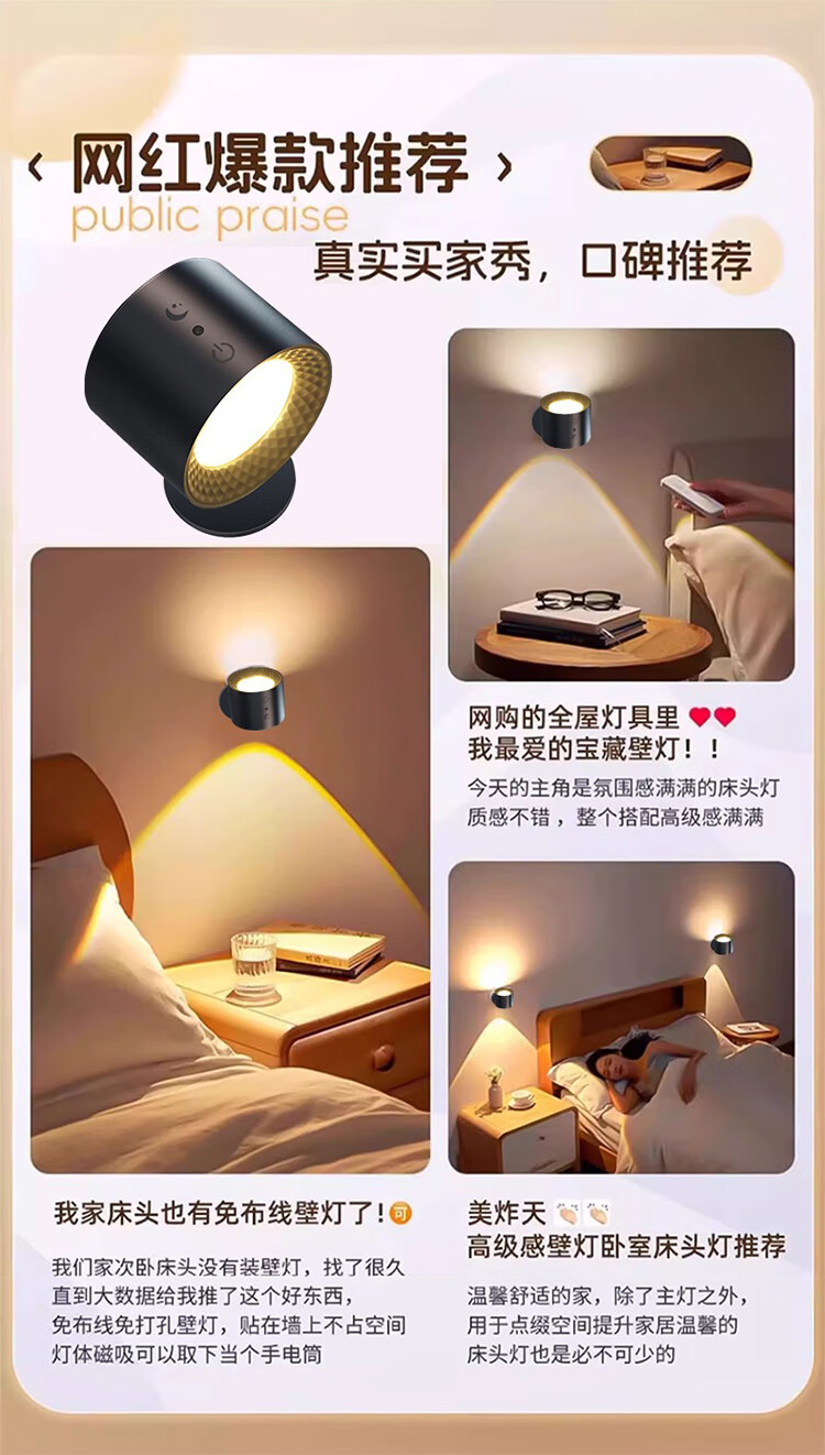 筏芯德国充电磁吸壁灯免接线免布线双头无线免打孔卧室床头阅读墙壁灯 双头黑色款·磁吸底座