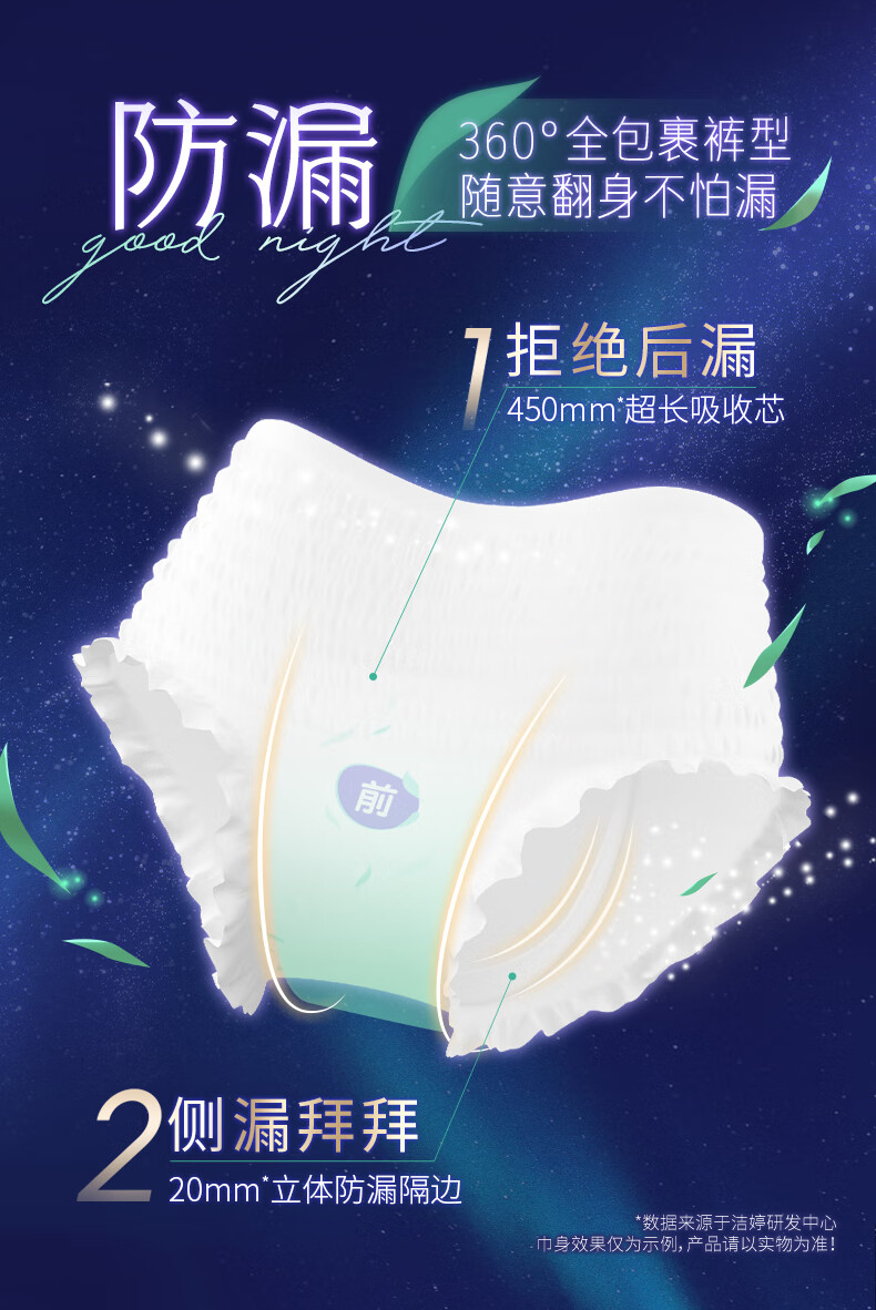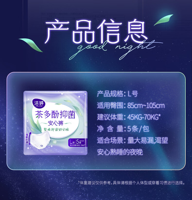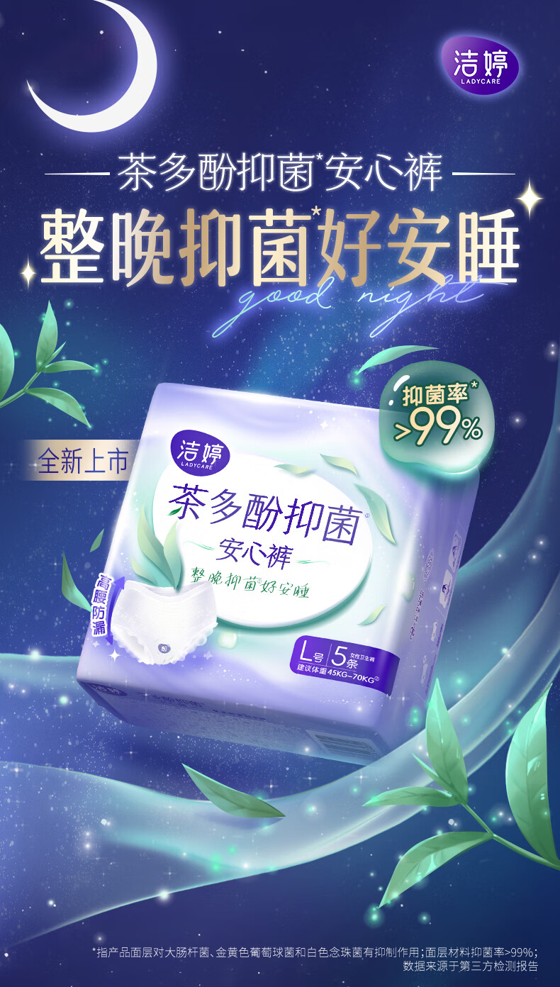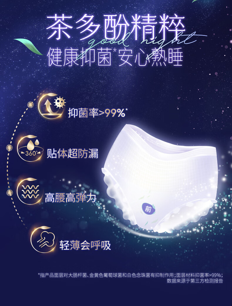 洁婷茶多酚抑菌安睡裤高腰防漏透气夜用大码卫生巾安心裤拉拉裤 L 24条 100-140斤 16条抑菌裤+8片卫生巾