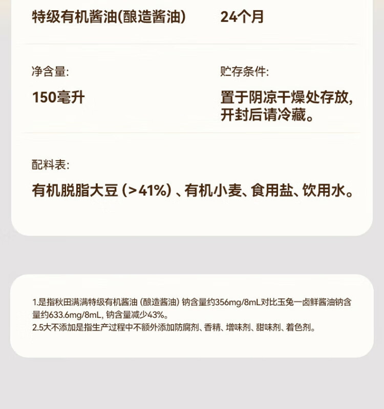 秋田满满有机酱油 宝宝调味品 减钠酱油享婴幼儿辅食谱 有机酱油150mL*2