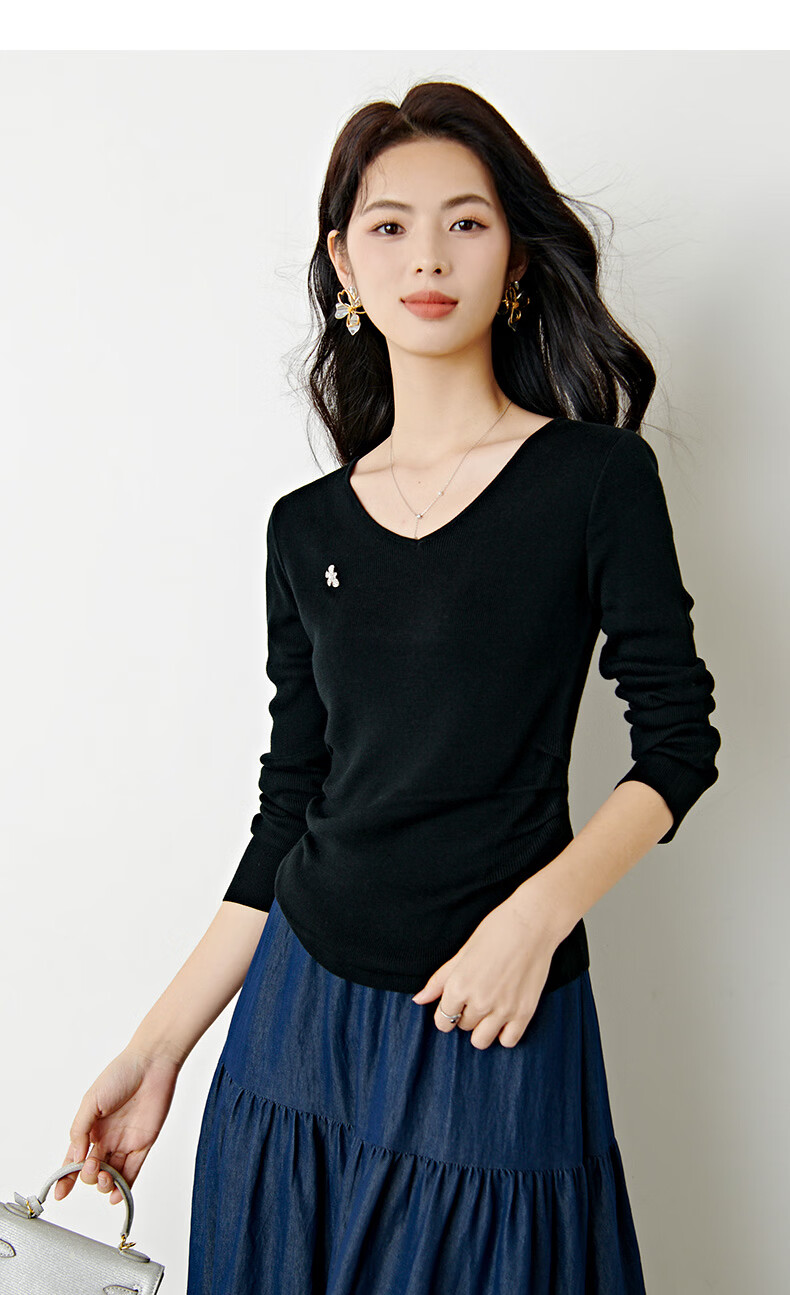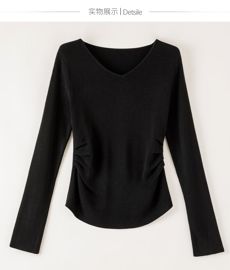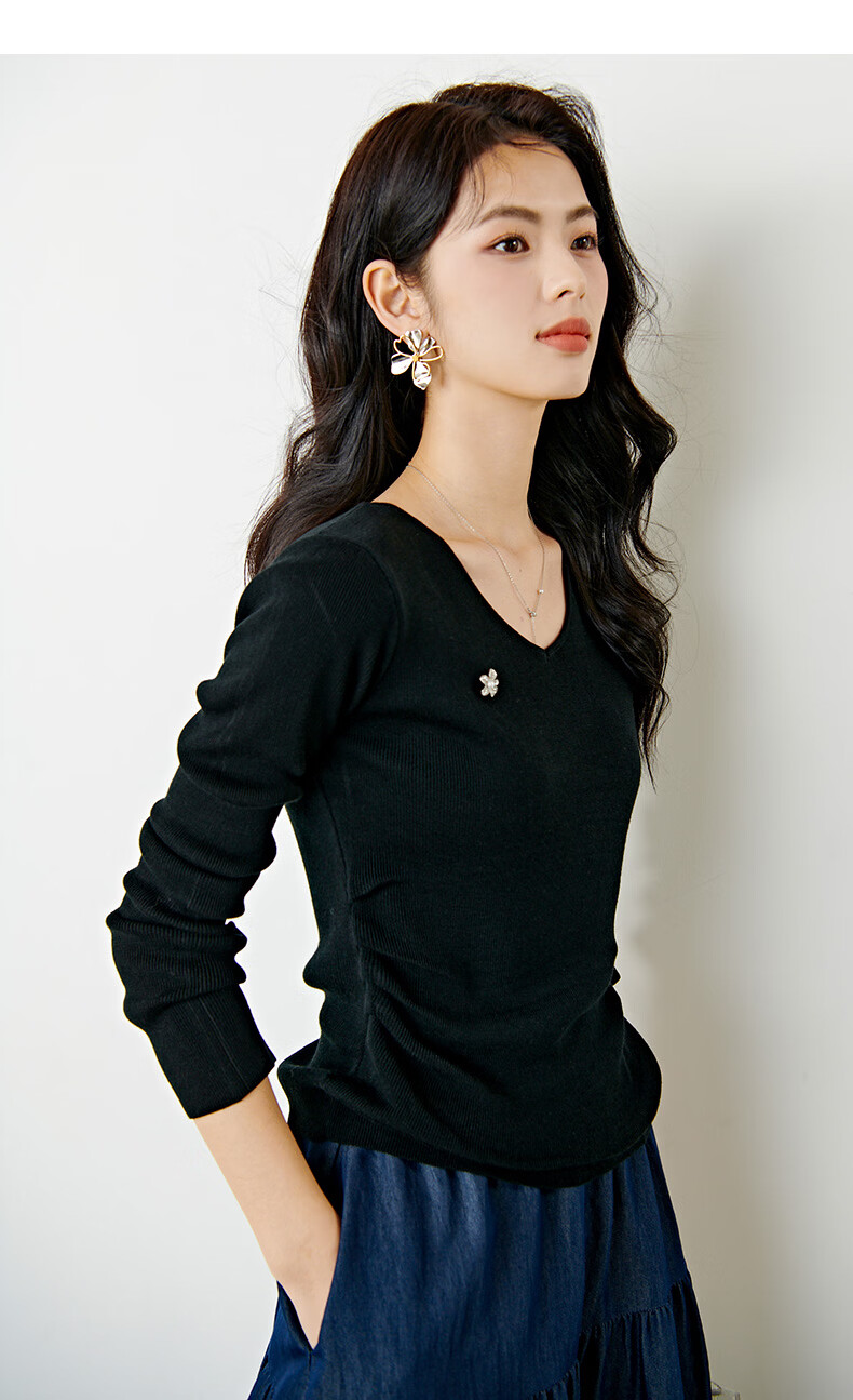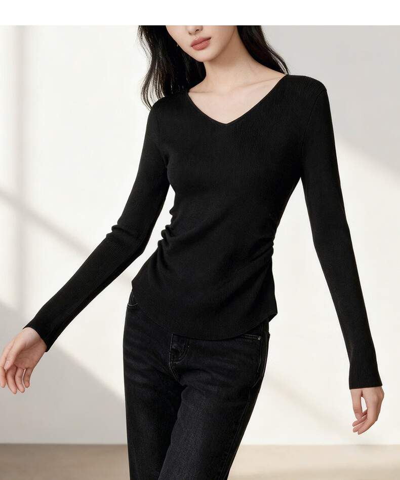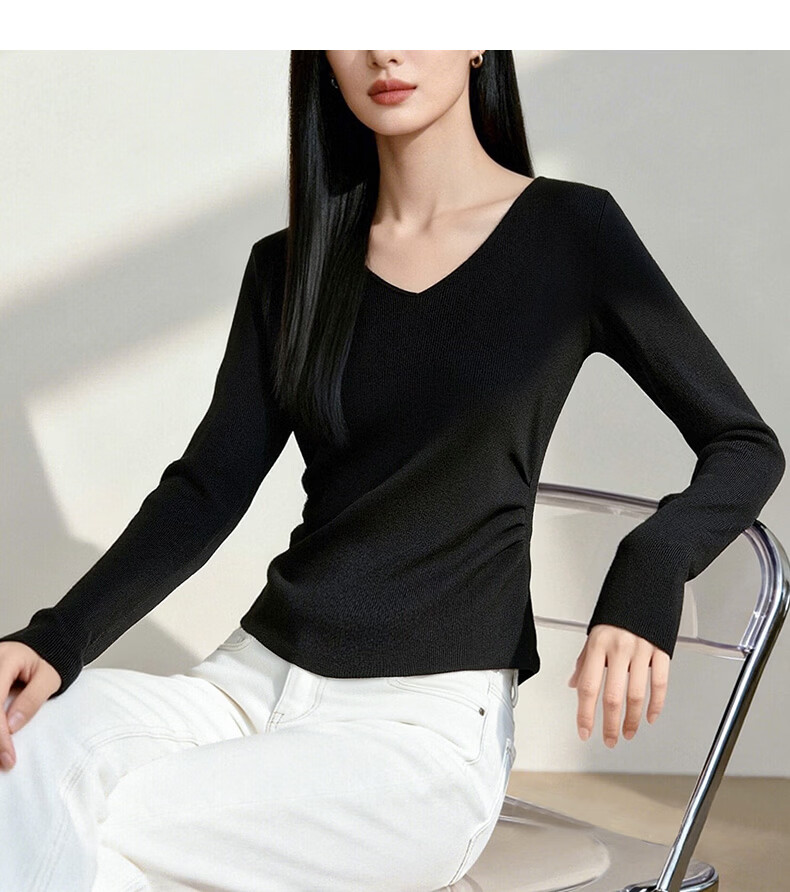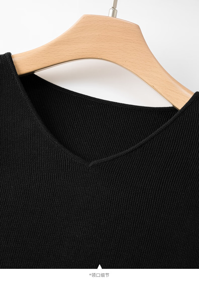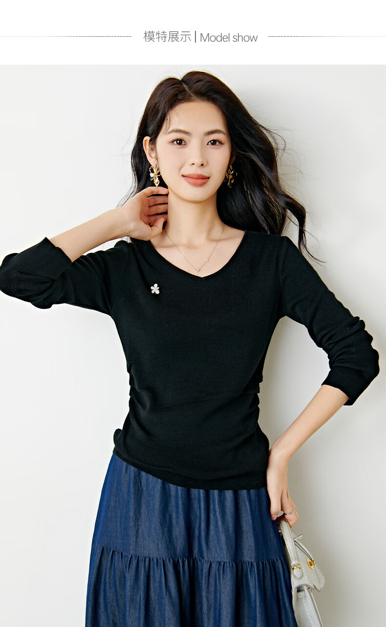 晚白【专享】2026年春款经典V领毛衣亲肤柔软褶皱修身针织衫女 黑色 L