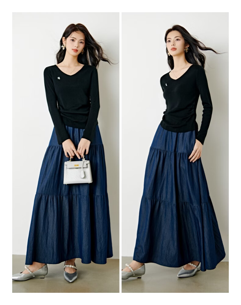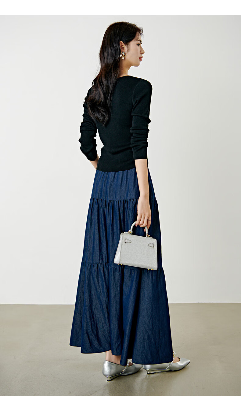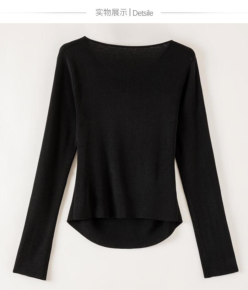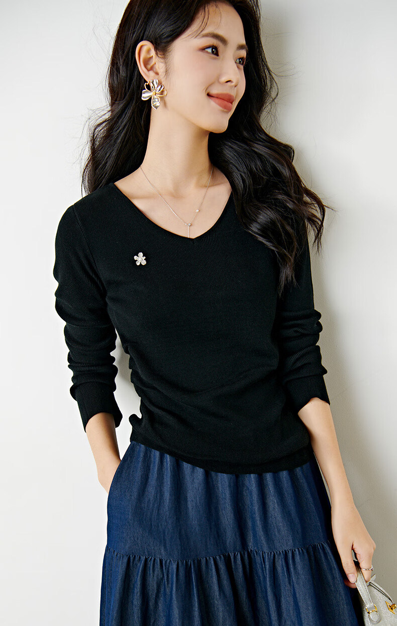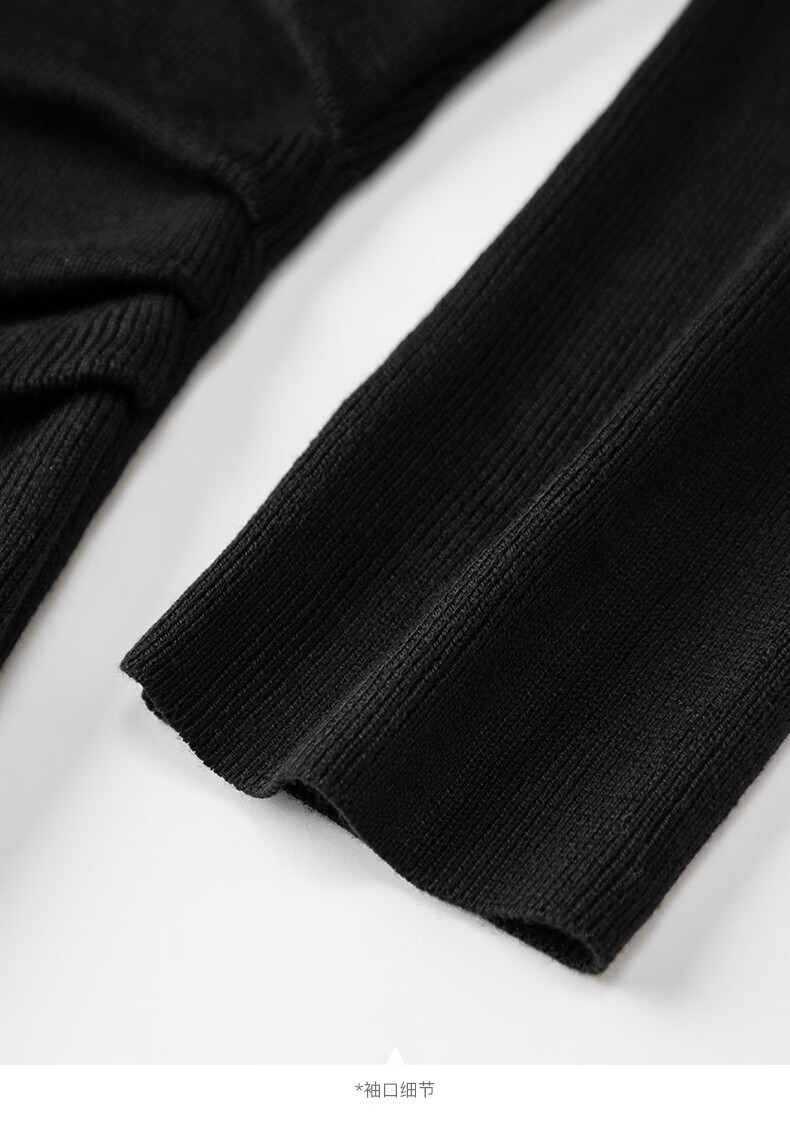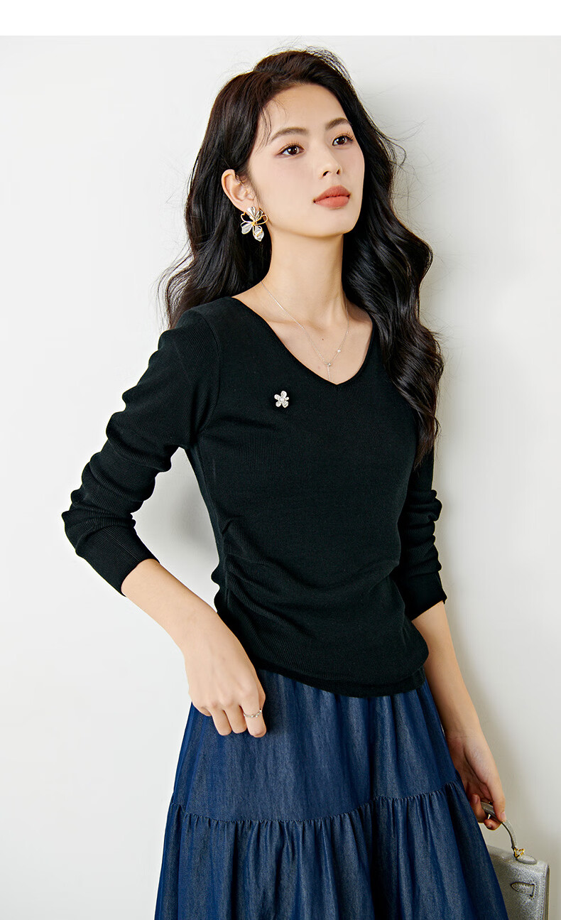 晚白【专享】2026年春款经典V领毛衣亲肤柔软褶皱修身针织衫女 黑色 L
