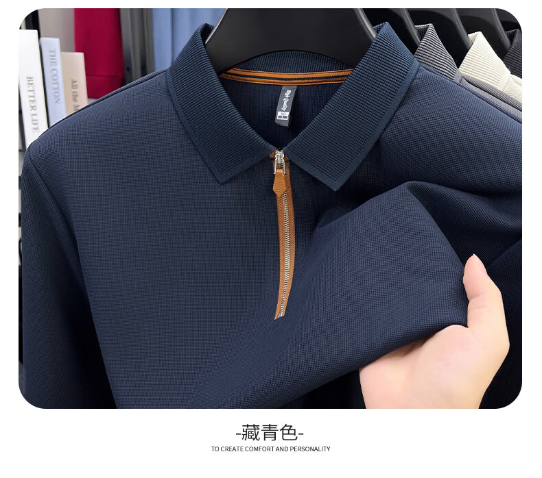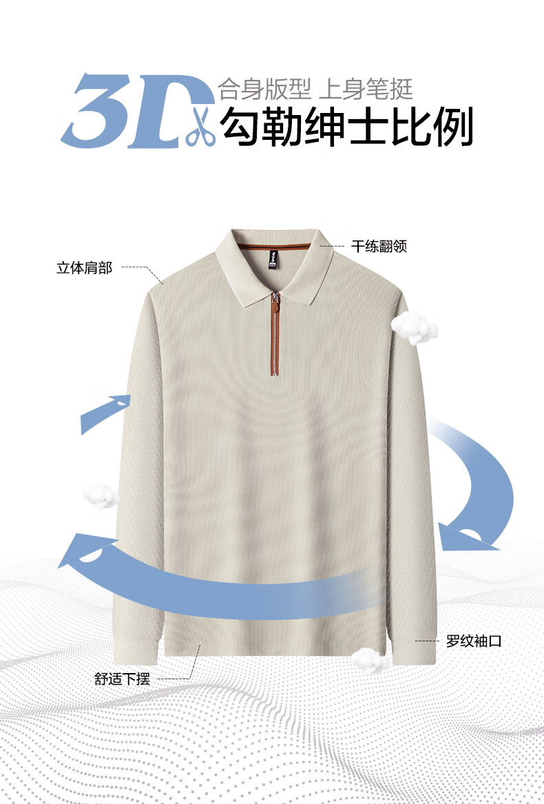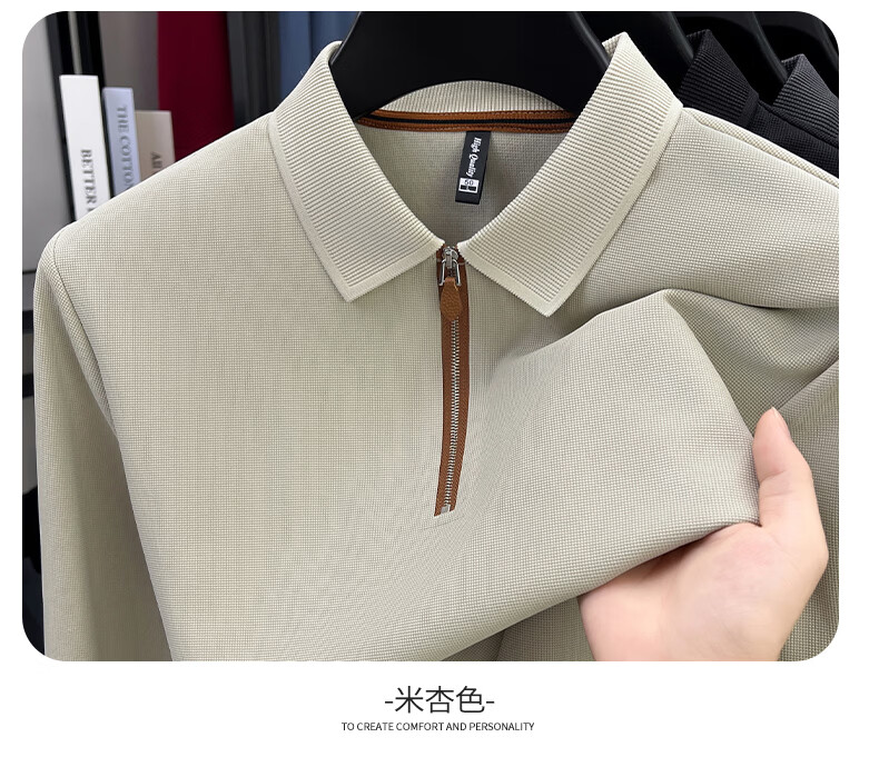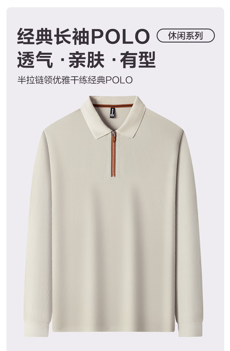 SHANSHAN杉杉长袖T恤男春季新款纯色半拉链领男士打底Polo商务休闲男上衣 米杏色 L /175