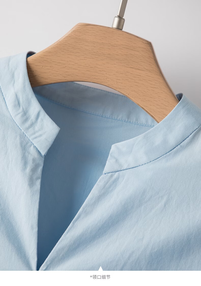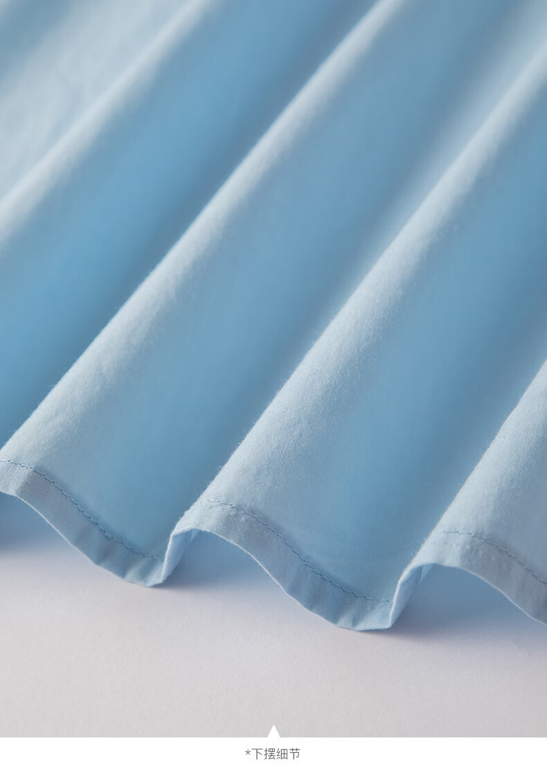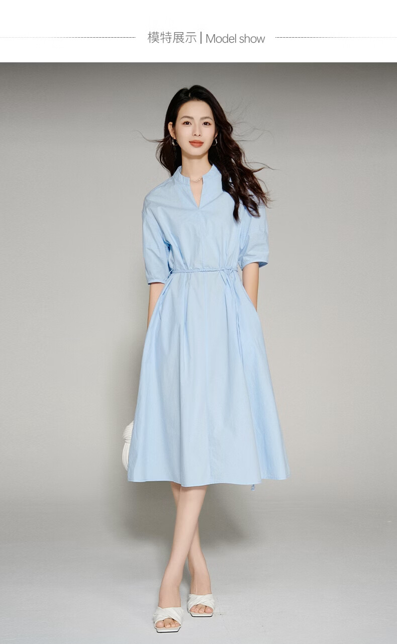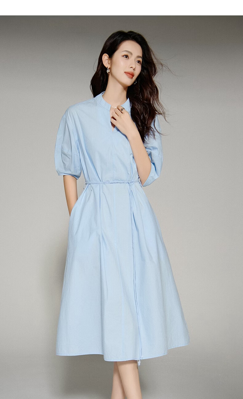 晚白【新品】2026年春款V领全棉中袖裙子宽松遮肉系带收腰连衣裙 天蓝色 S