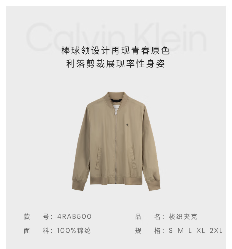 Calvin KleinJeans春秋男士经典商务通勤ck休闲挺括棒球领飞行员夹克外套