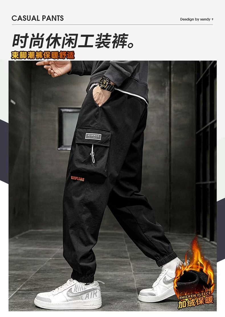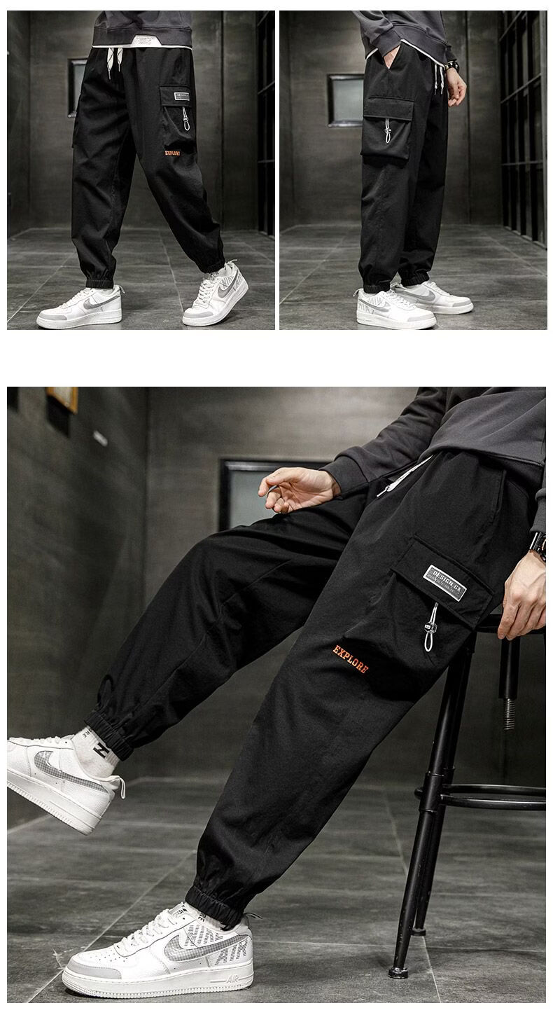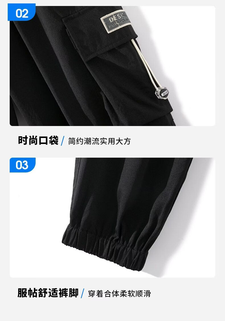 啄木鸟加肥加大工装裤男生夏季潮宽松束脚大码冲锋裤休闲运动长裤 黑色 M