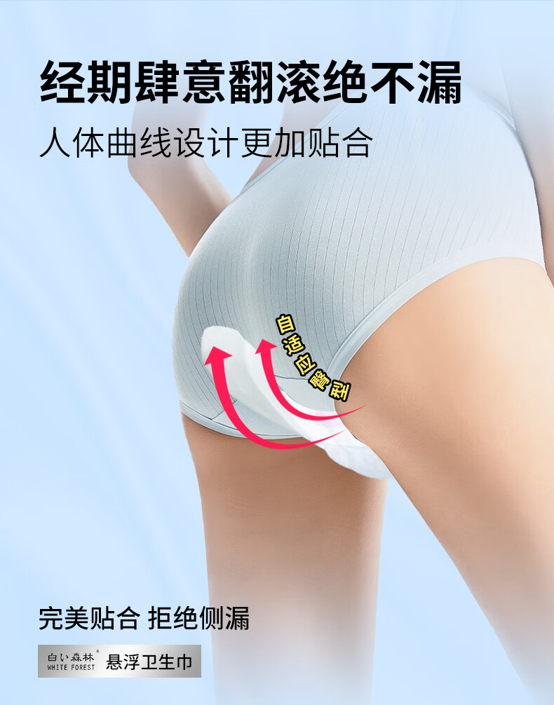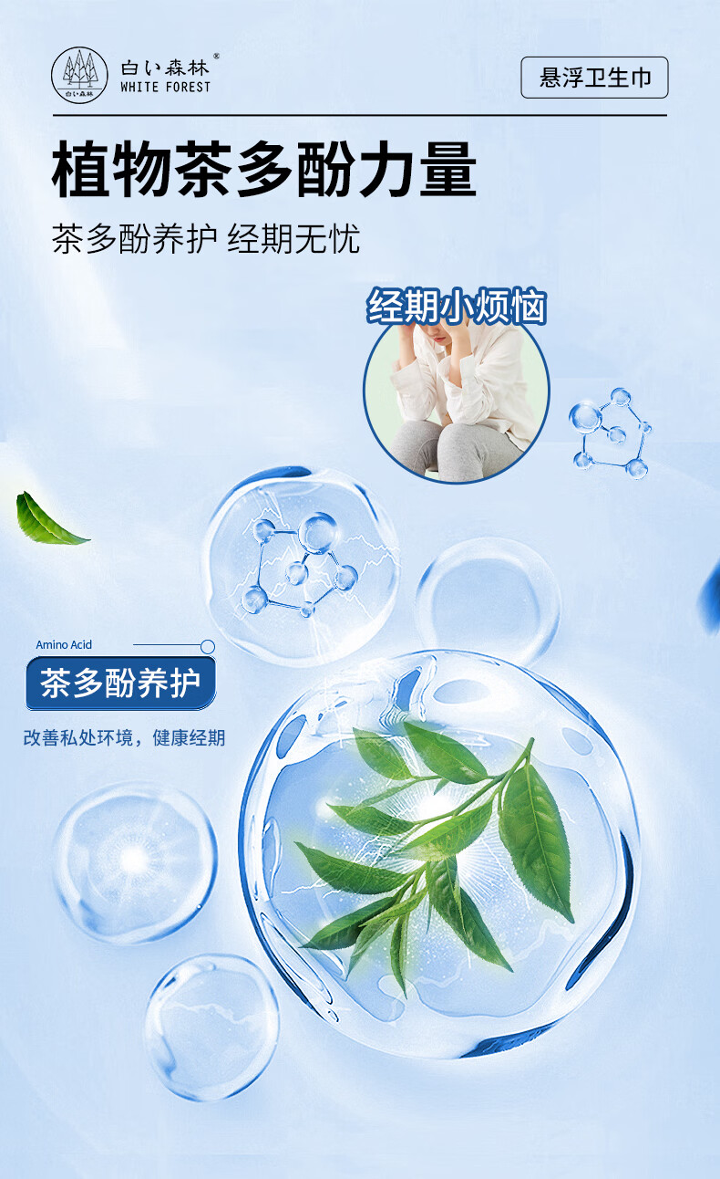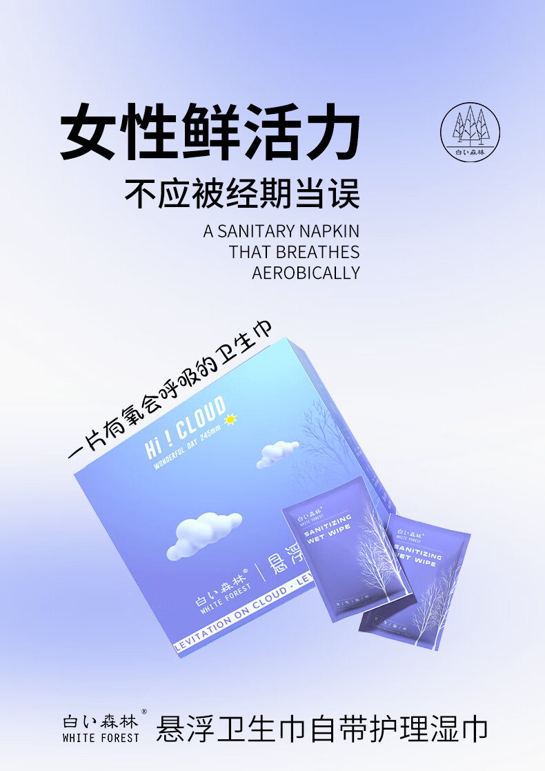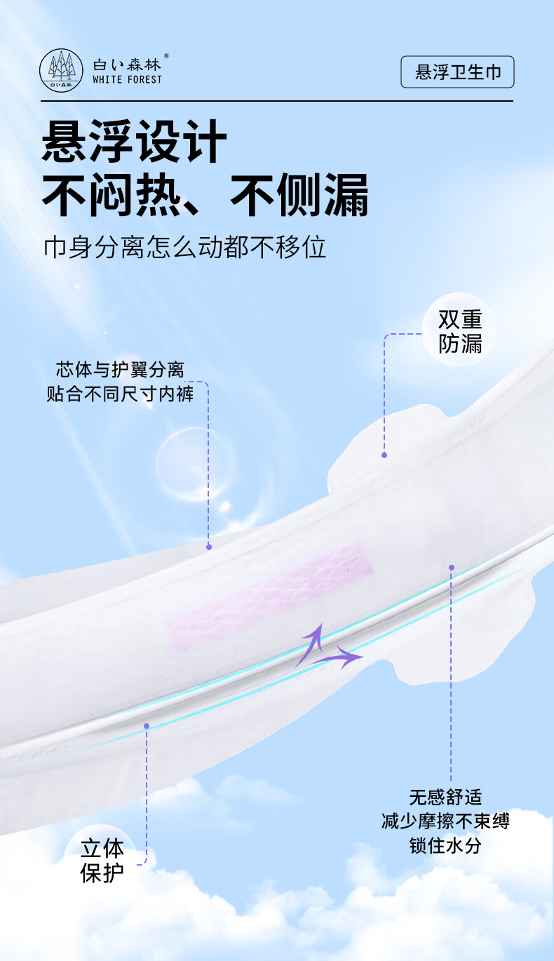 白森林(white forest)茶多酚悬浮卫生巾轻薄透气量大防侧漏无感不闷姨妈巾日夜组合 1护3日1夜1加长【共65片】+湿巾35片