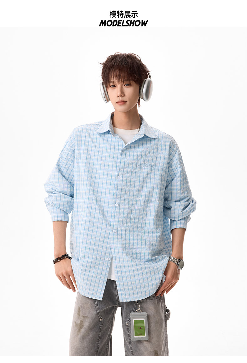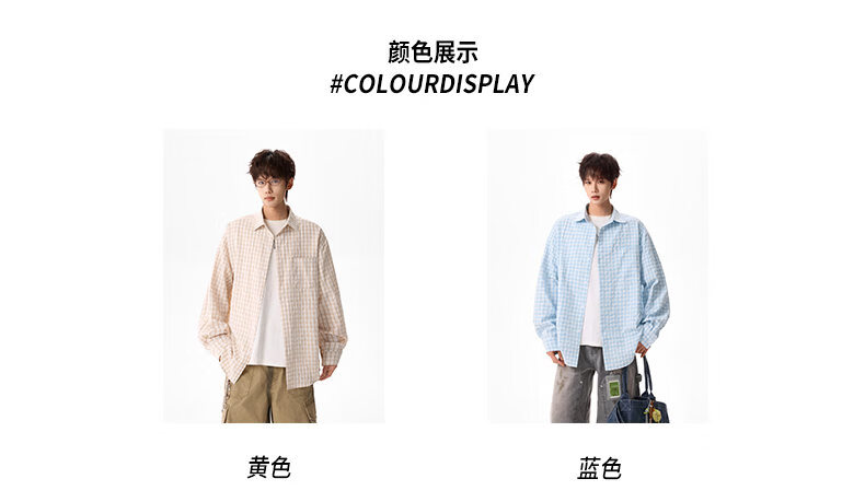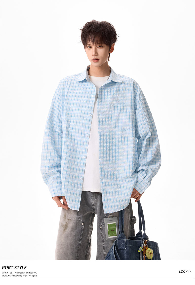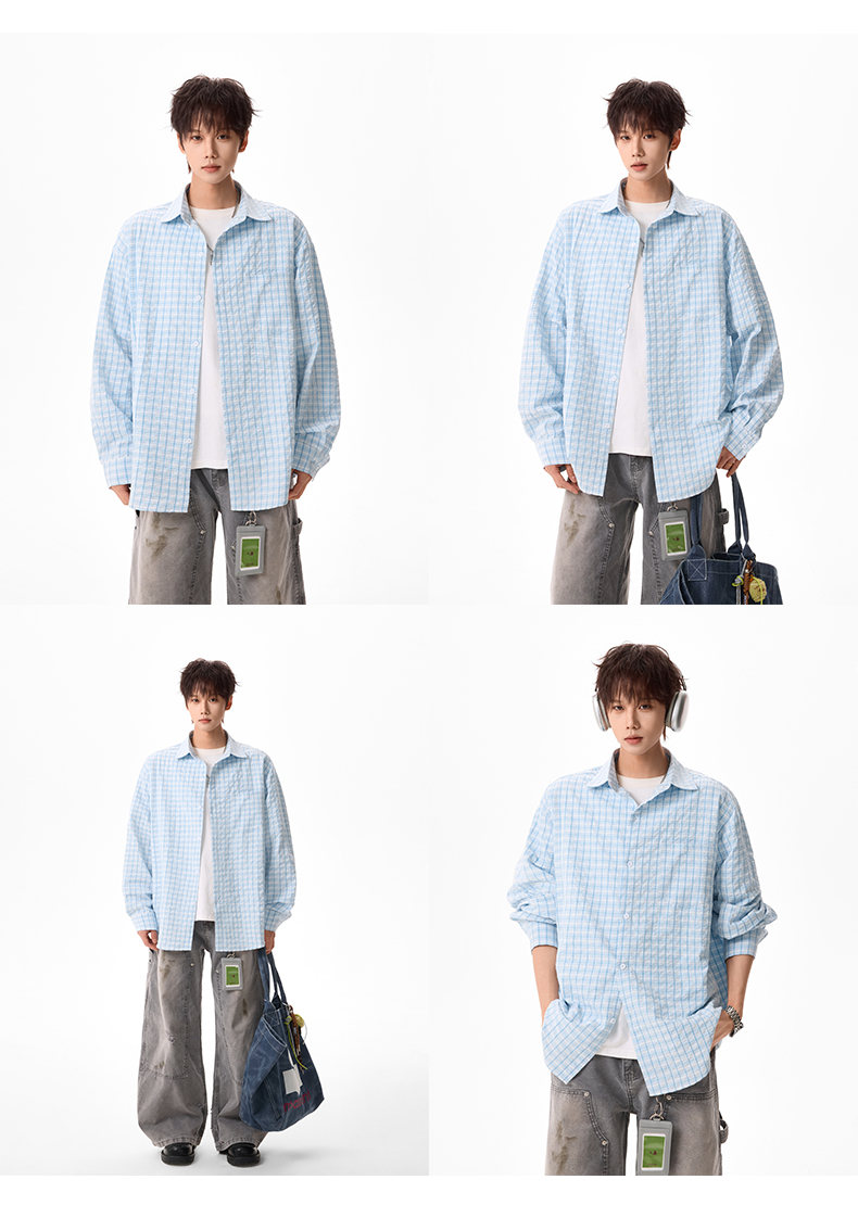 NEW OR MODE美式格纹撞色长袖衬衫男女春夏季潮牌宽松简约慵懒感大码衬衣外套 蓝色【高品质】 M 【建议90-110斤】