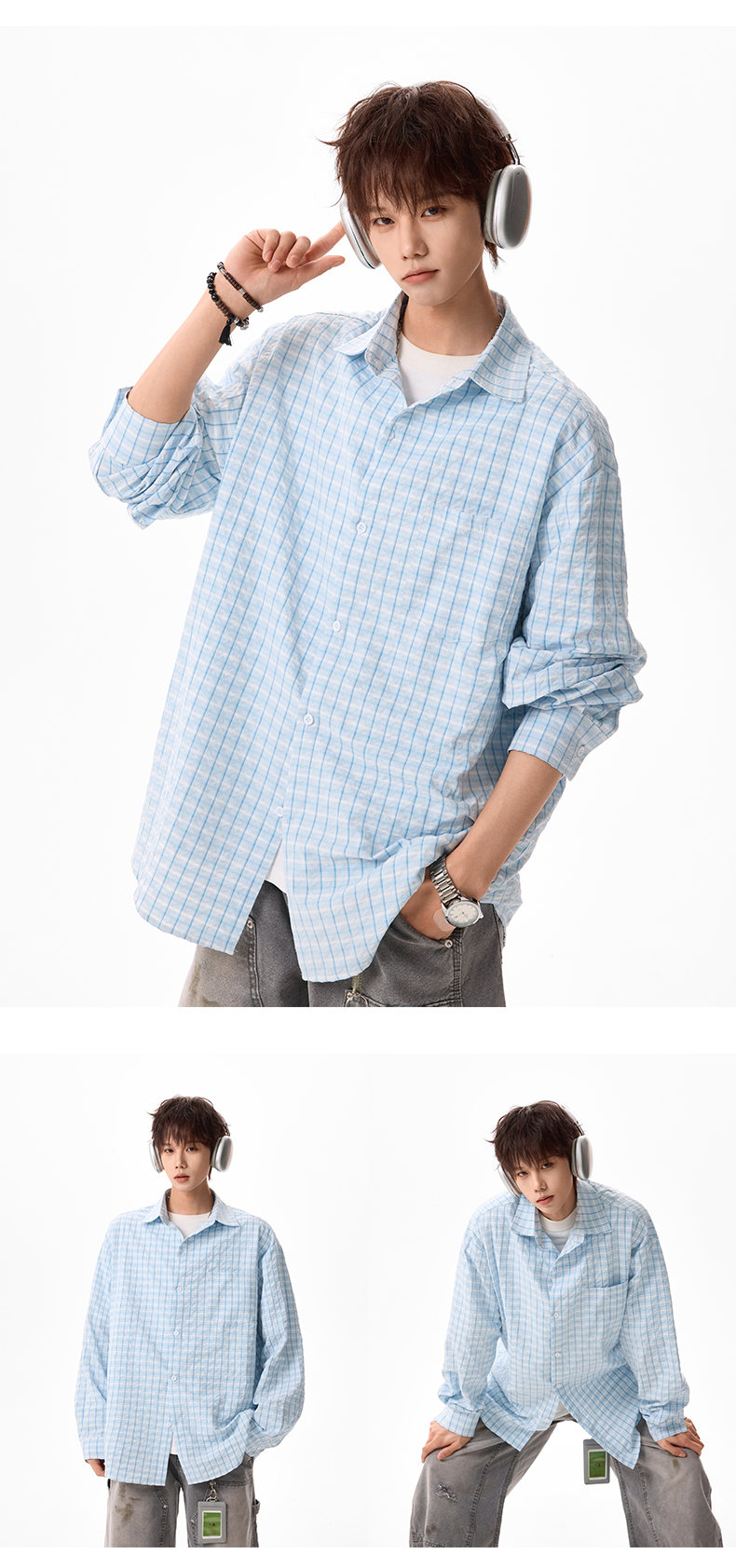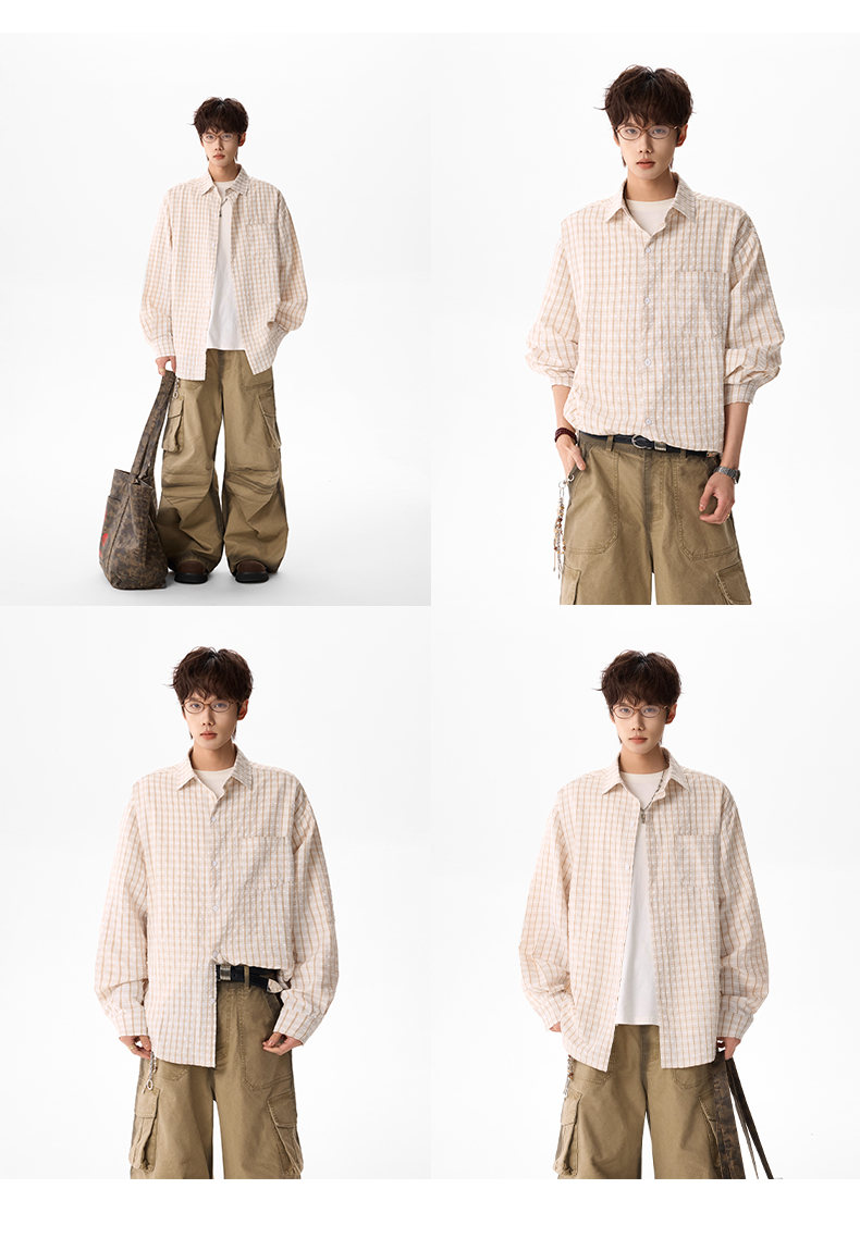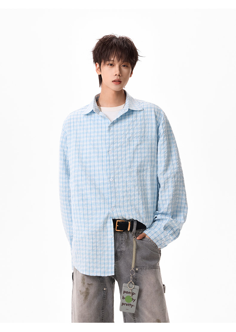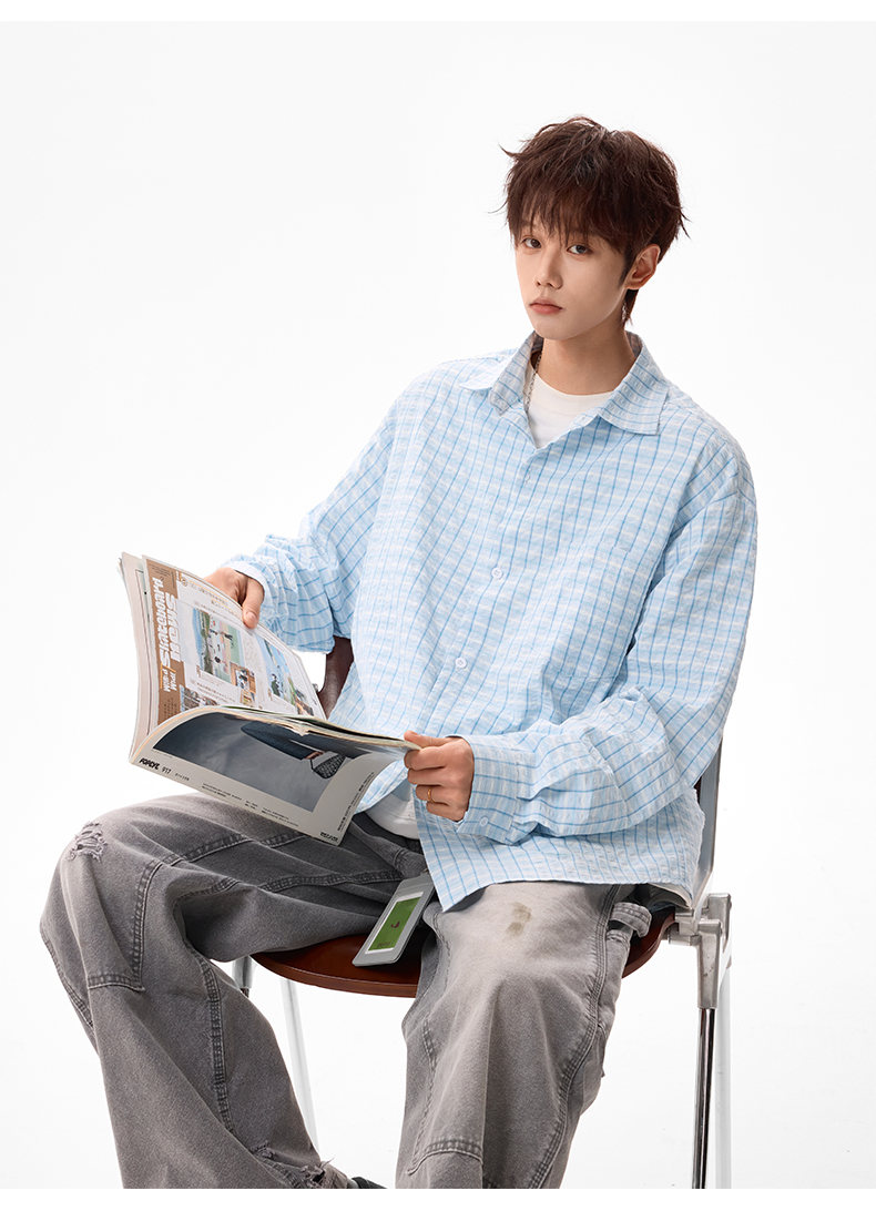NEW OR MODE美式格纹撞色长袖衬衫男女春夏季潮牌宽松简约慵懒感大码衬衣外套 蓝色【高品质】 M 【建议90-110斤】