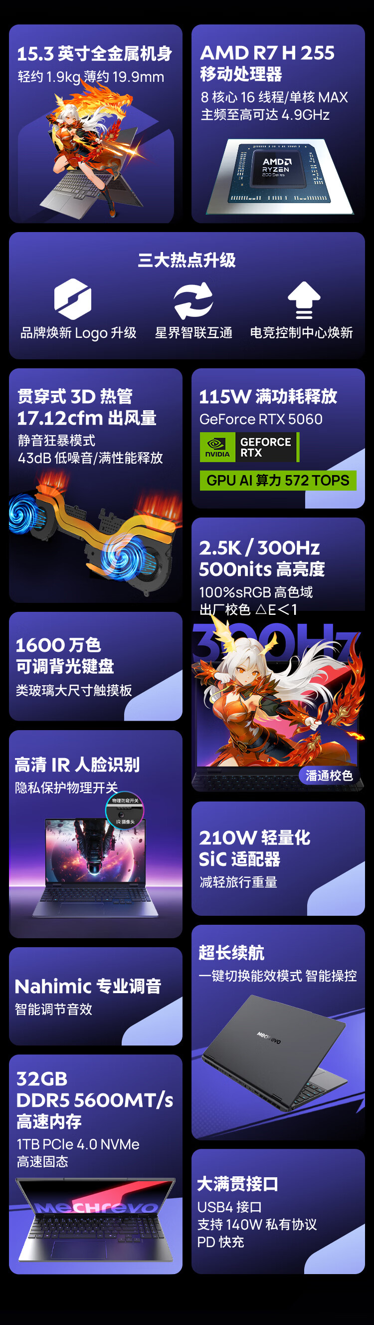 机械革命【国家补贴】翼龙15 Pro 2026 轻薄游戏笔记本电脑(R7 H 255 32G 1T RTX5060 2.5K 300Hz 99Wh灰)