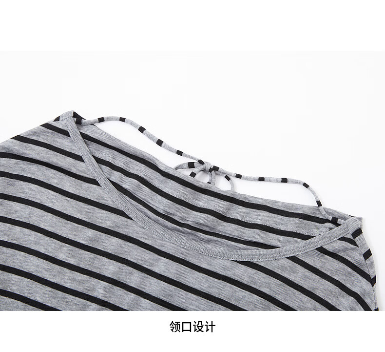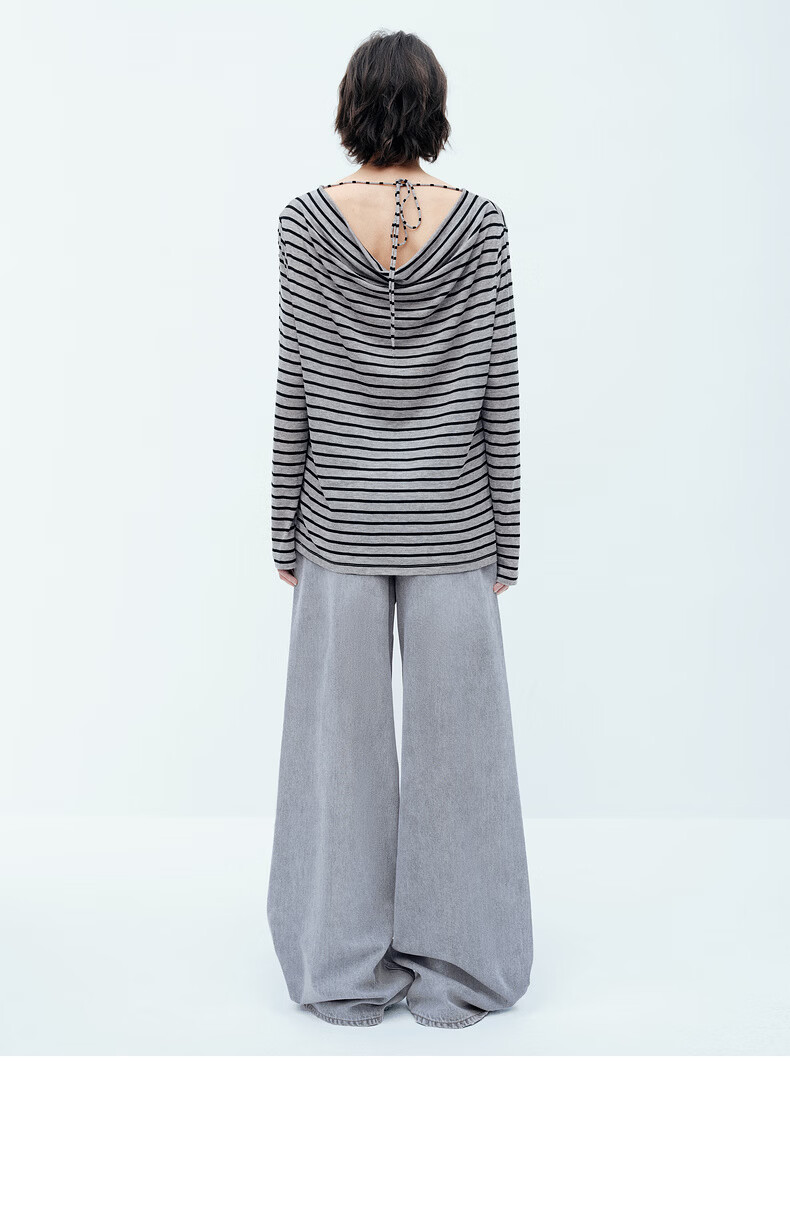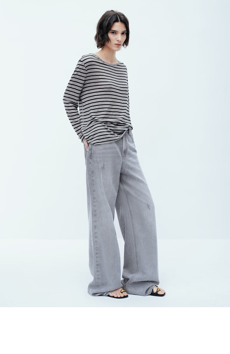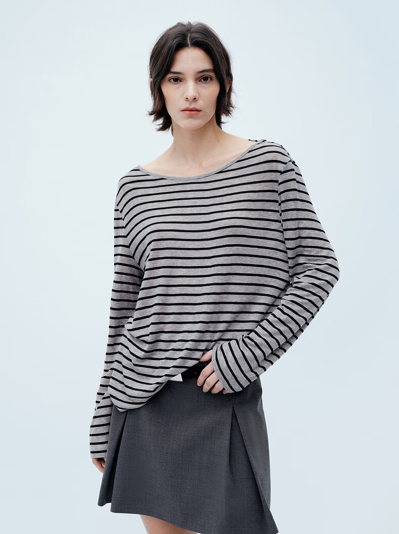 H's【莱赛尔】条纹罩衫T恤女26夏季新款高级感长袖内搭打底衫上衣 灰底条纹 L