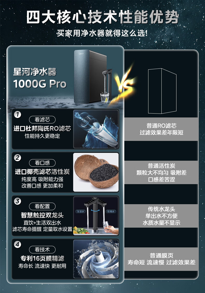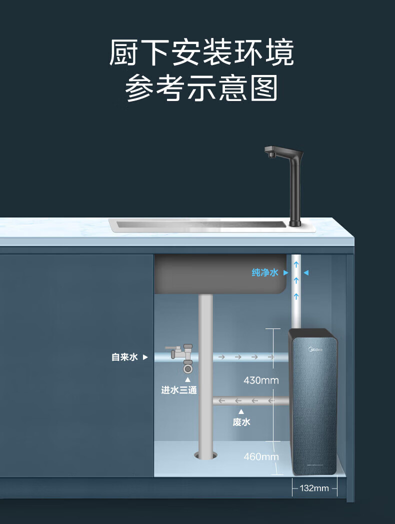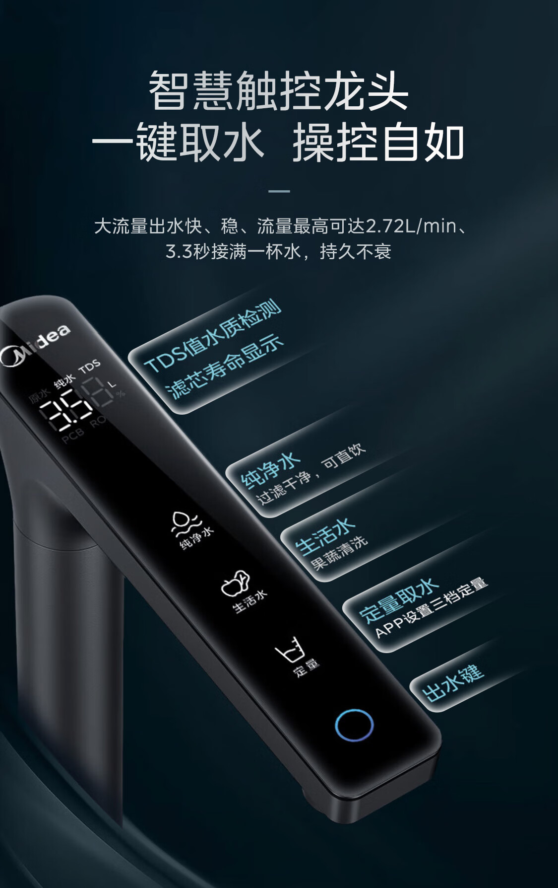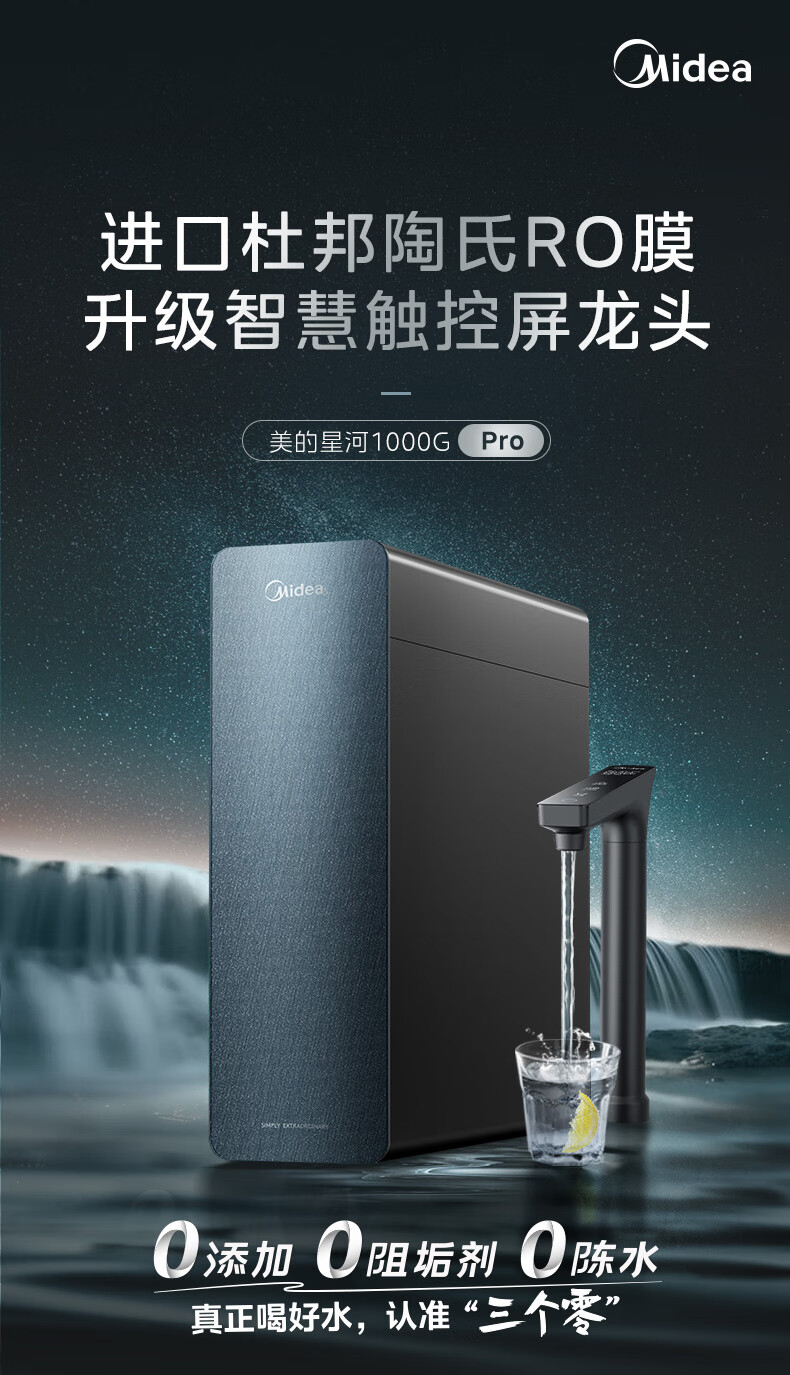 美的(Midea)净水器家用星河1000G PRO 5年长效陶氏RO反渗透0阻垢剂直饮机厨下式净饮机国家补贴 鲜活零陈水