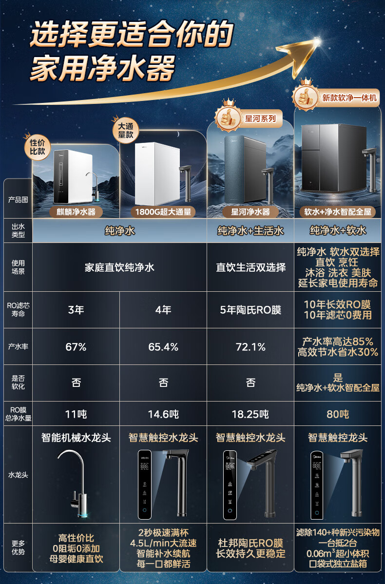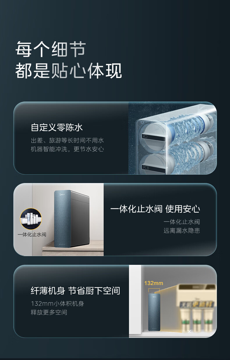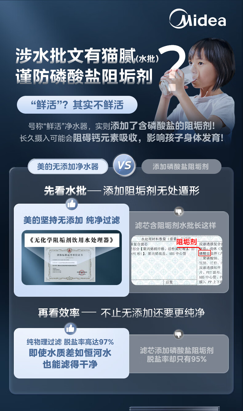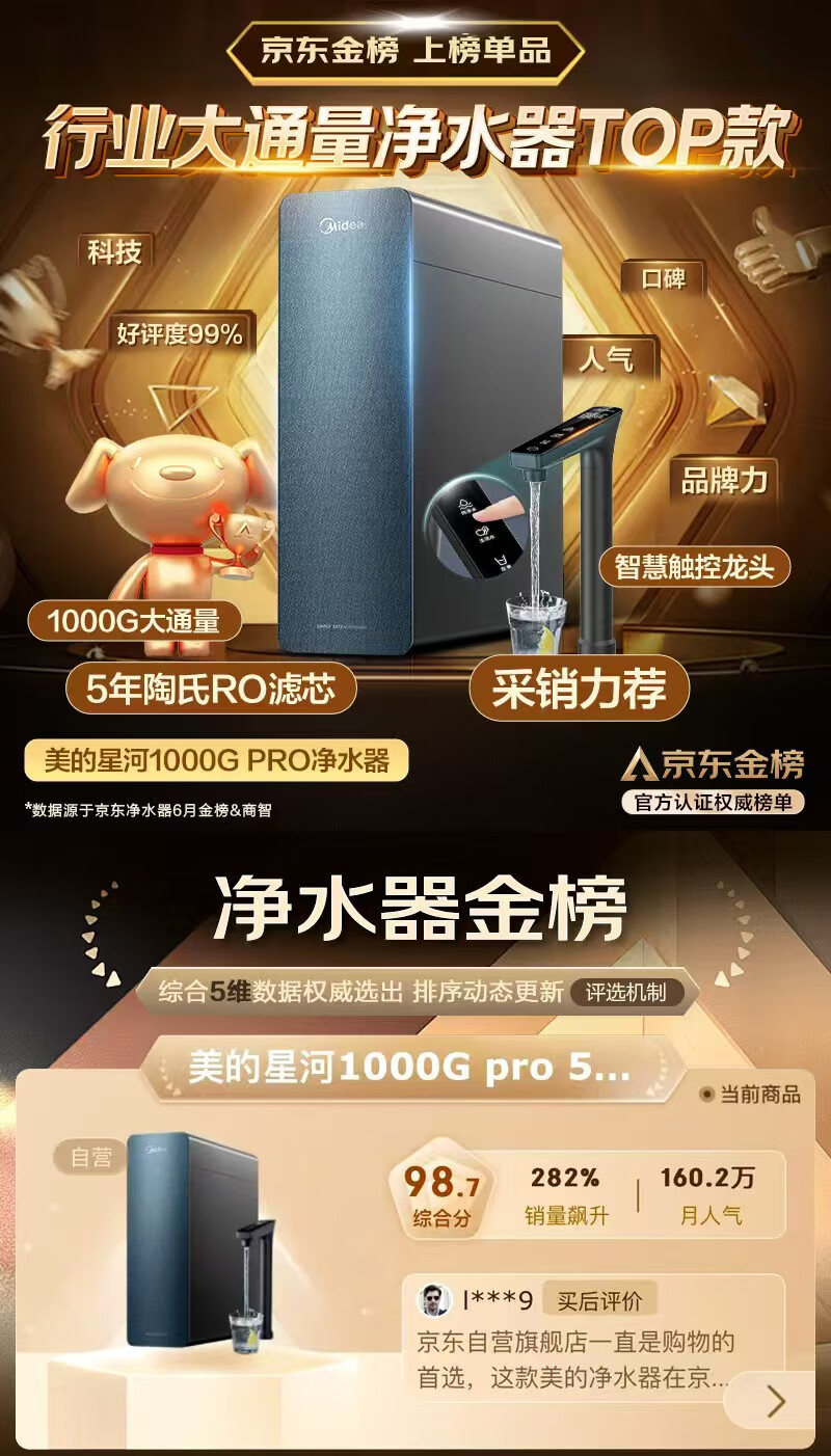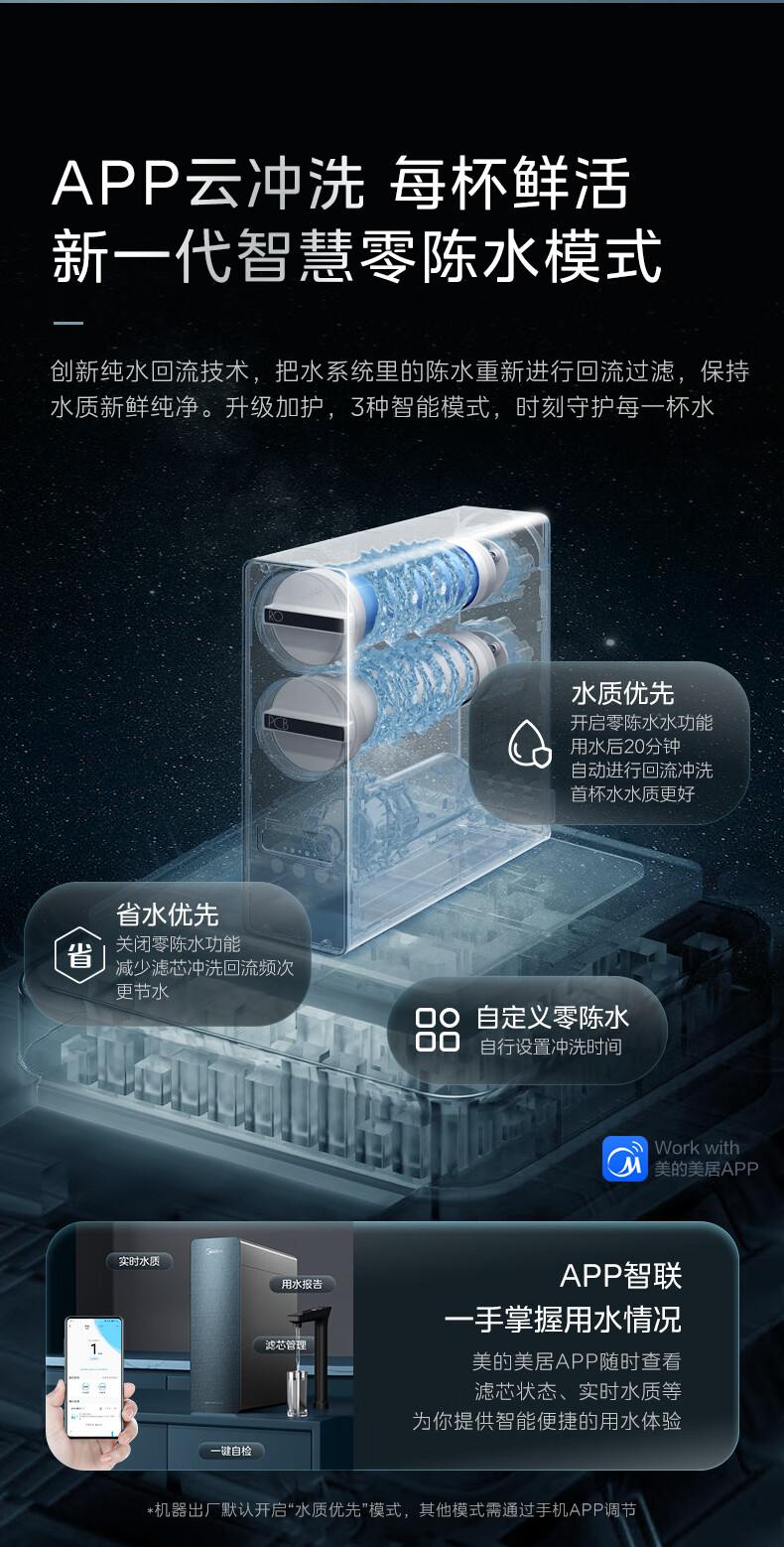 美的(Midea)净水器家用星河1000G PRO 5年长效陶氏RO反渗透0阻垢剂直饮机厨下式净饮机国家补贴 鲜活零陈水