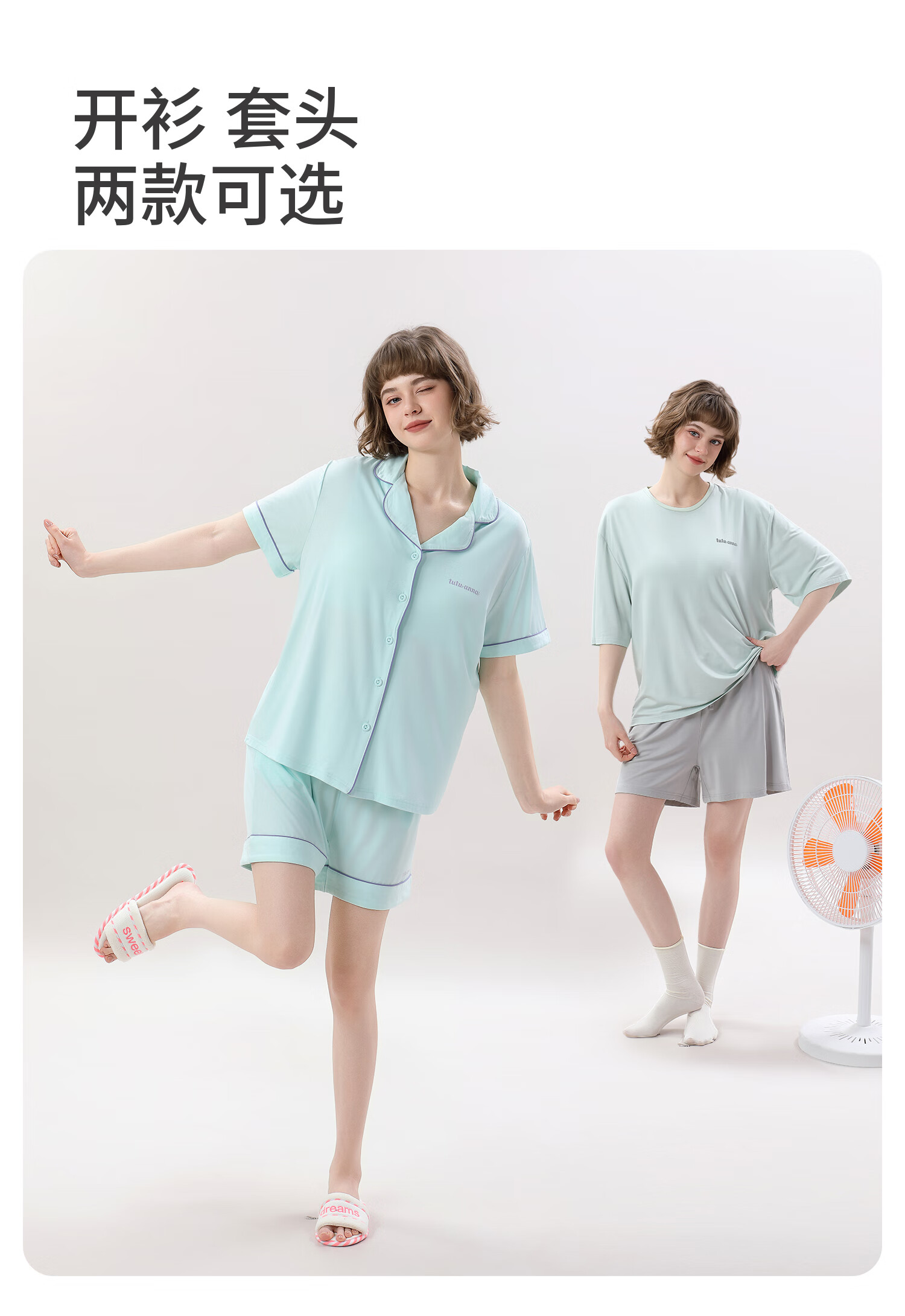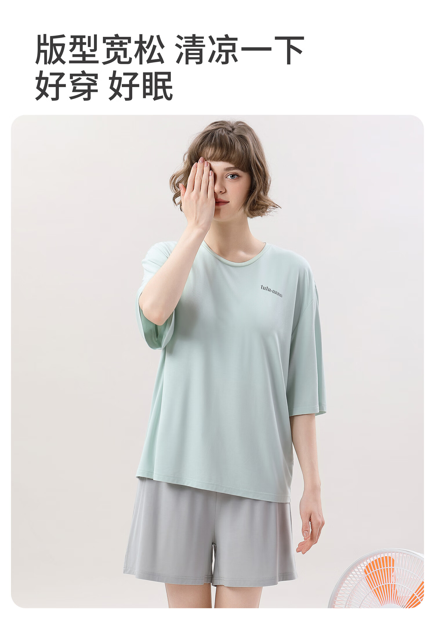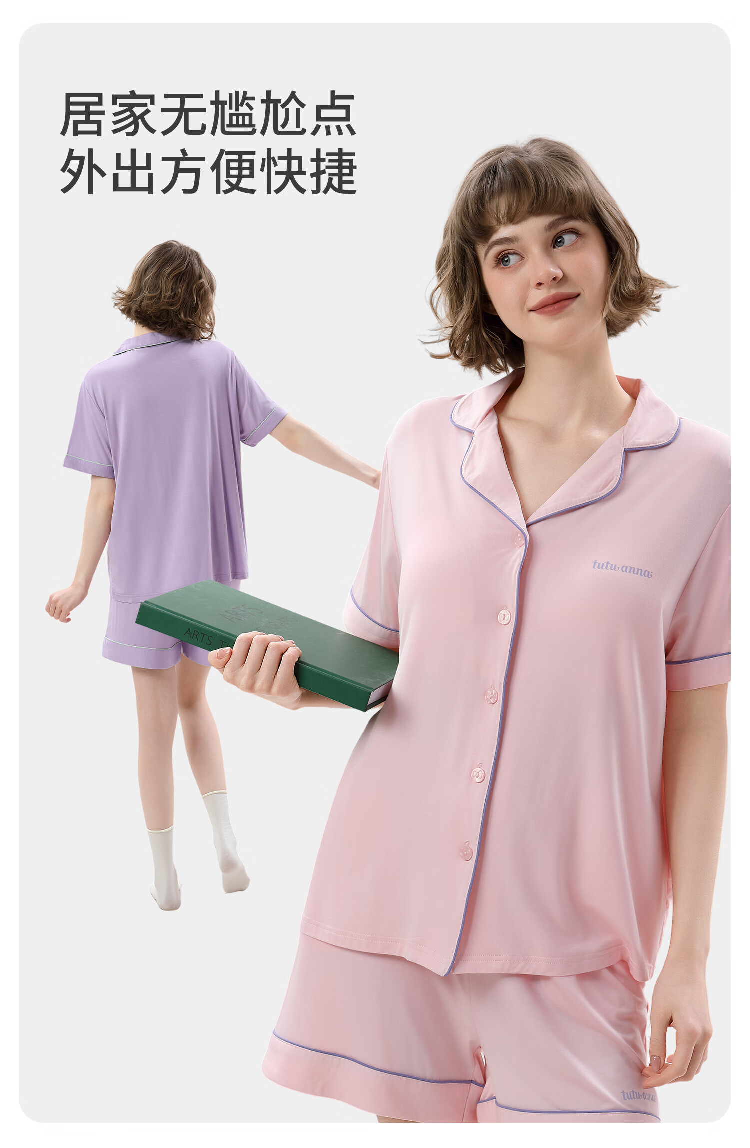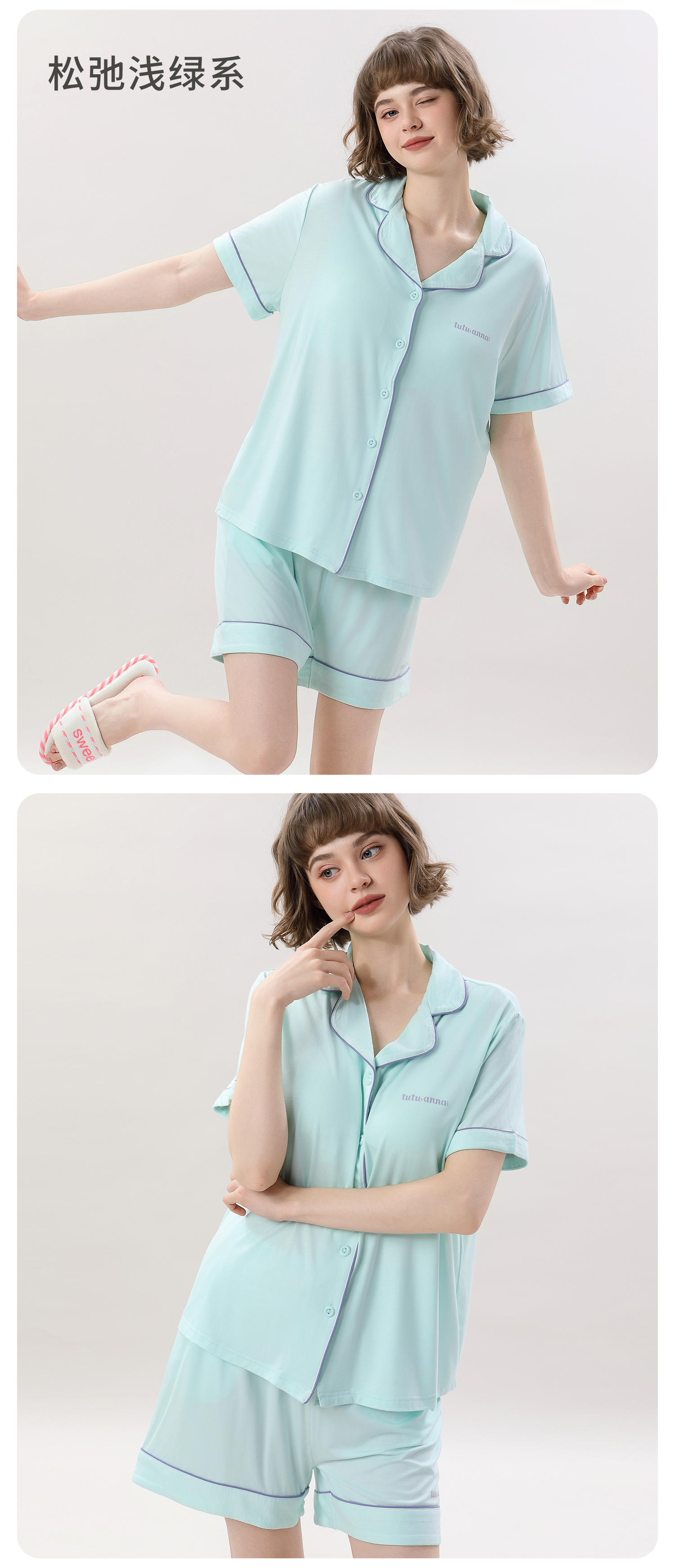 tutuanna春夏睡衣女 带胸垫一体杯纯色短袖短裤透气家居服套装女 【开衫款】蓝色 M (适合身高160-165cm)