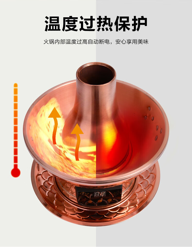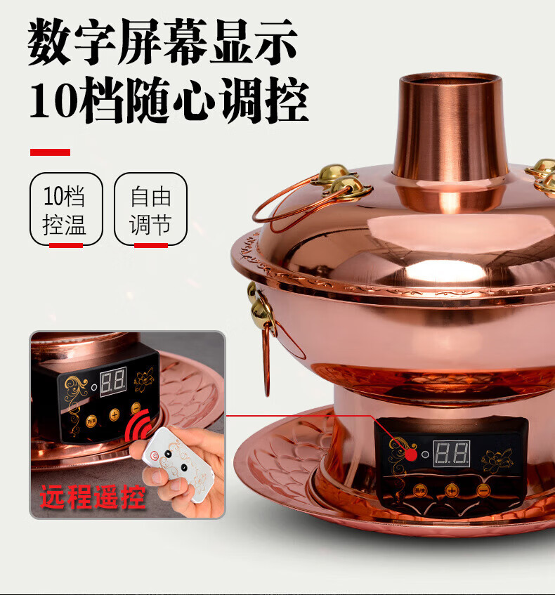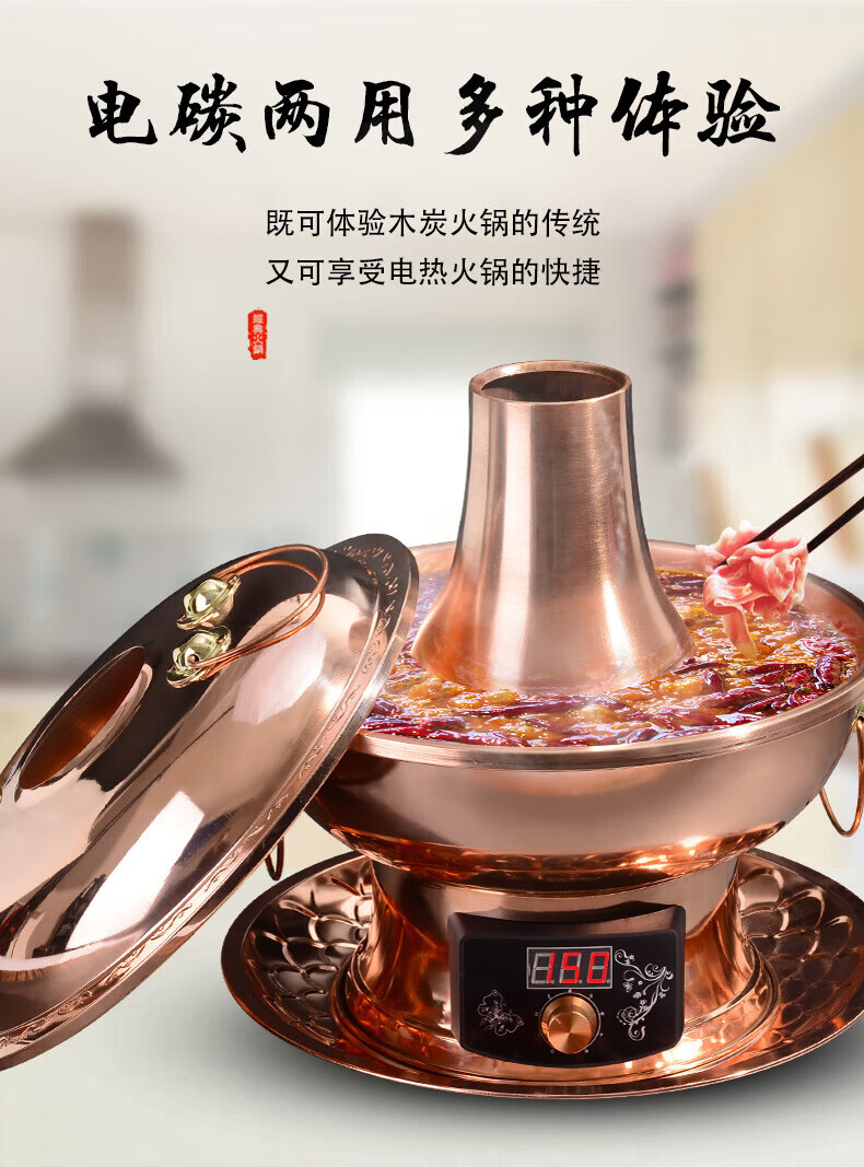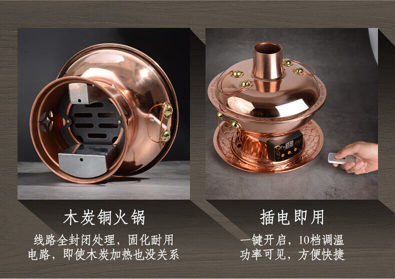 MMOTRO日本品牌紫铜电碳两用铜火锅加厚鸳鸯铜插电铜锅黄铜火锅家用款 紫铜(遥控数显10挡调温款) 34cm 32cm鸳鸯锅(6人以下使用)