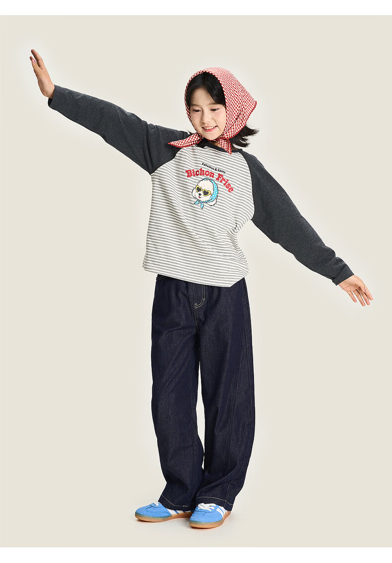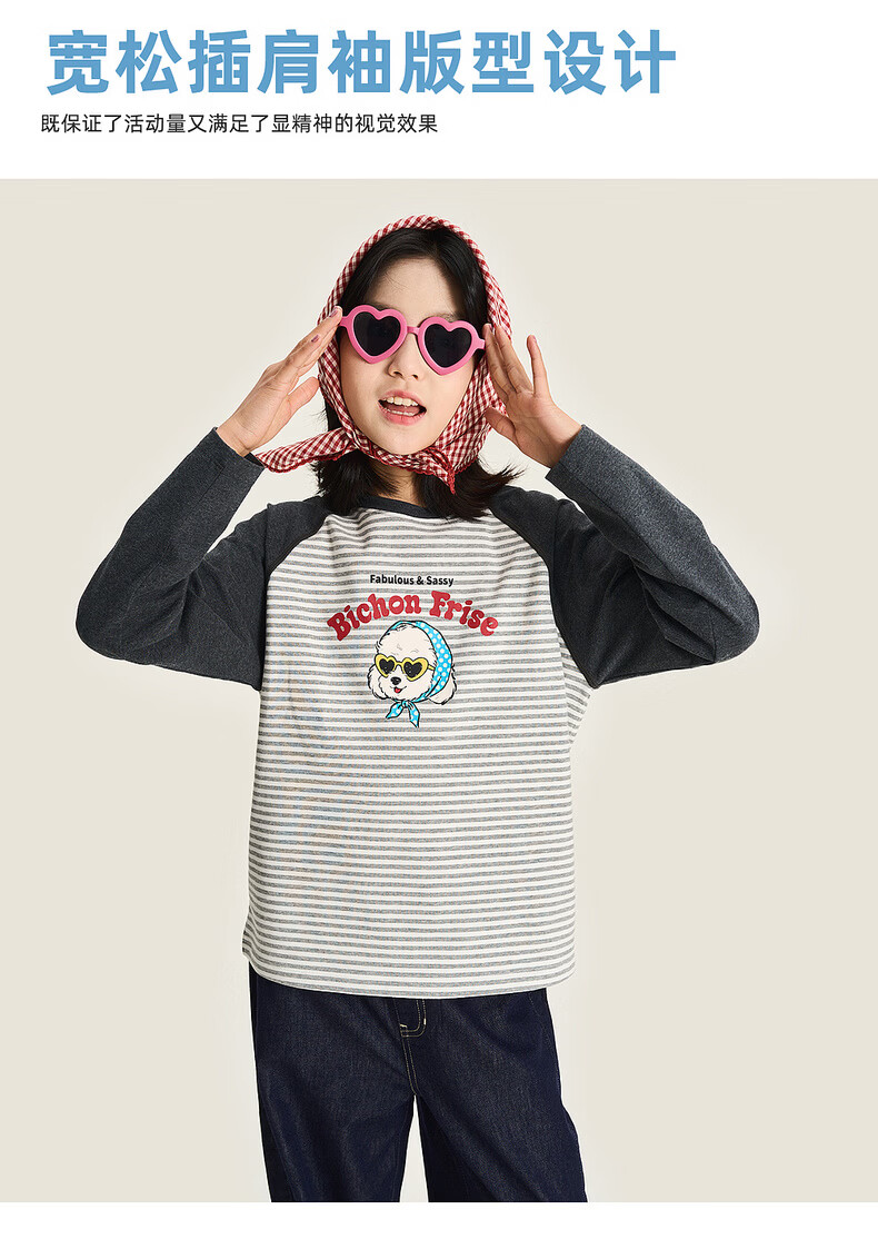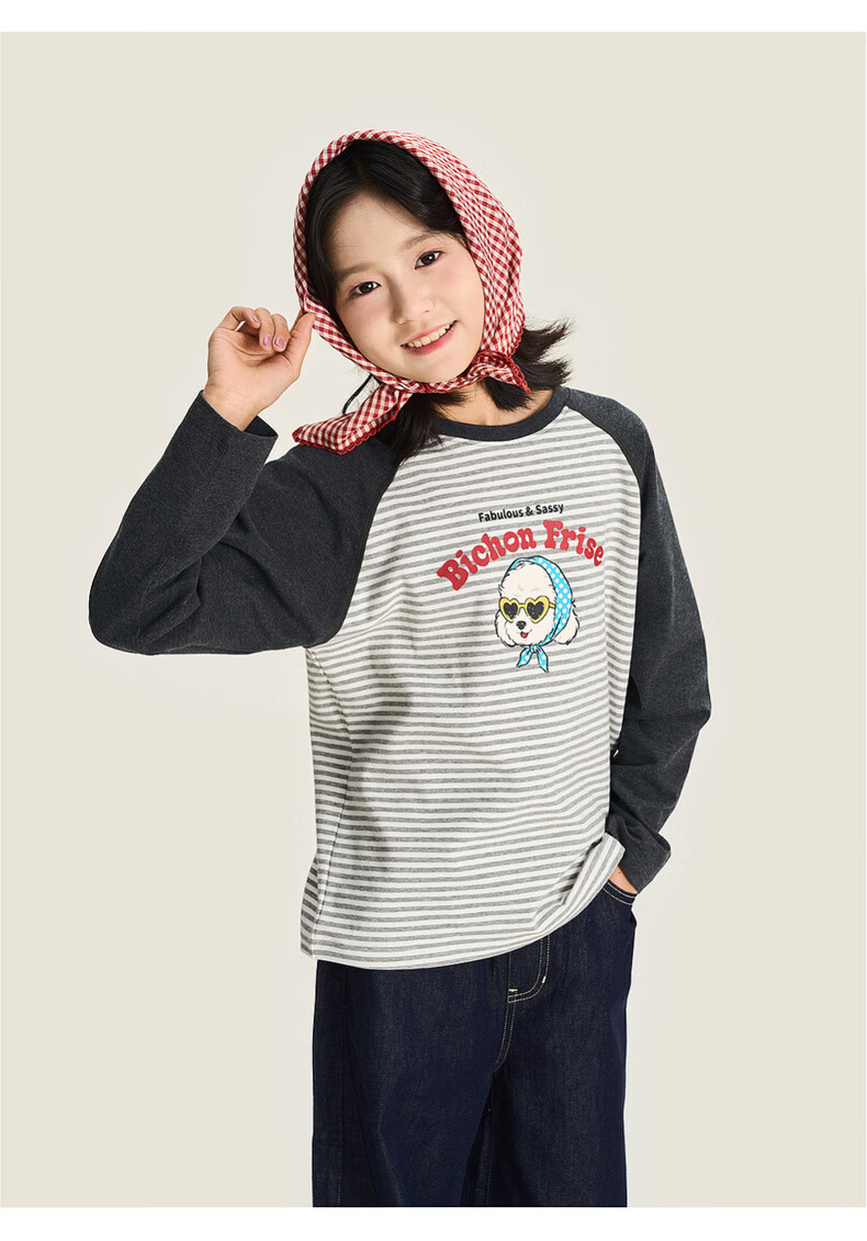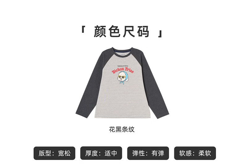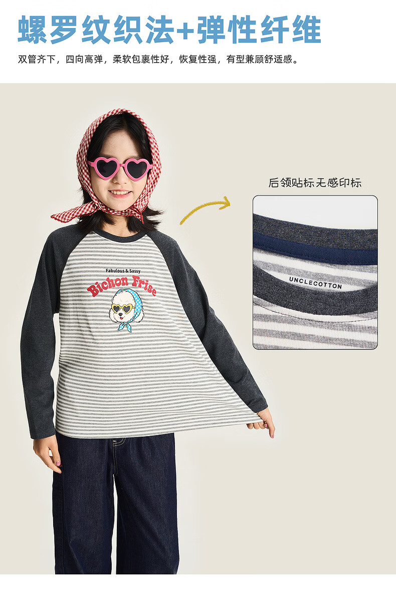 棉叔叔【新品长袖T恤】棉叔叔女童2026春季条纹撞色印花长袖T恤男童3.18 花黑条纹 120 120