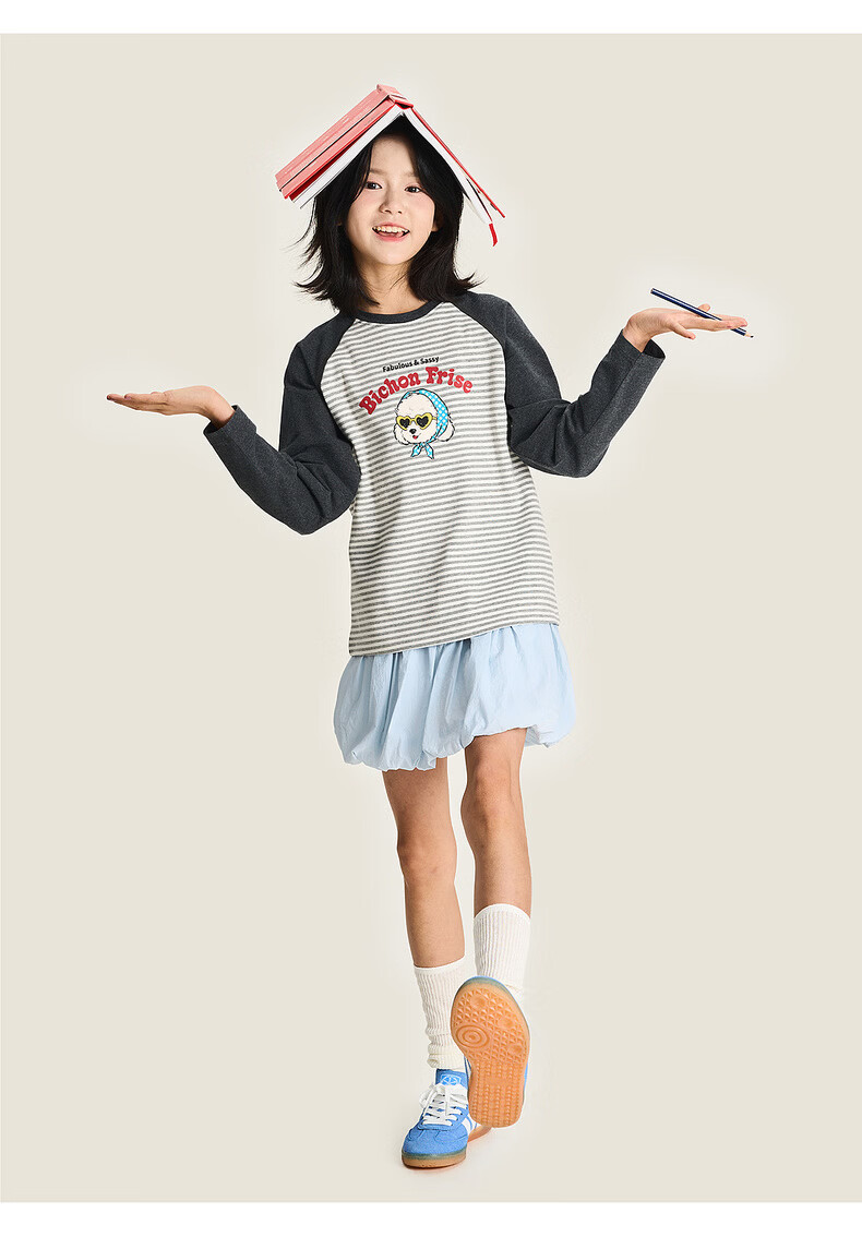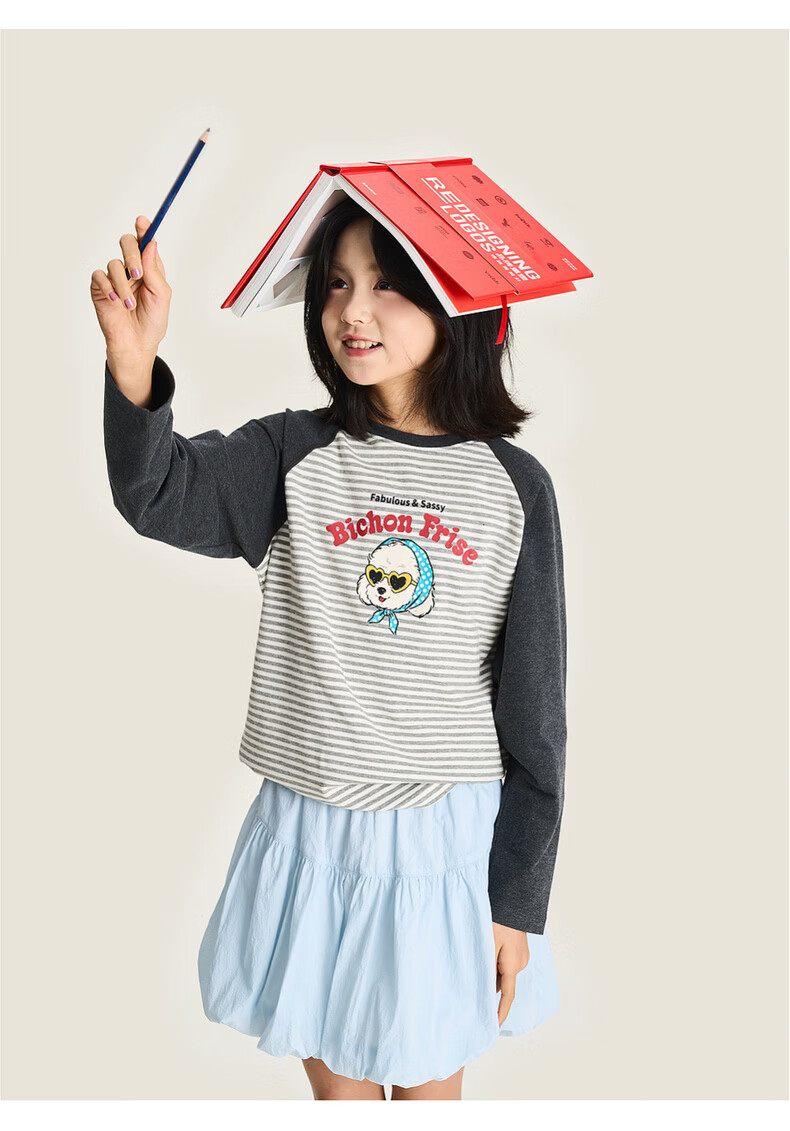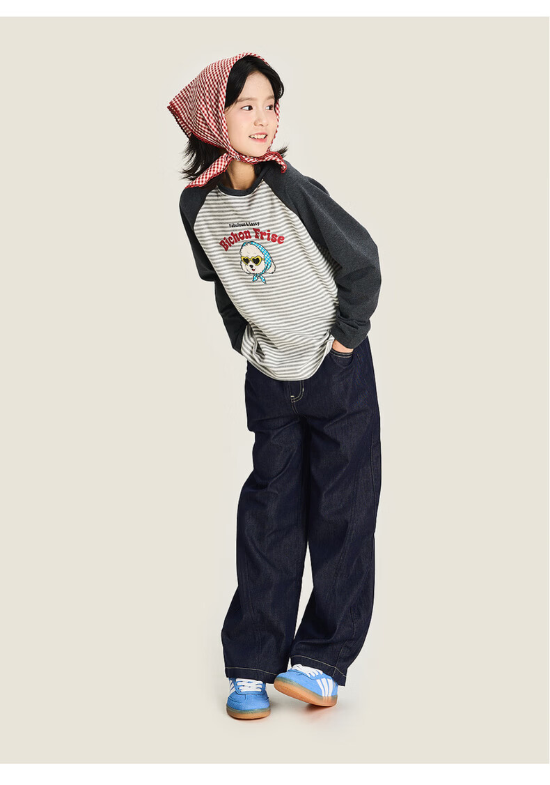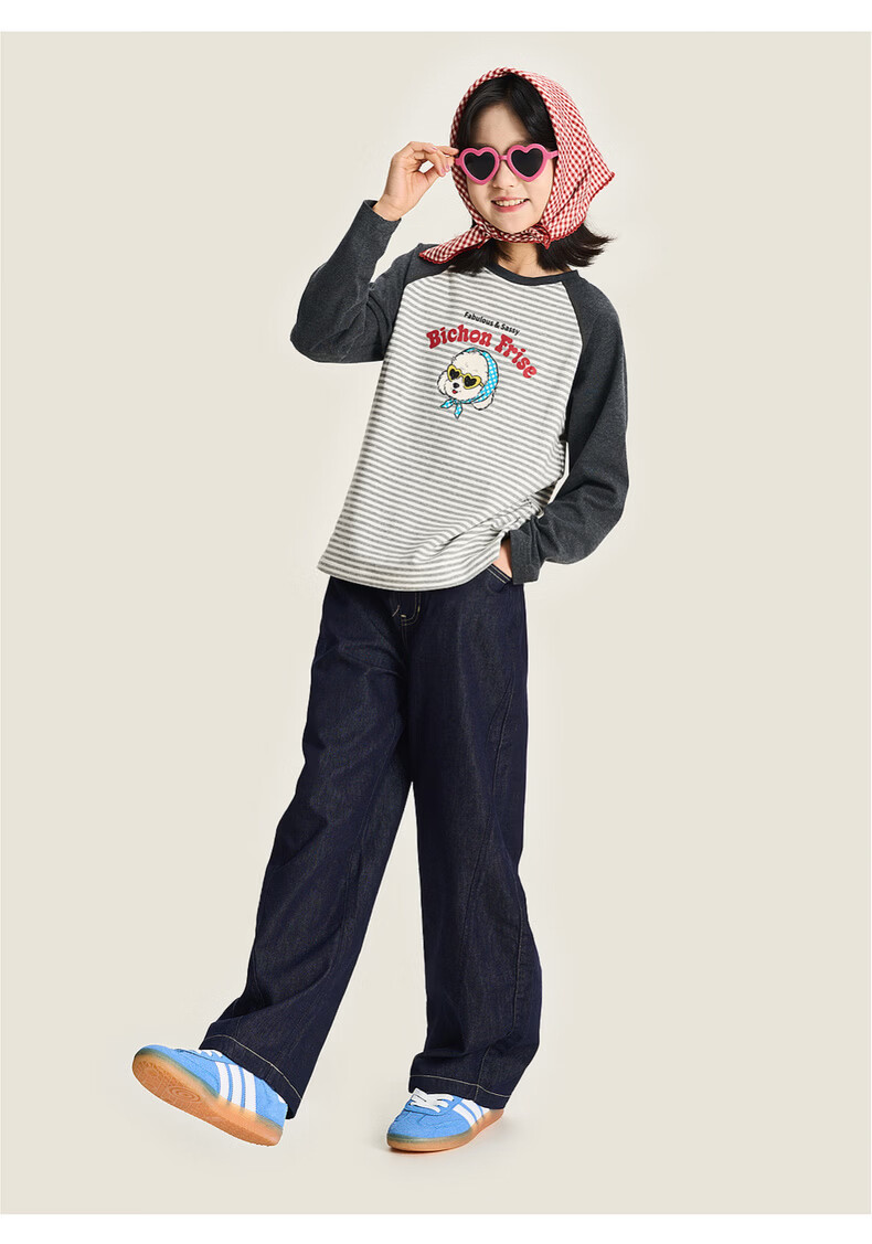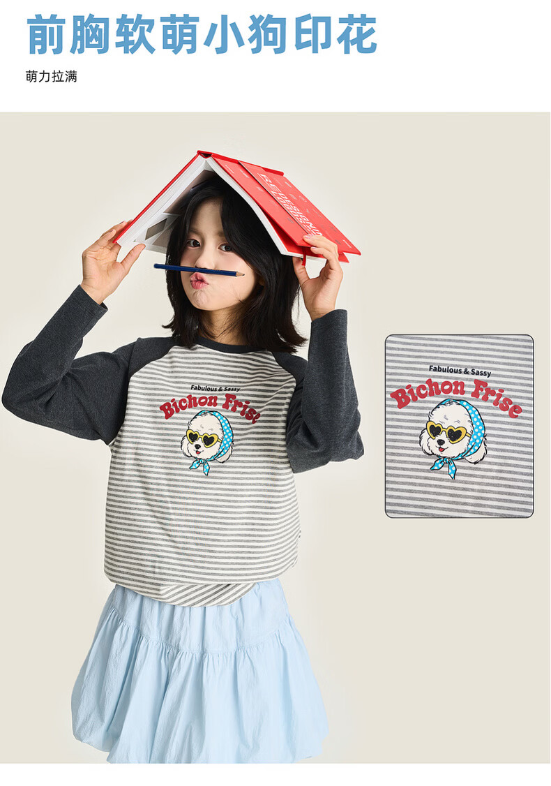 棉叔叔【新品长袖T恤】棉叔叔女童2026春季条纹撞色印花长袖T恤男童3.18 花黑条纹 120 120