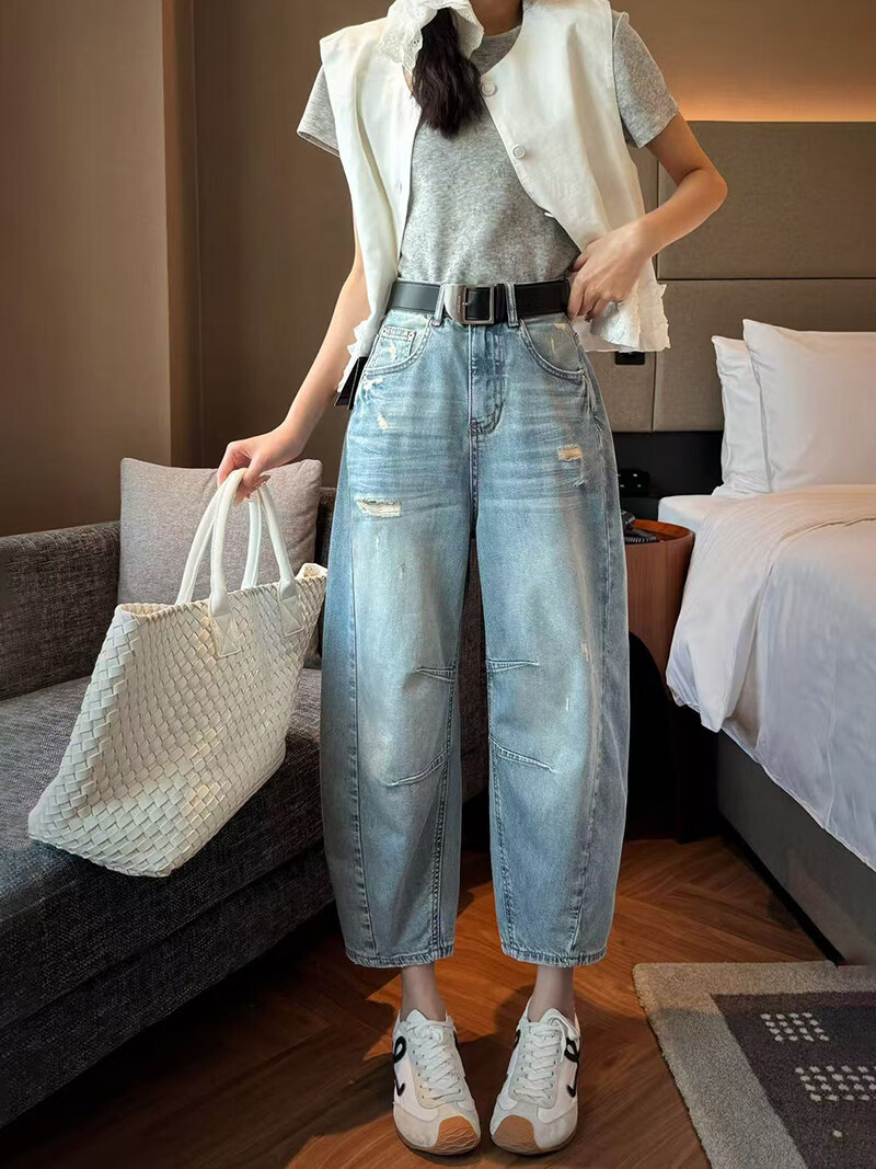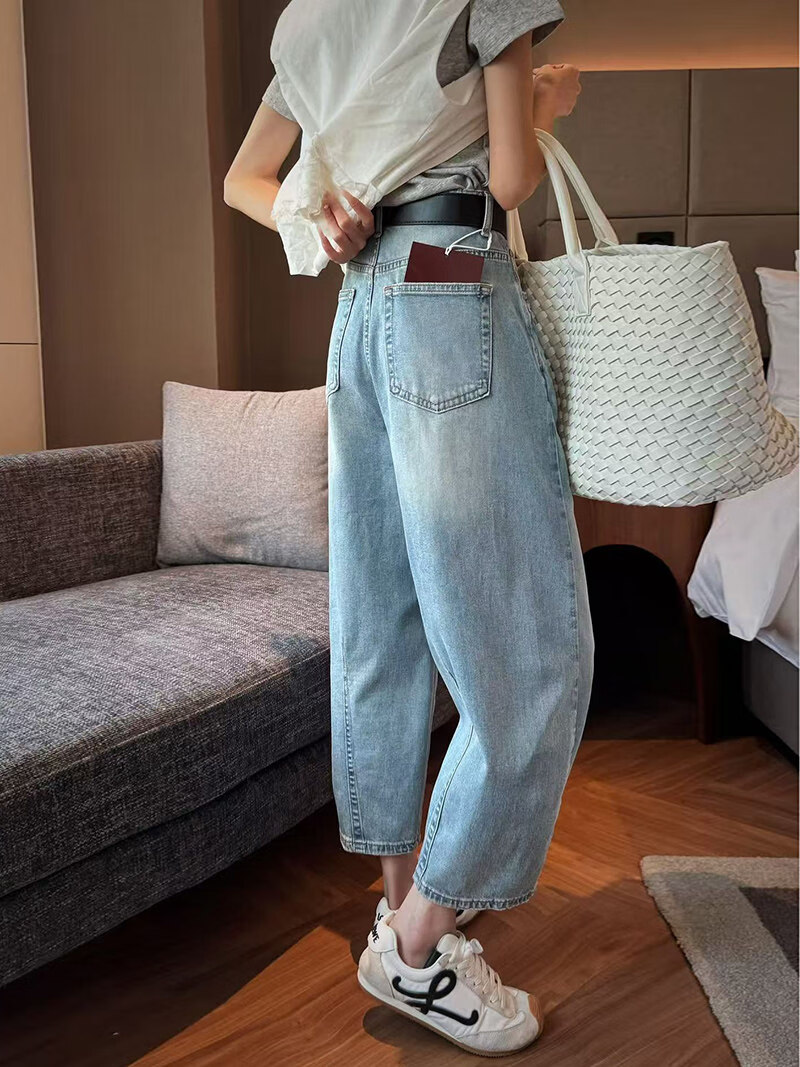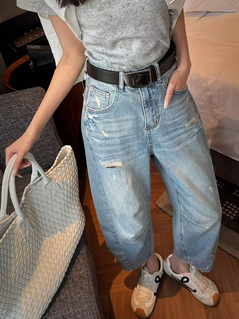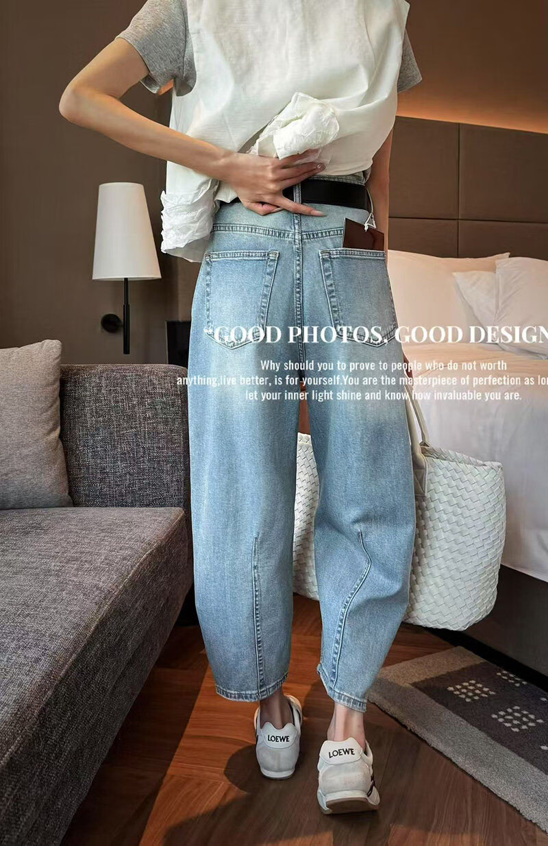 MODX2026夏季纤细的欧洲弯刀女士牛仔裤娇小的八分之一裤阔腿裤后宫裤 浅蓝色 26 90-105斤