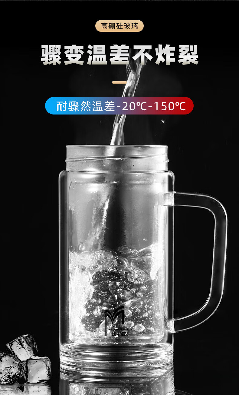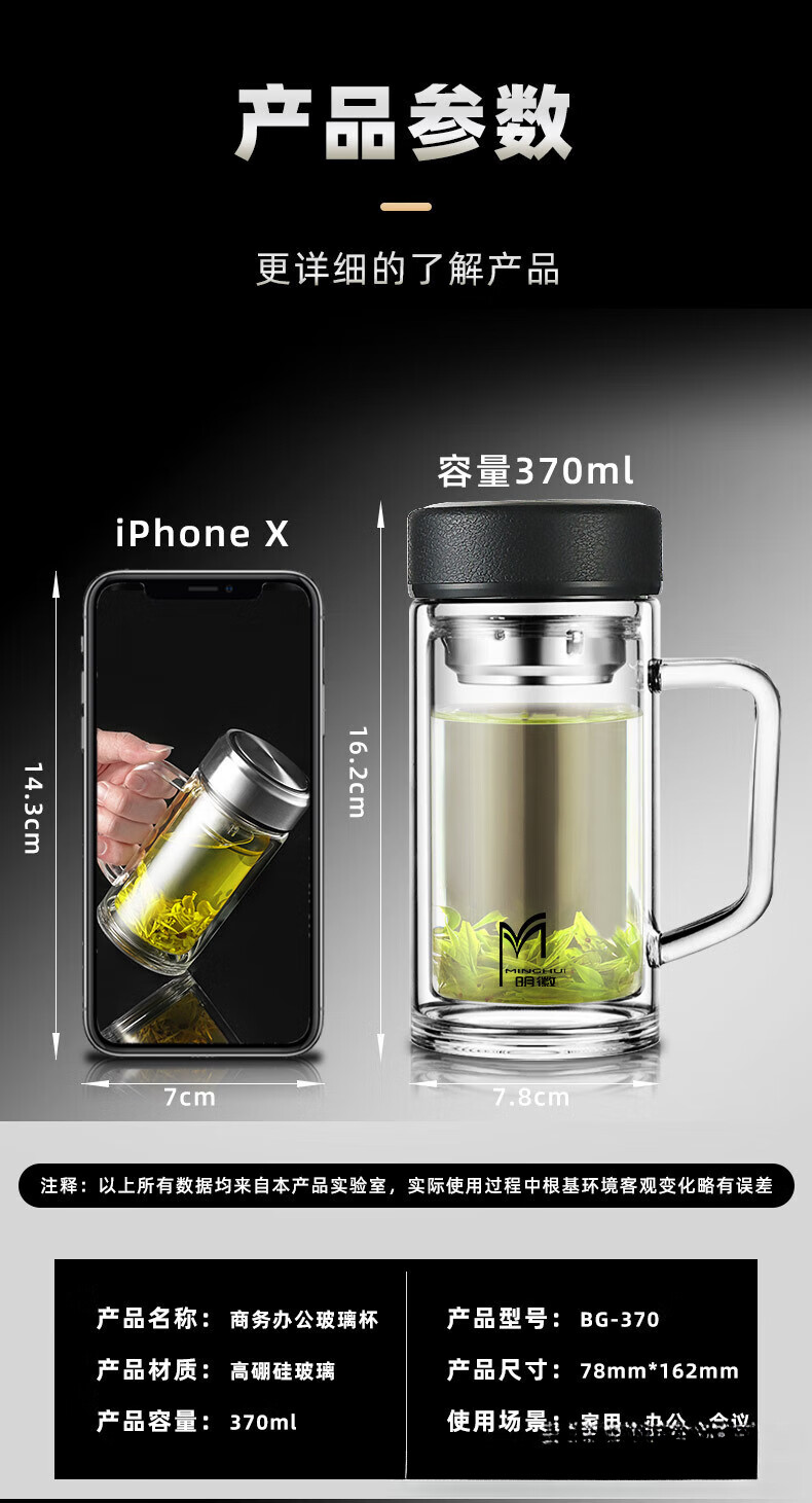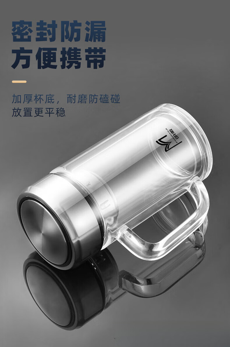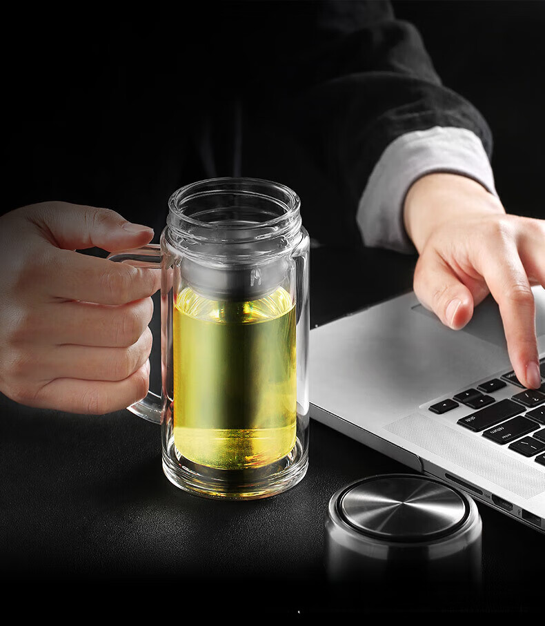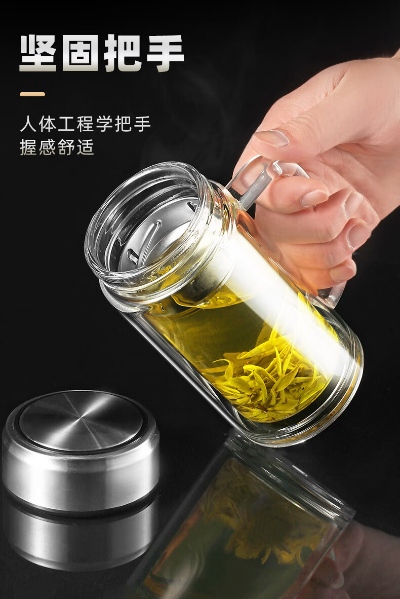 【优选直发】双层高硼硅玻璃杯带把手水杯带盖耐高温防烫泡茶杯子 简约本 370ml 1只