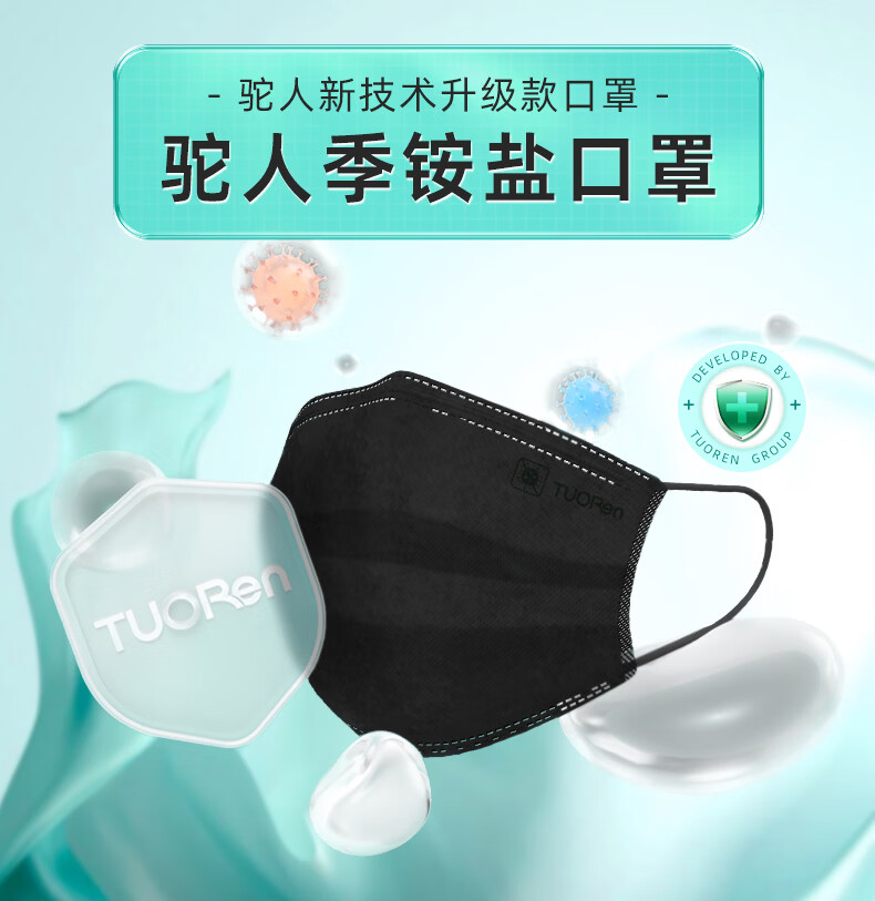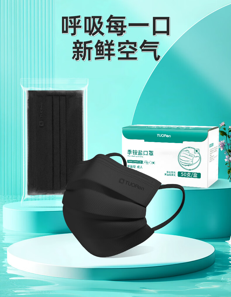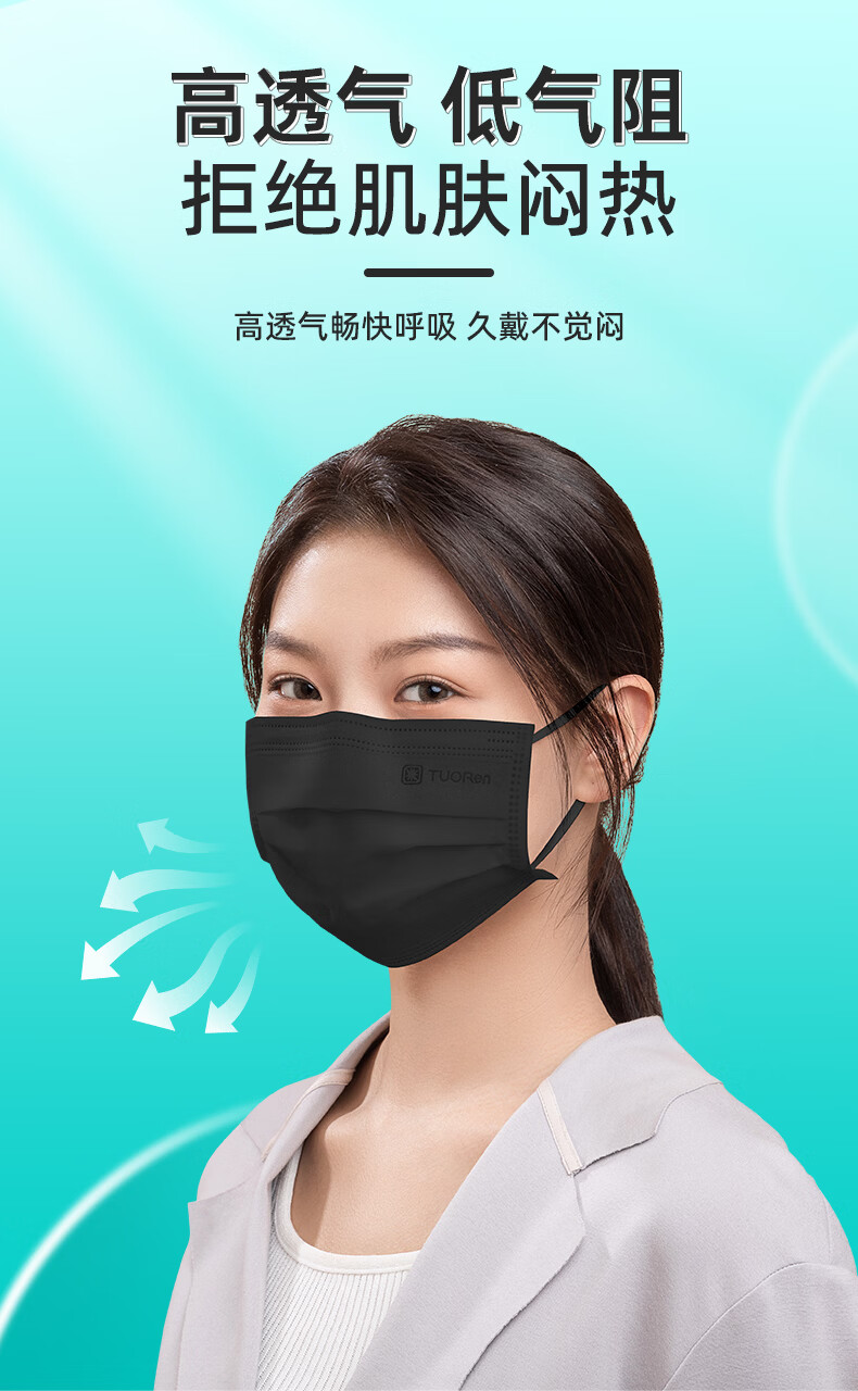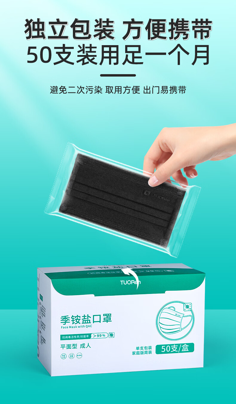 驼人康君季铵盐黑色一次性口罩男女士成人情侣高颜值冬季防风防寒独立包装 【买1盒送1盒共100支】成人平面黑色