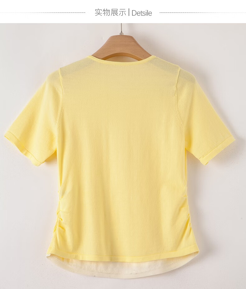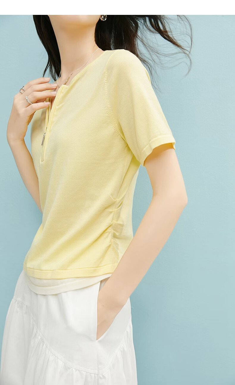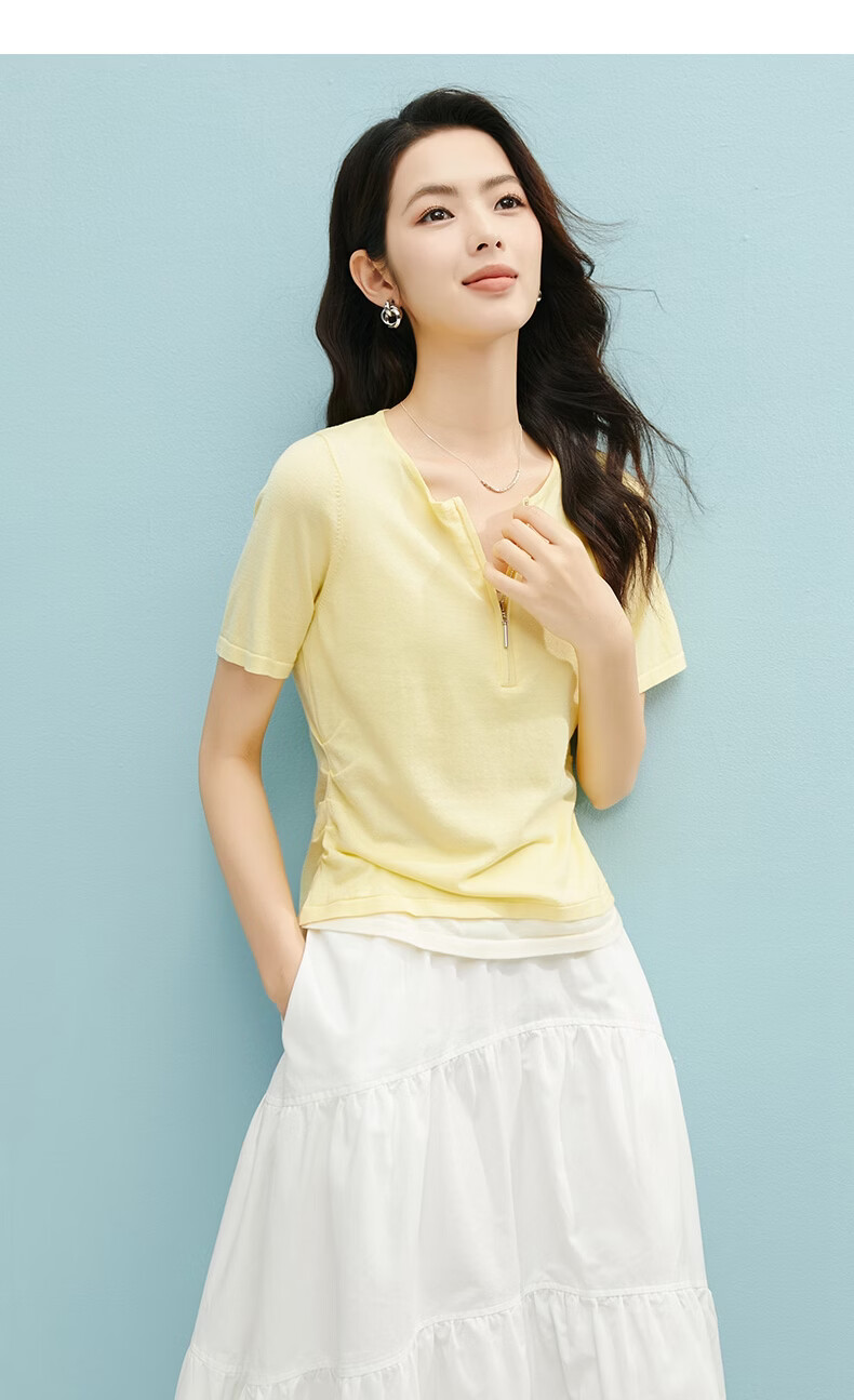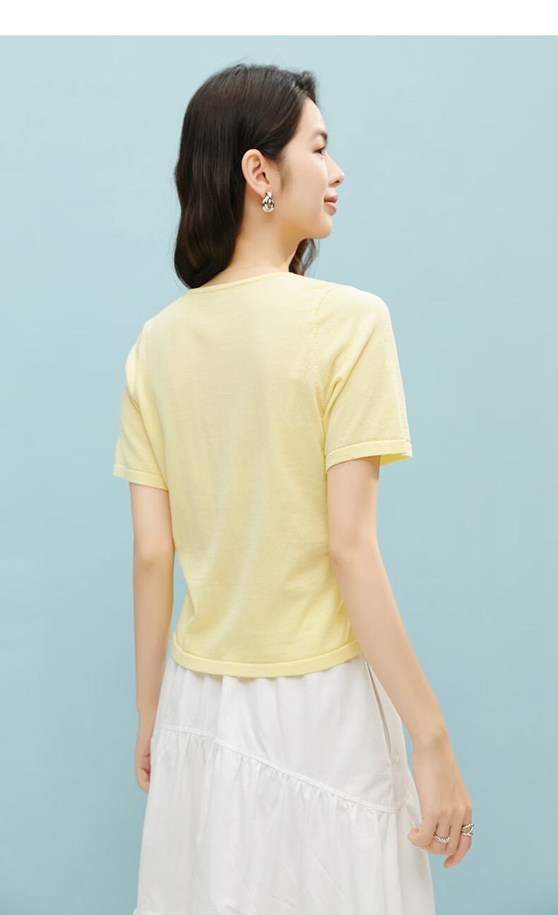 晚白【新品】2026年春款圆领休闲上衣亲肤莱赛尔百搭针织短袖女 嫩黄色 S