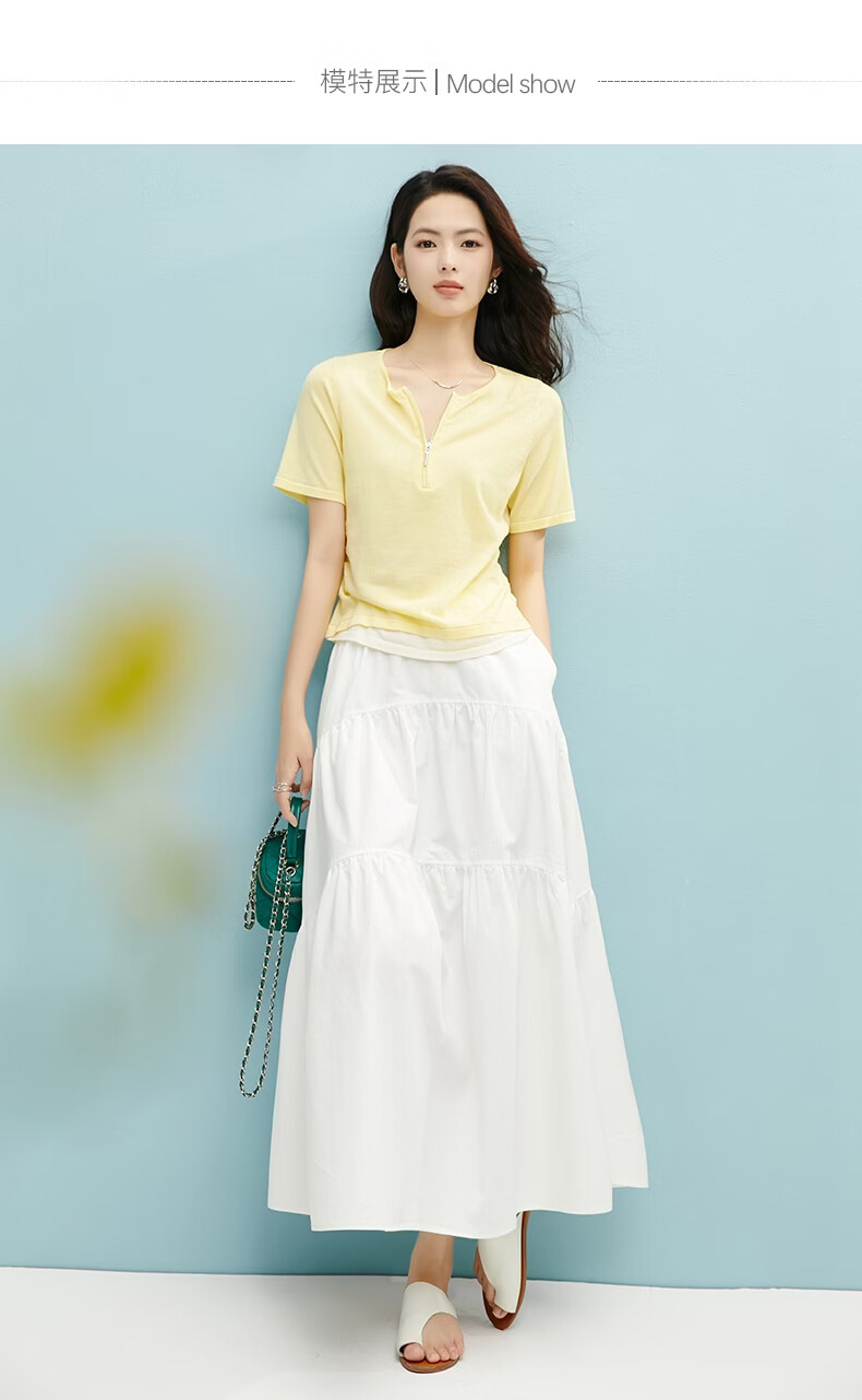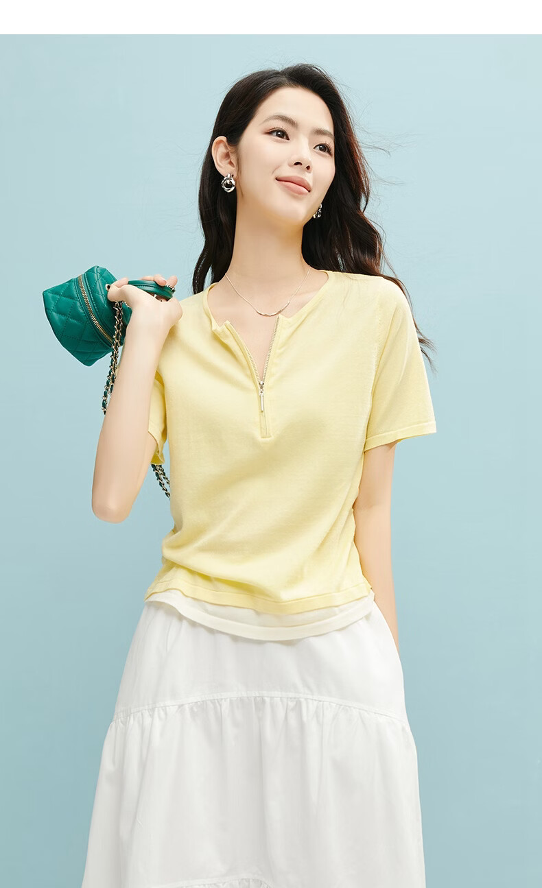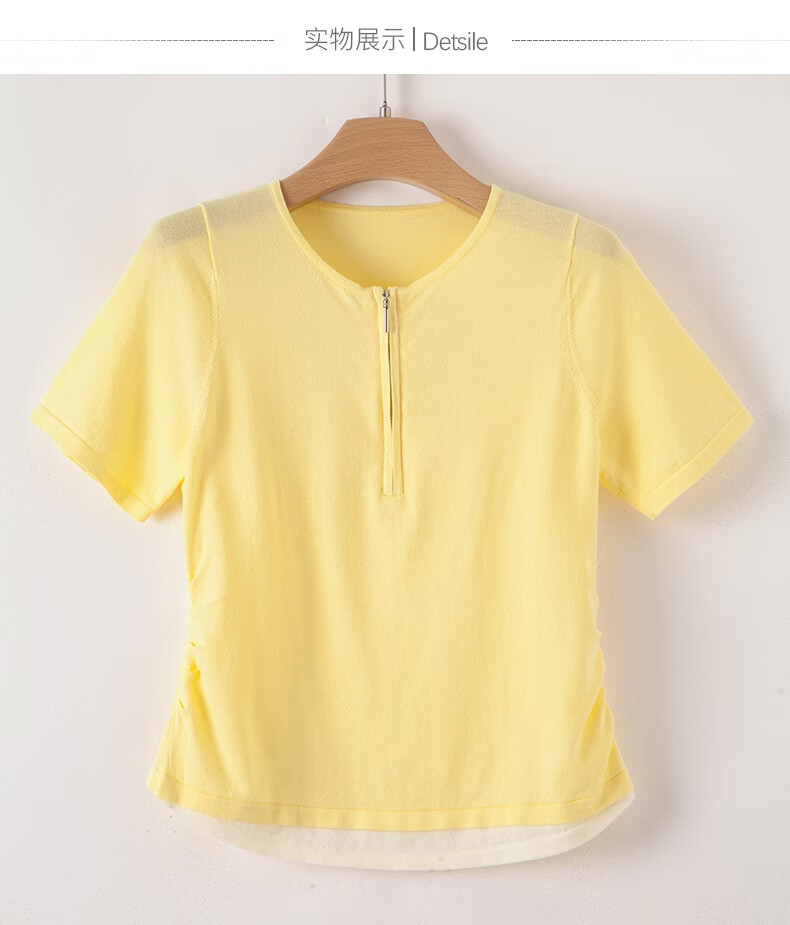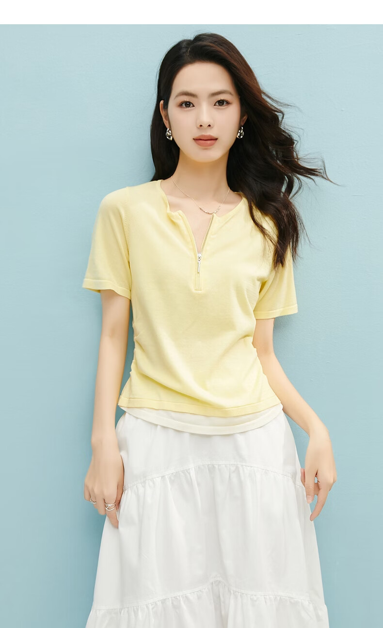 晚白【新品】2026年春款圆领休闲上衣亲肤莱赛尔百搭针织短袖女 嫩黄色 S