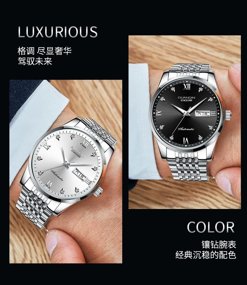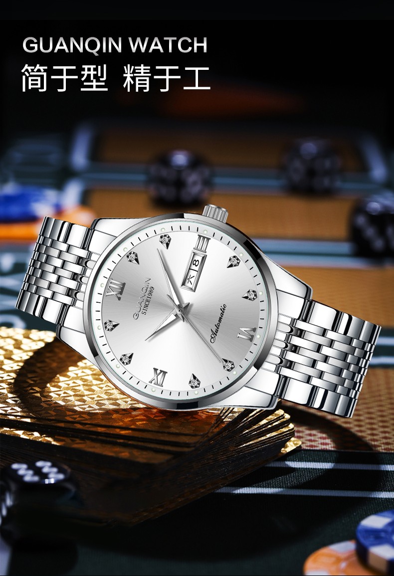 冠琴(GUANQIN)手表男款全自动机械表多功能菱形男表学生考试手表生日礼物送男友 钢带银灰/免费刻字/贈皮表带