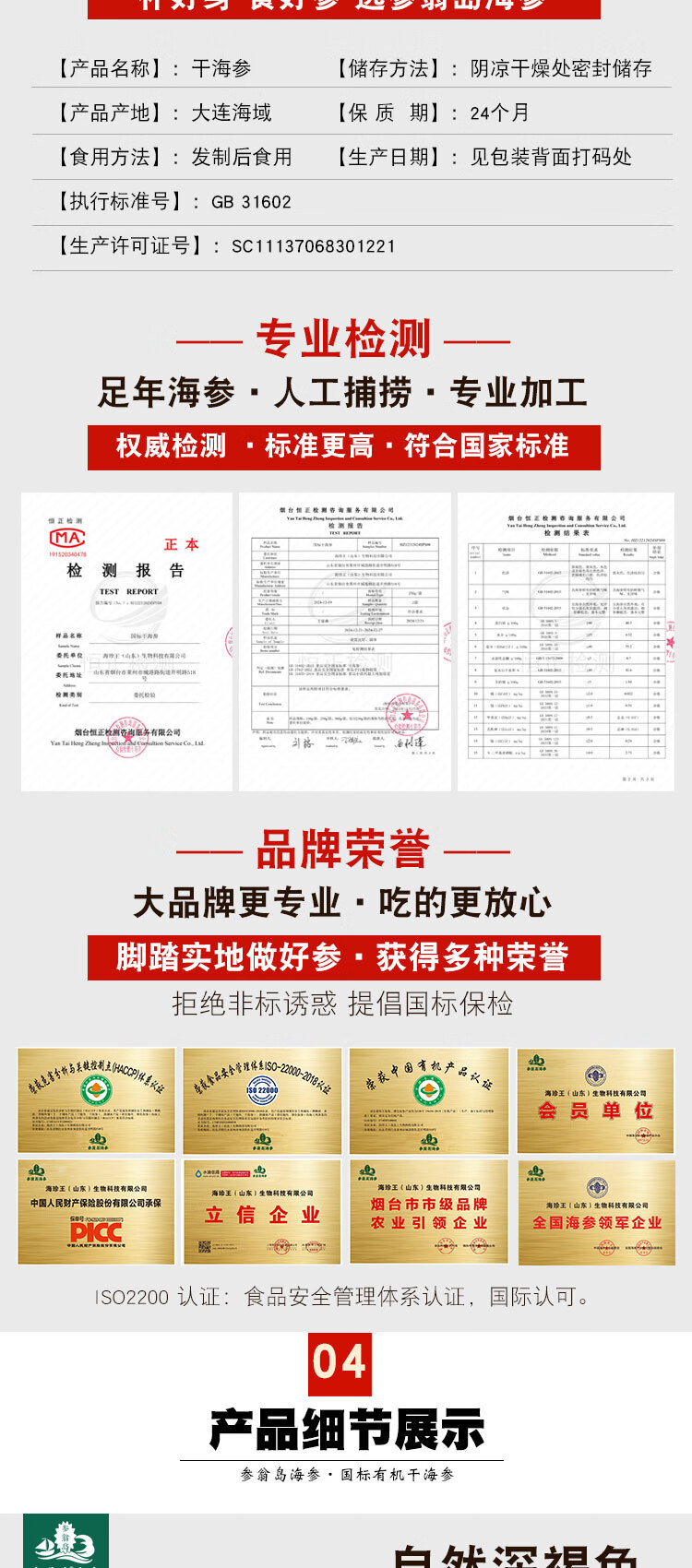 参翁岛【过节送礼促销活动】大连底播纯淡干海参 150克g礼盒装 国标有机 经典礼盒装 150g*1盒 18-24头