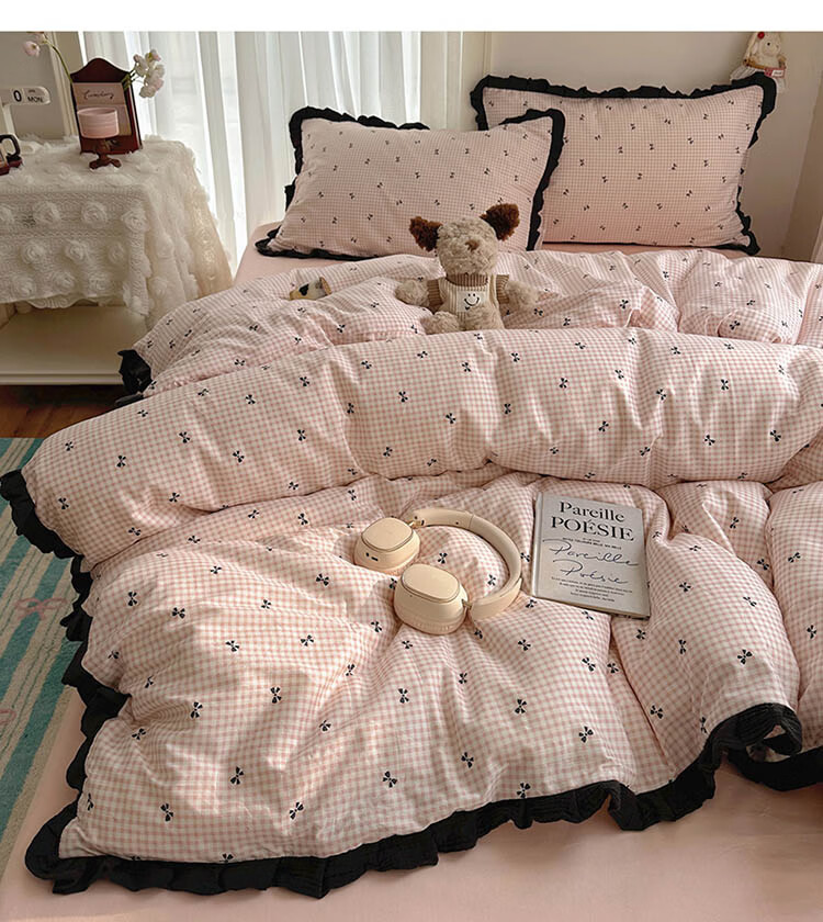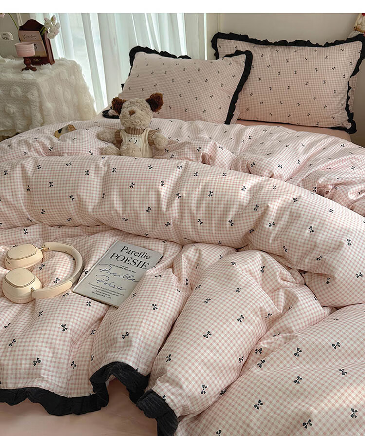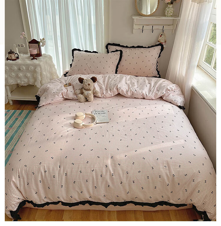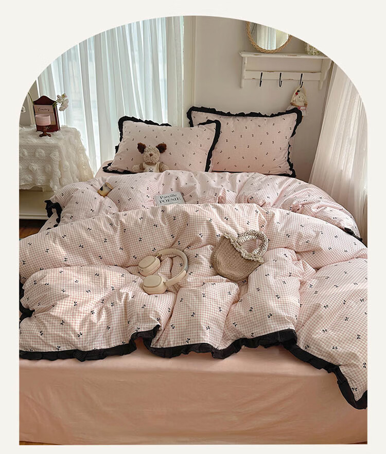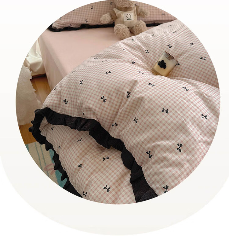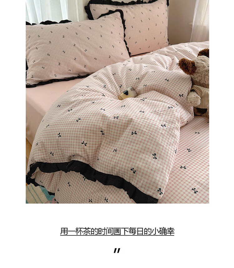 无印良品A类皱皱纱纯棉床上四件套全棉高级感花边款被套床单床笠裸睡床品4 全棉皱皱纱花边-格子蝴蝶结粉 1.8m 床单款 四件套-被套200x230cm