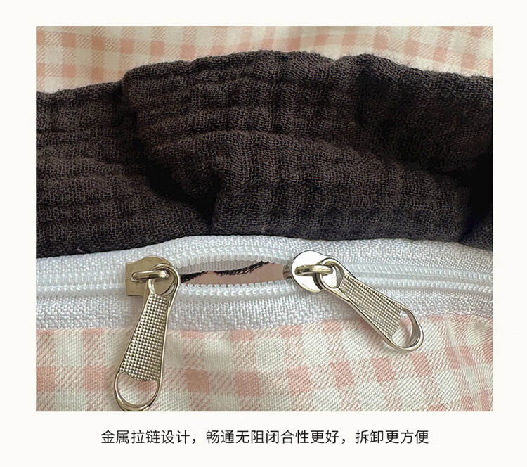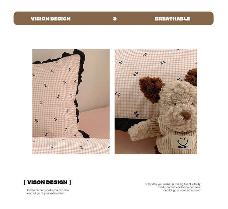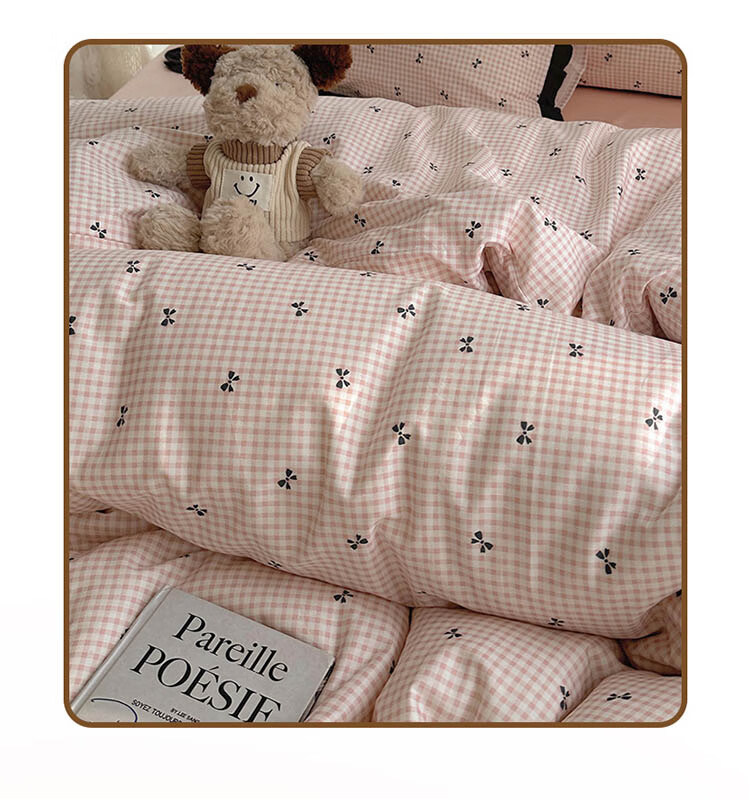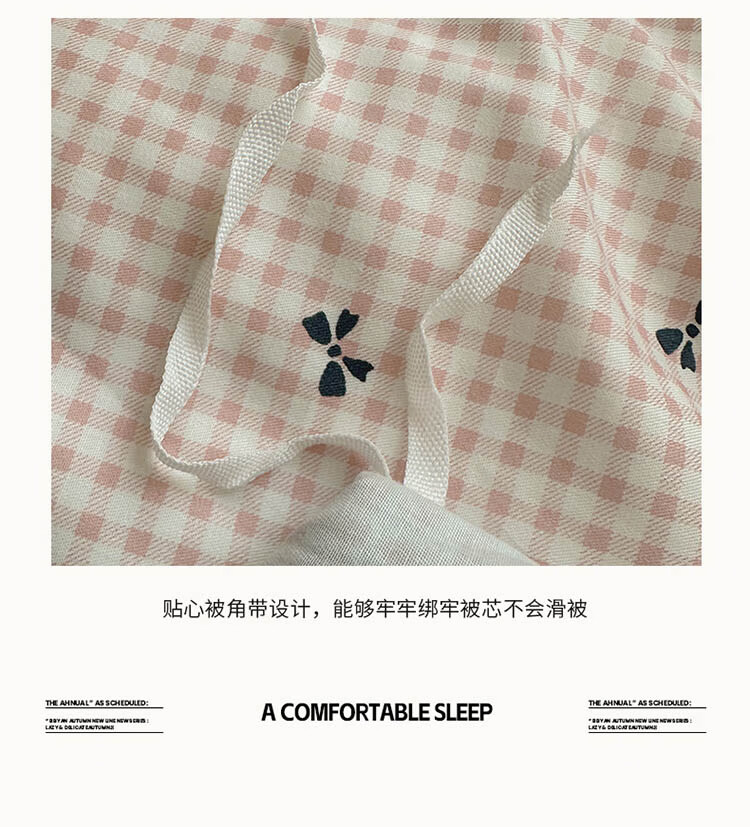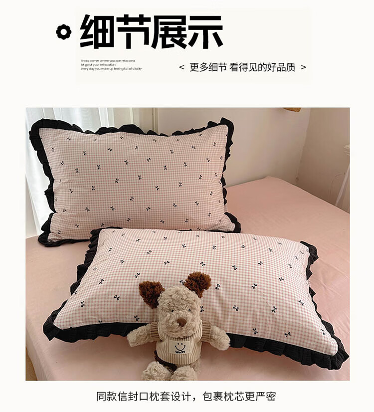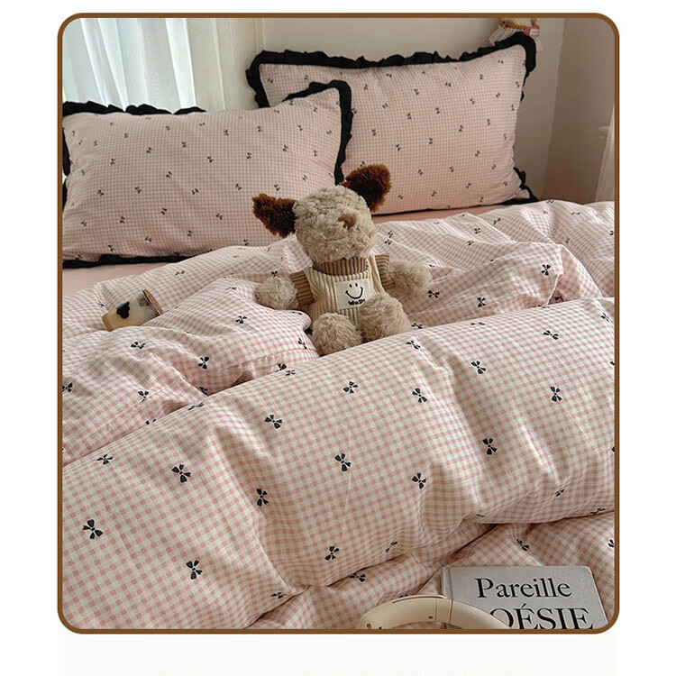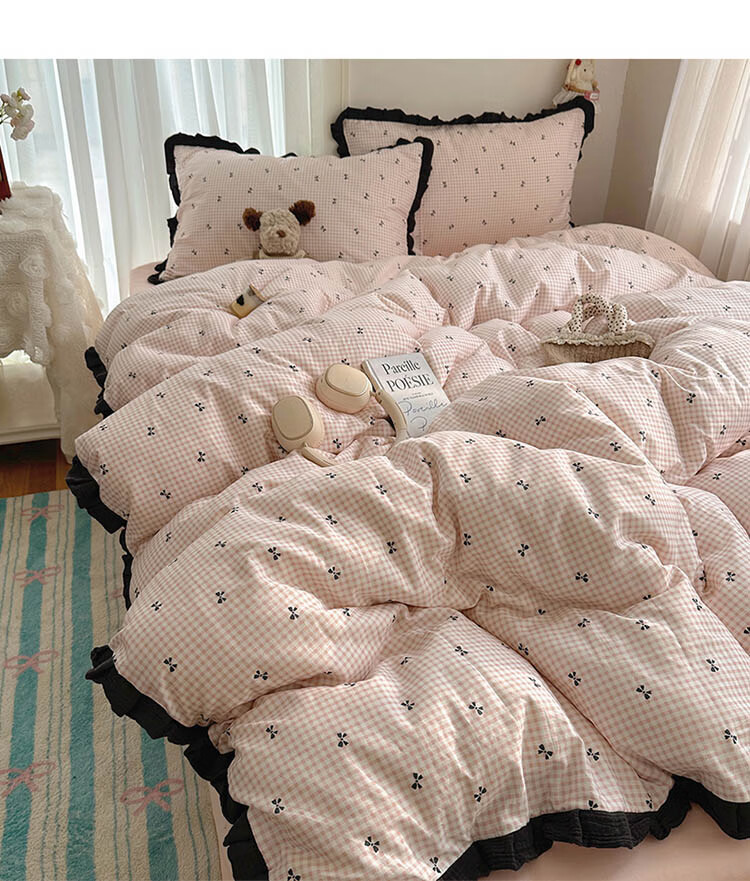 无印良品A类皱皱纱纯棉床上四件套全棉高级感花边款被套床单床笠裸睡床品4 全棉皱皱纱花边-格子蝴蝶结粉 1.8m 床单款 四件套-被套200x230cm