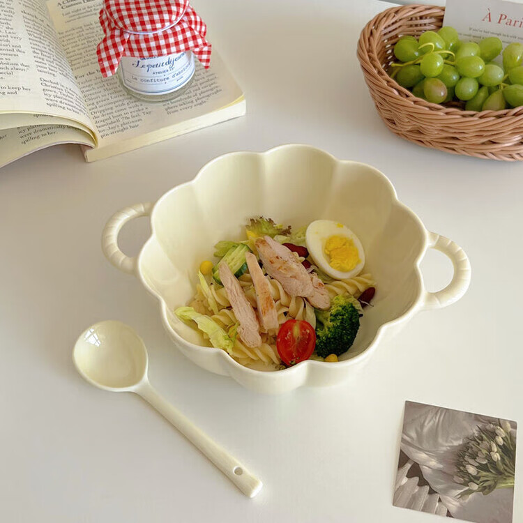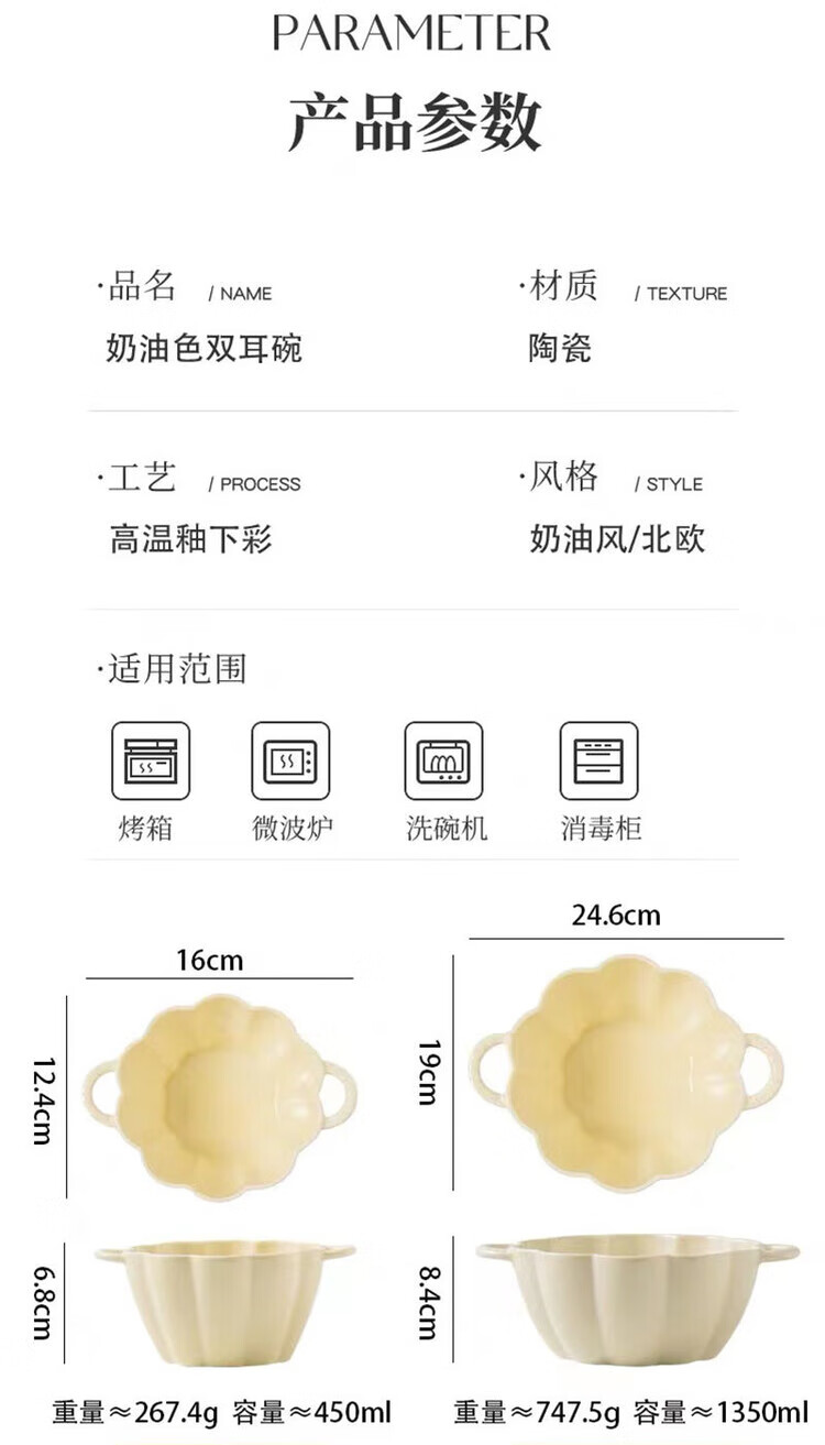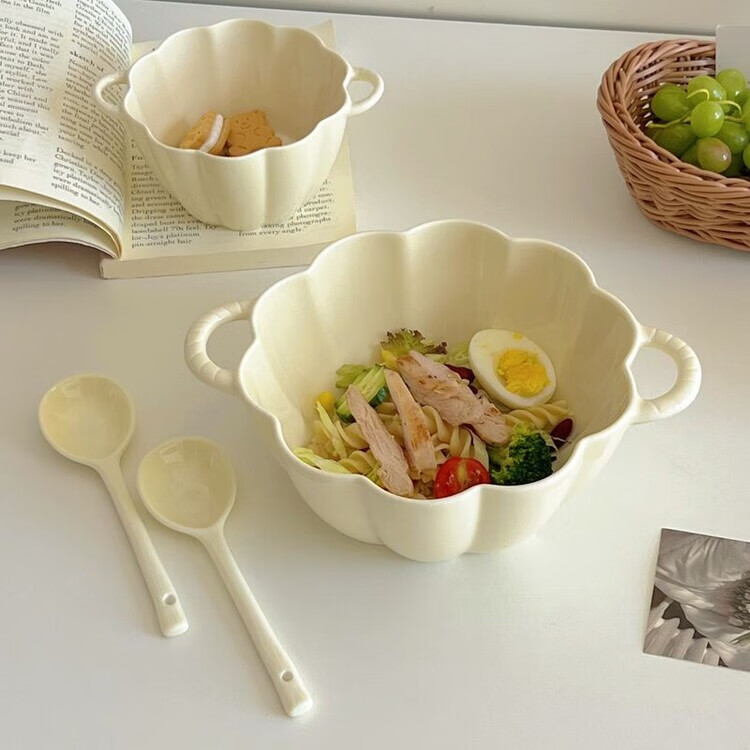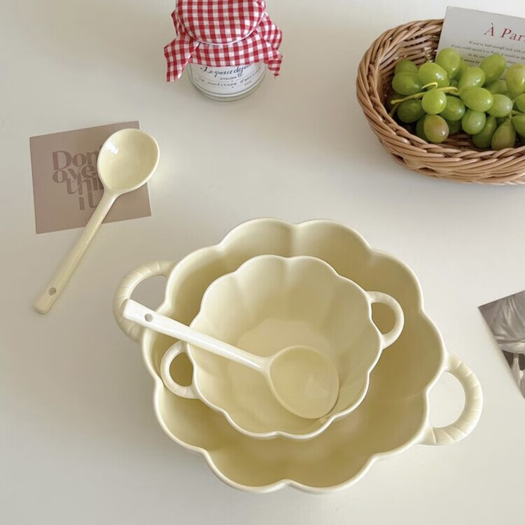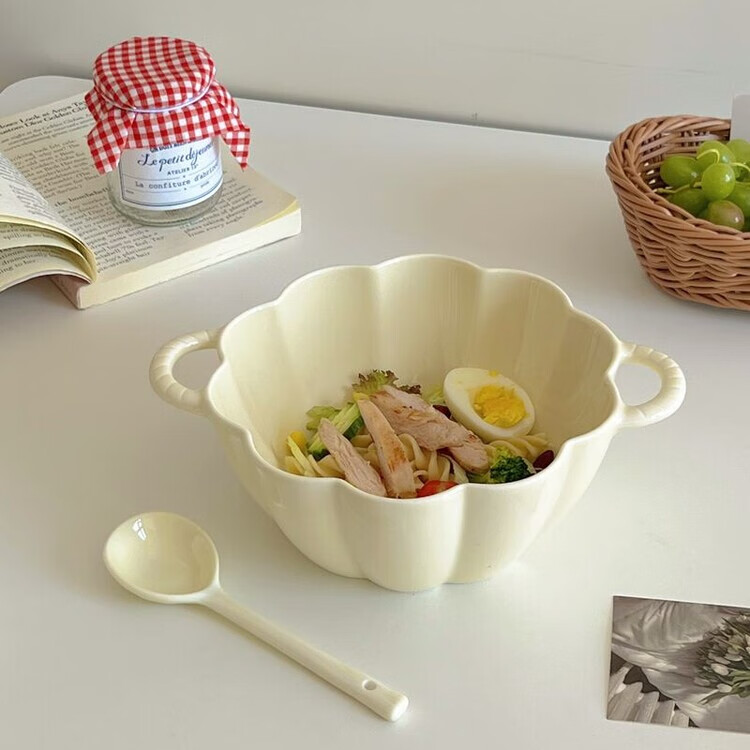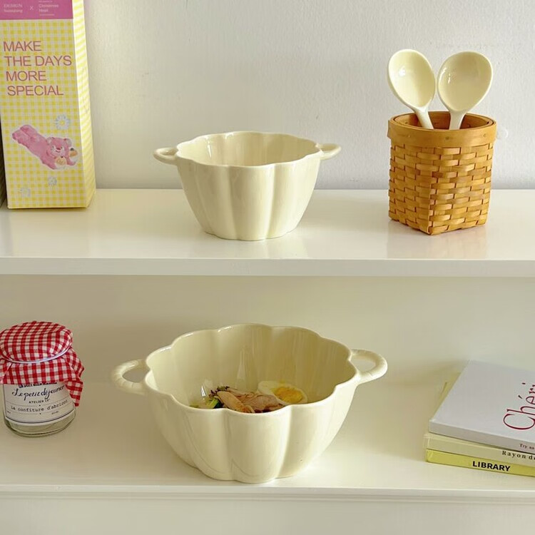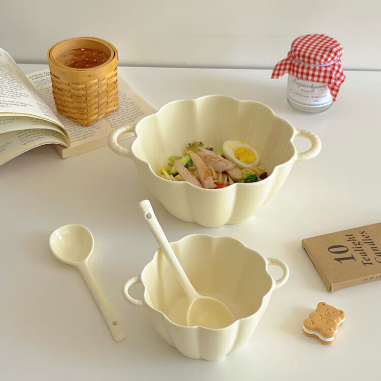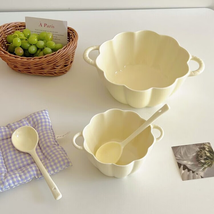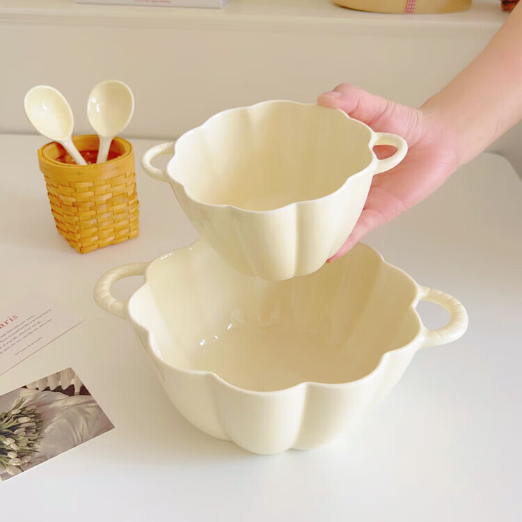 喆系高颜值奶黄色双耳大汤碗带勺ins风陶瓷家用沙拉泡面碗可爱南瓜碗 10英寸大号奶油双耳南瓜碗