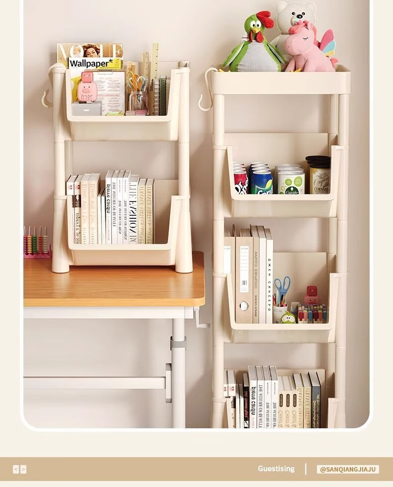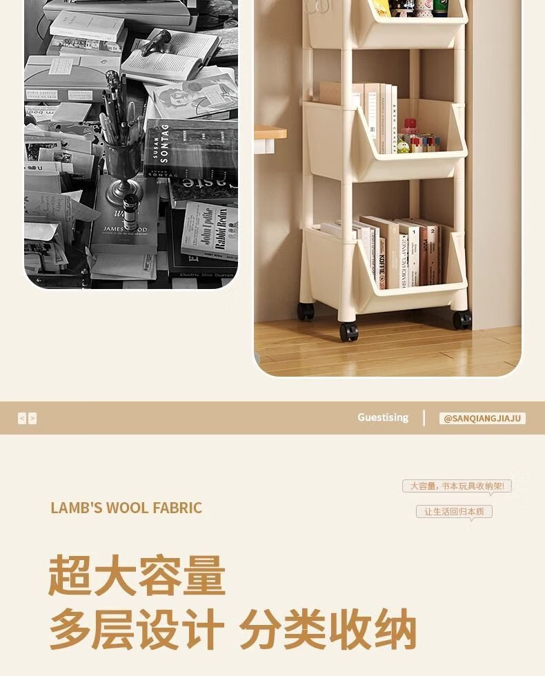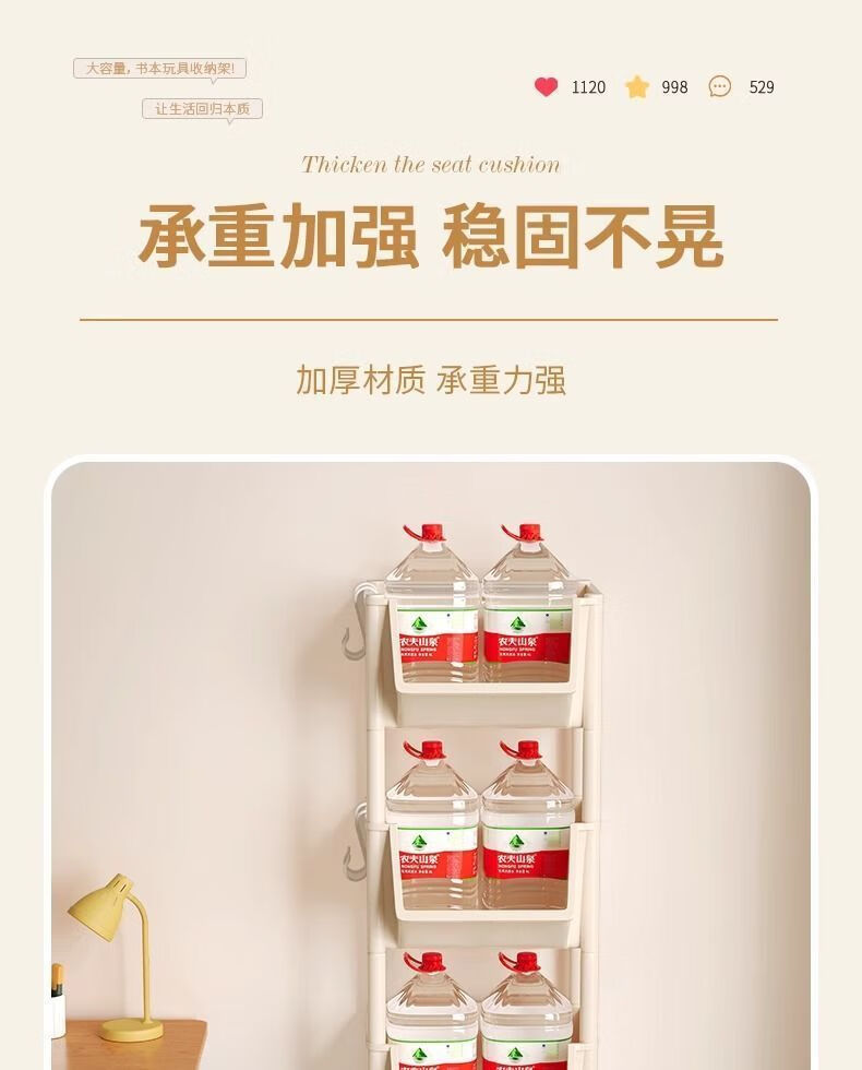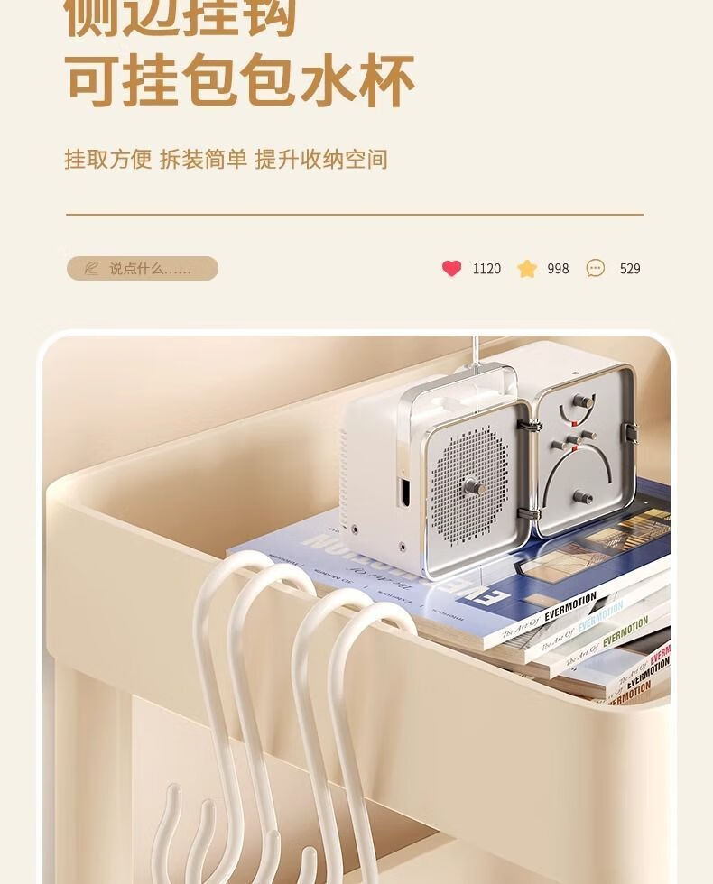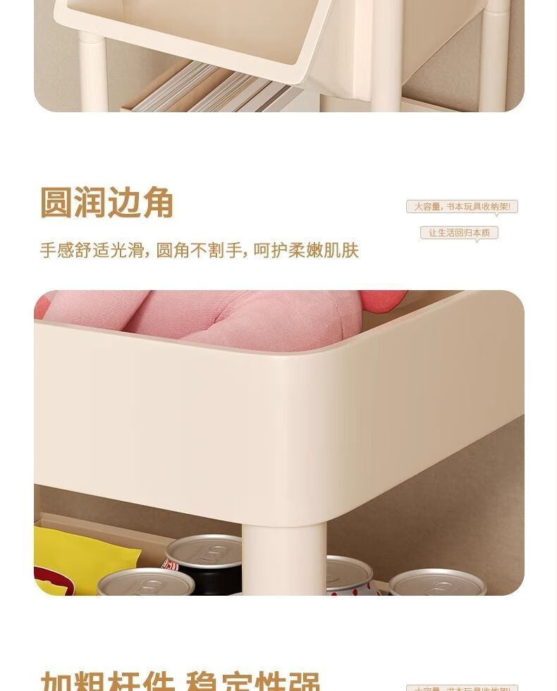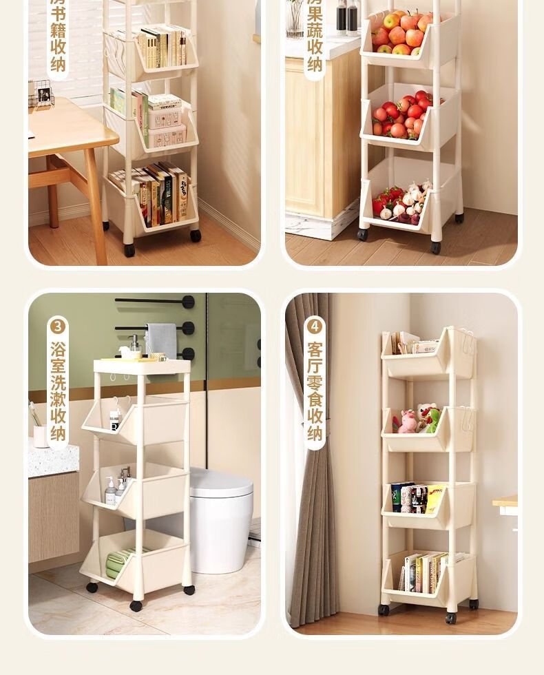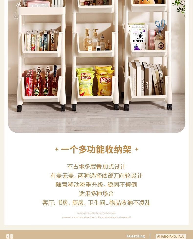 小推车置物架厨房浴室移动书架落地多层收纳婴儿用品零食储物架 3层-平顶款【滑轮+挂钩】 时尚灰