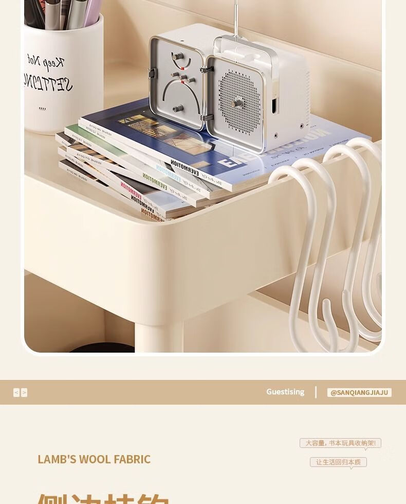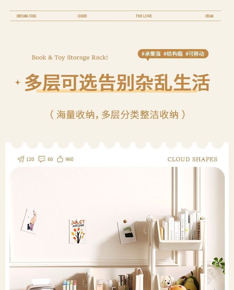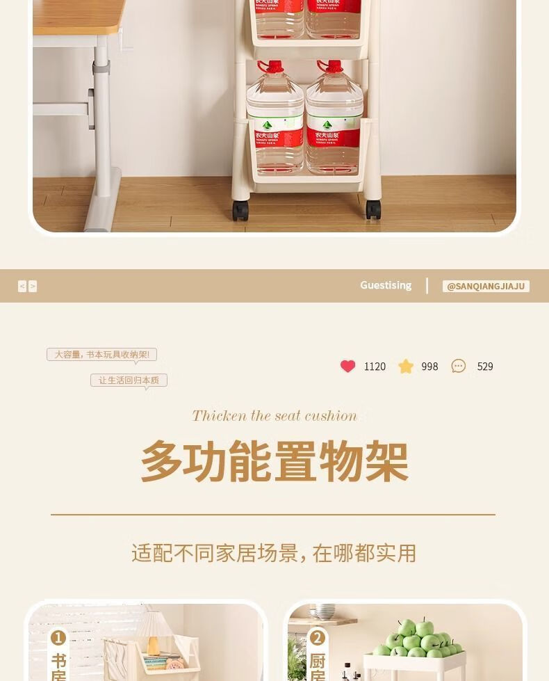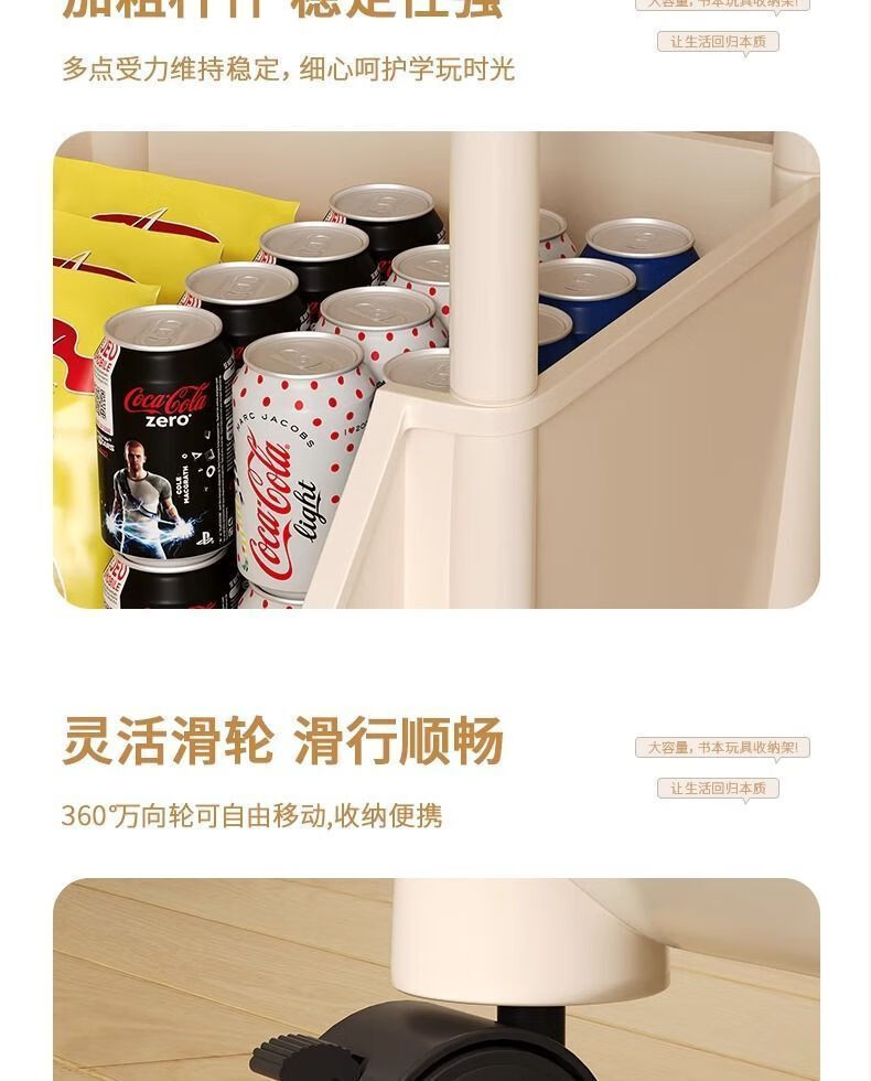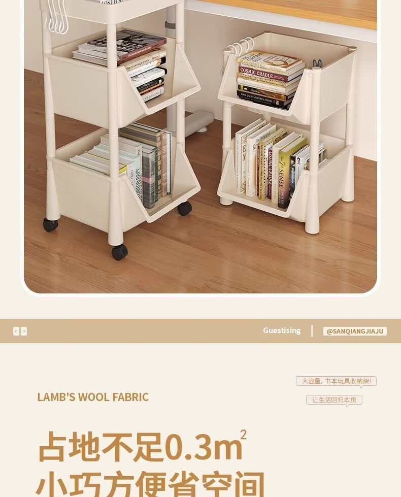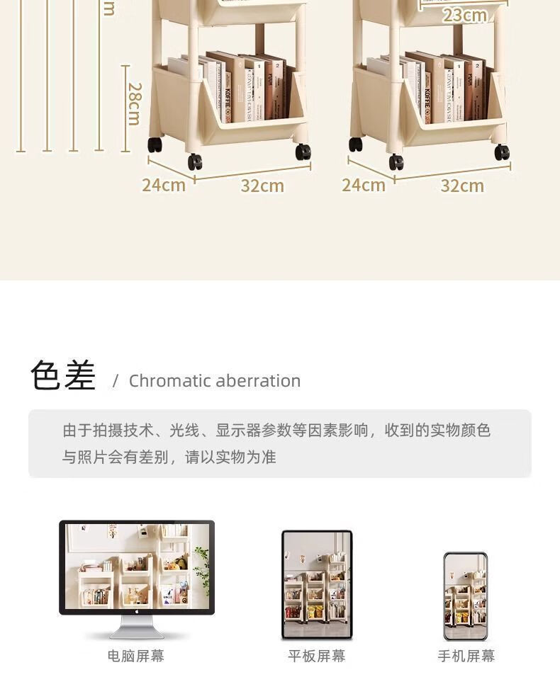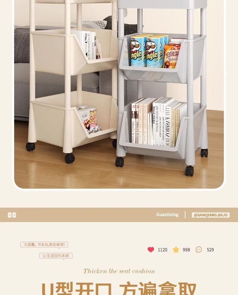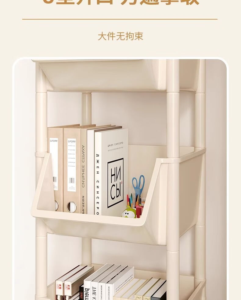 小推车置物架厨房浴室移动书架落地多层收纳婴儿用品零食储物架 3层-平顶款【滑轮+挂钩】 时尚灰
