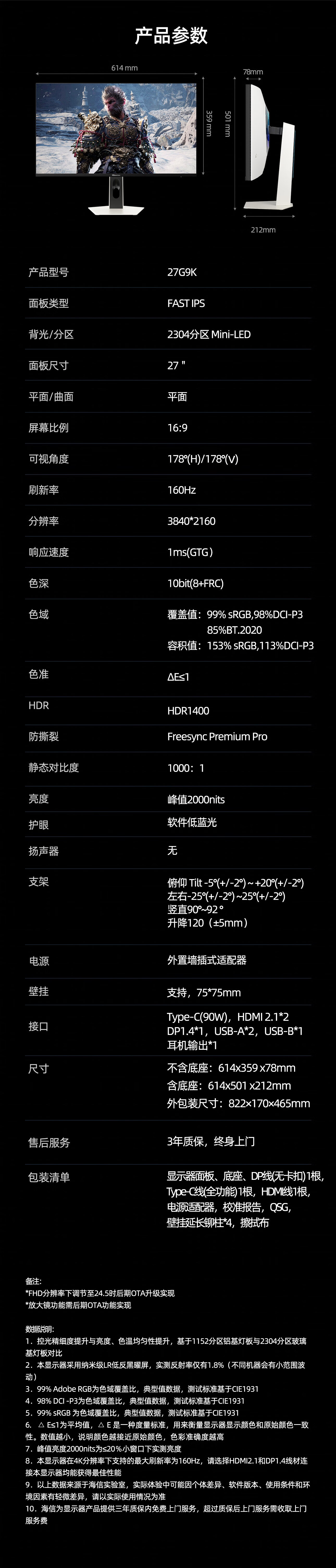 海信大圣G9 27英寸3A原画 黑曜屏 2304分区 U+MiniLED 4K160Hz双模320Hz 冰川白 电竞显示器
