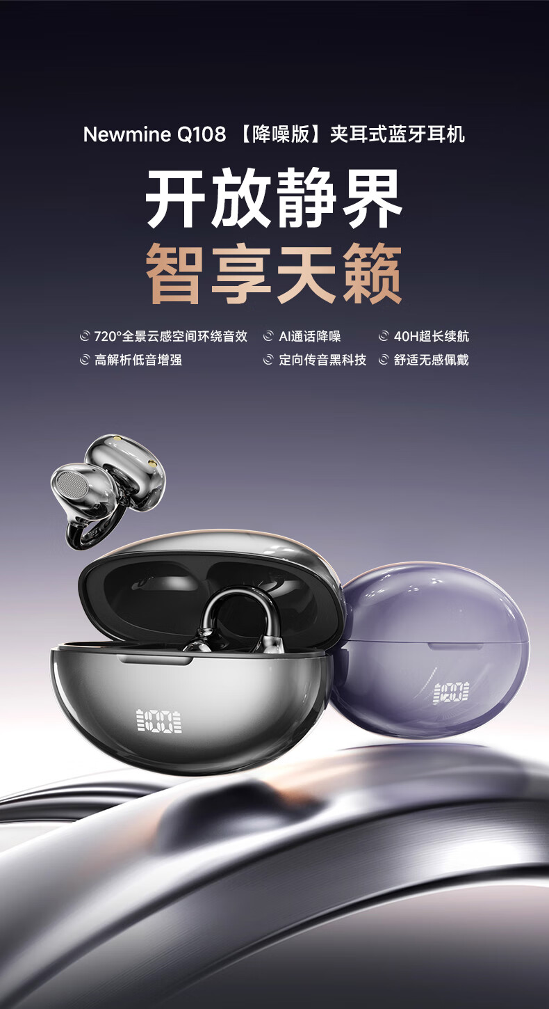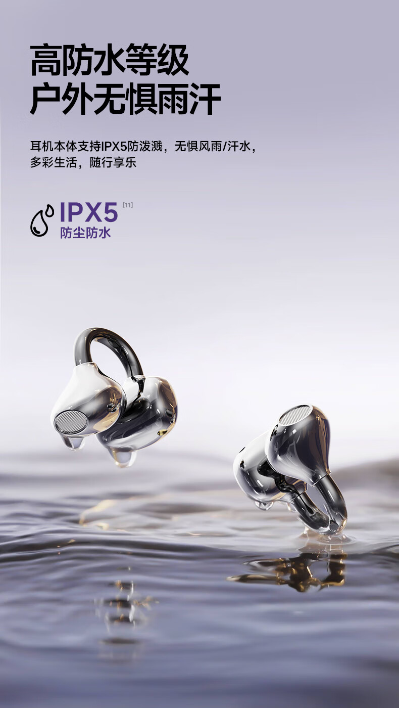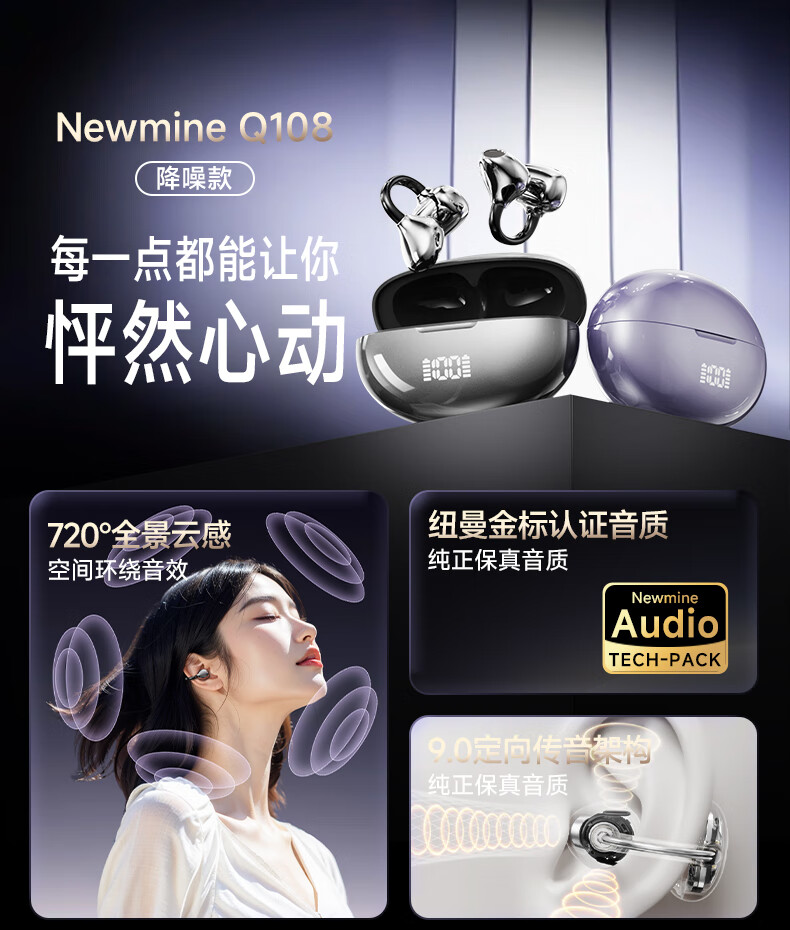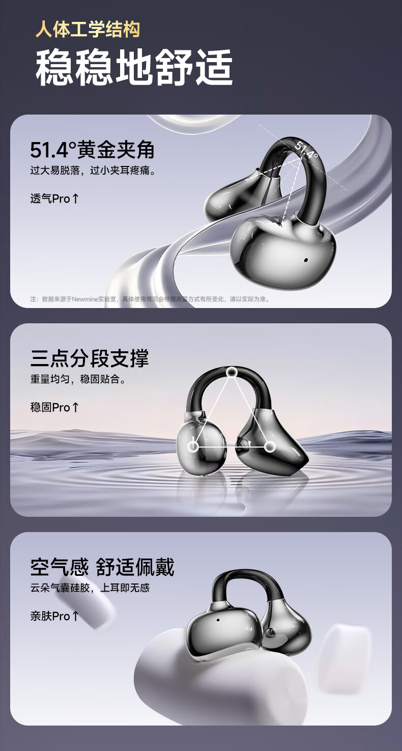 纽曼(Newmine)【2026顶配丨720°全景云感环绕音】蓝牙耳机耳夹式骨传导真无线不入耳运动跑步通话降噪超长续航 【720°空间环绕立体音丨无感佩戴丨超长续航】紫色