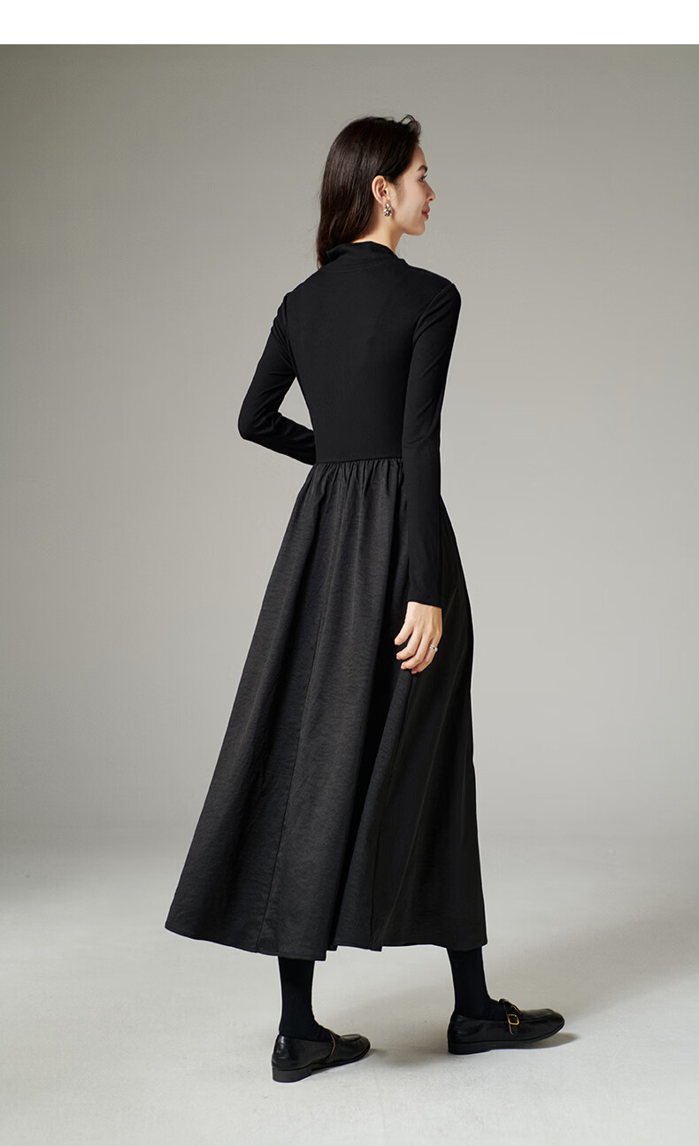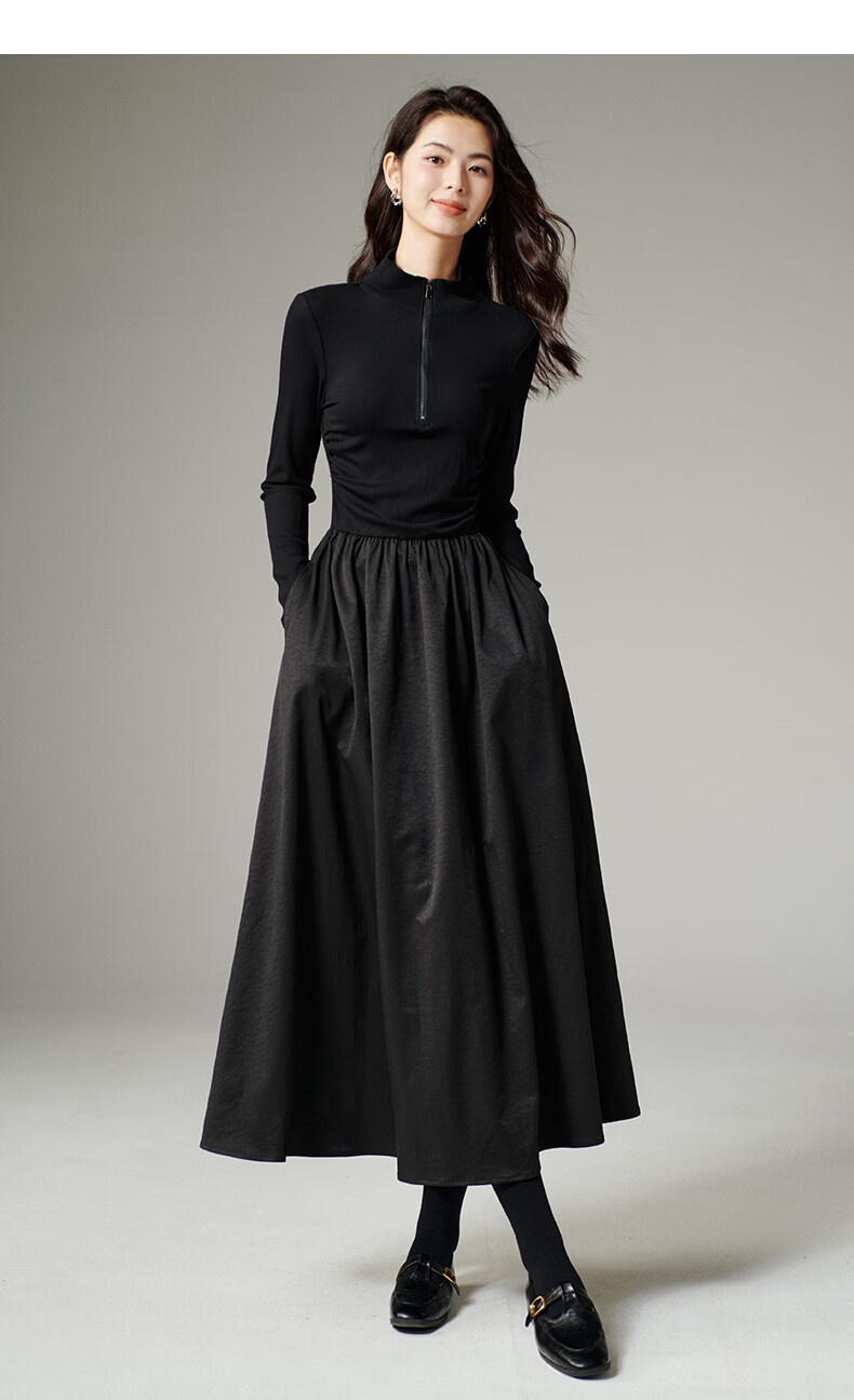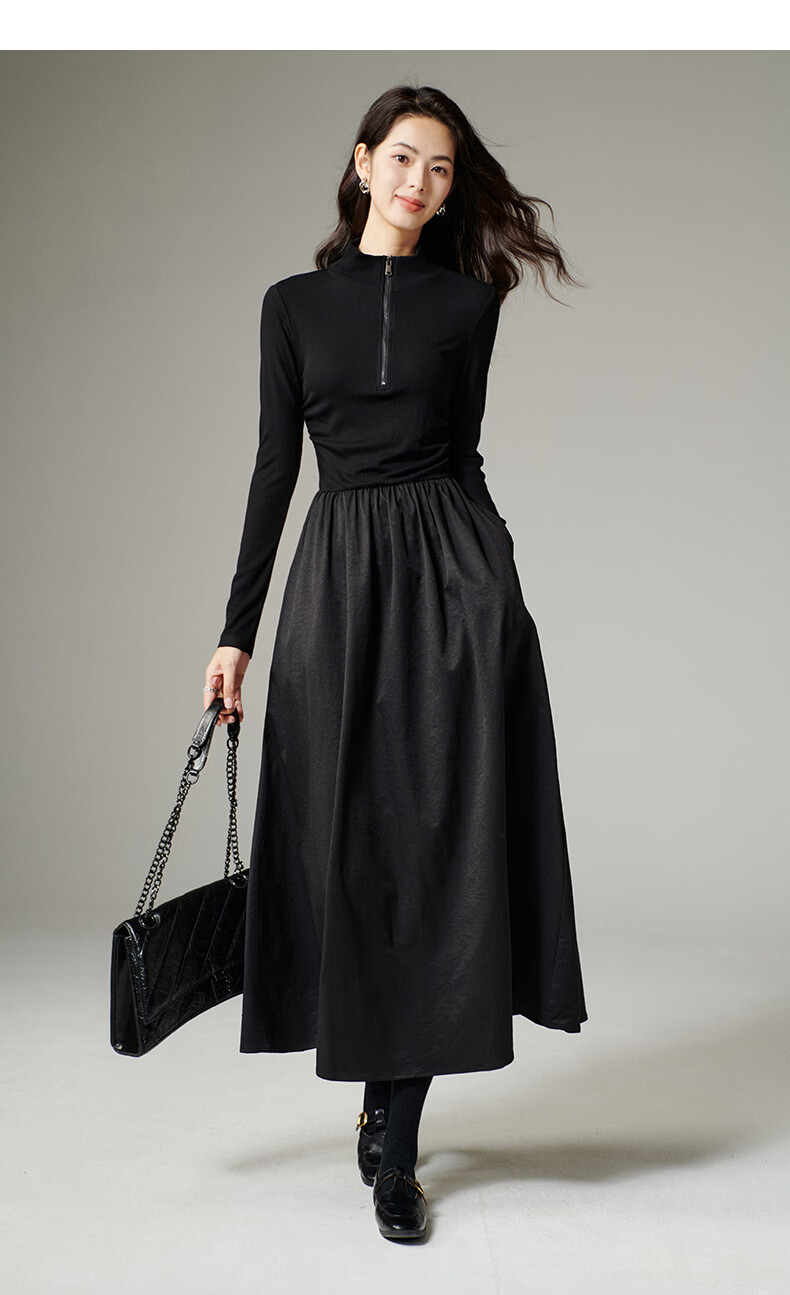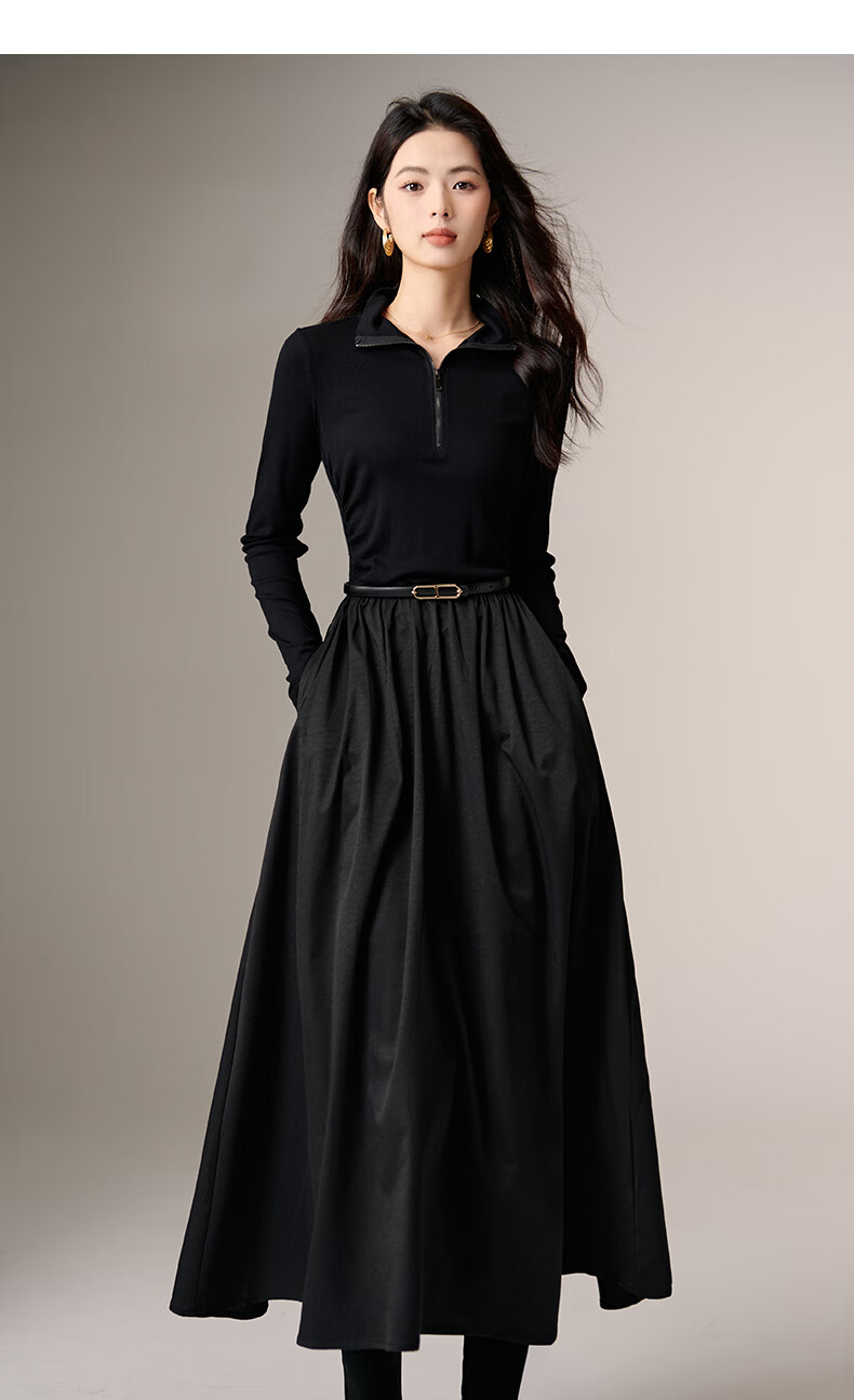晚白【新品】冬款时尚裙子修身显瘦气质通勤大摆长袖连衣裙 黑色 S