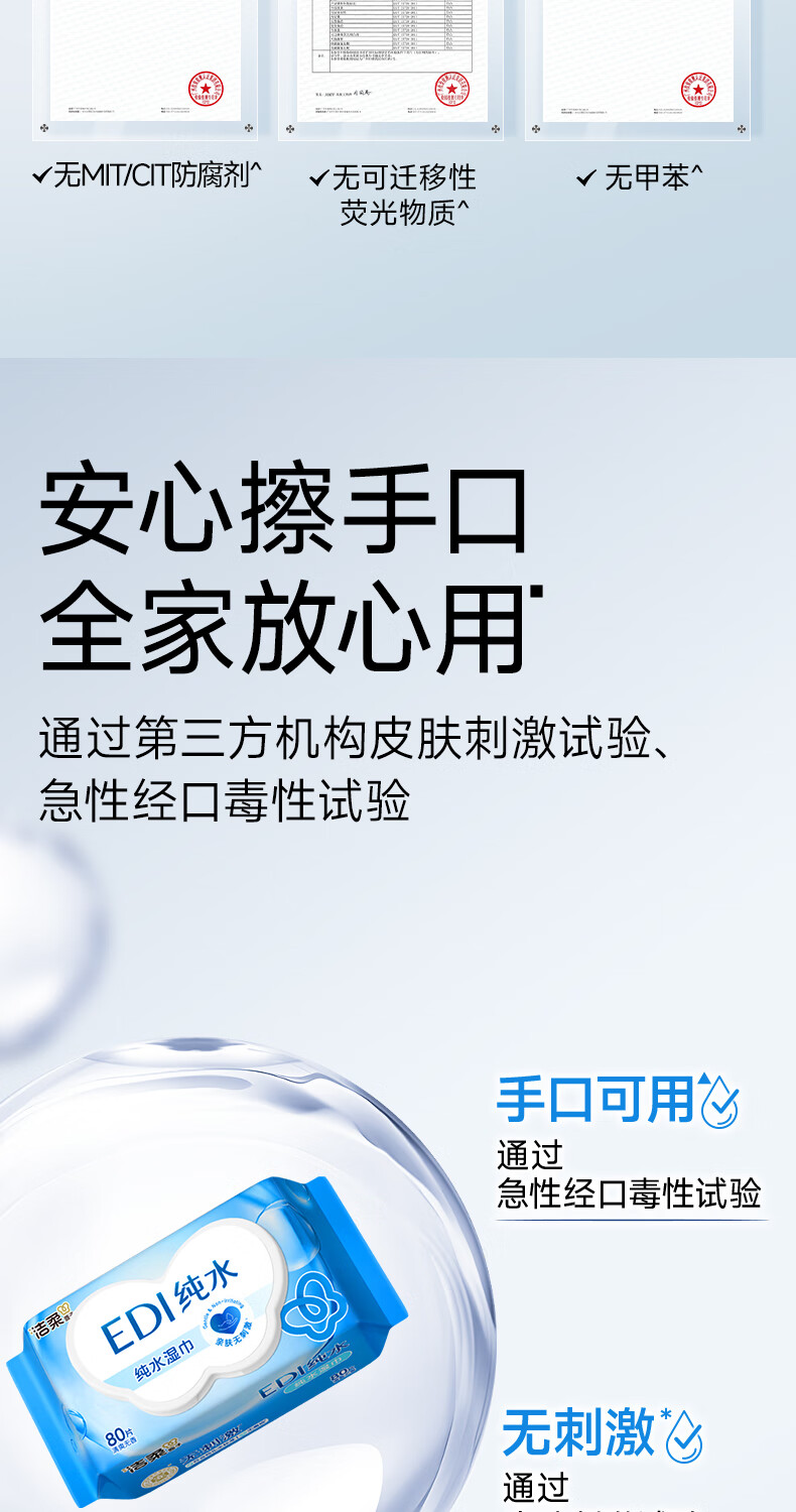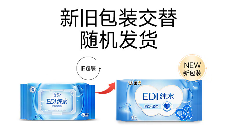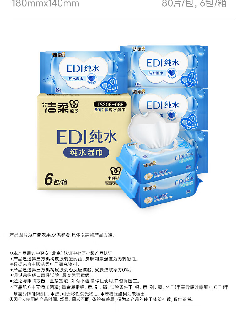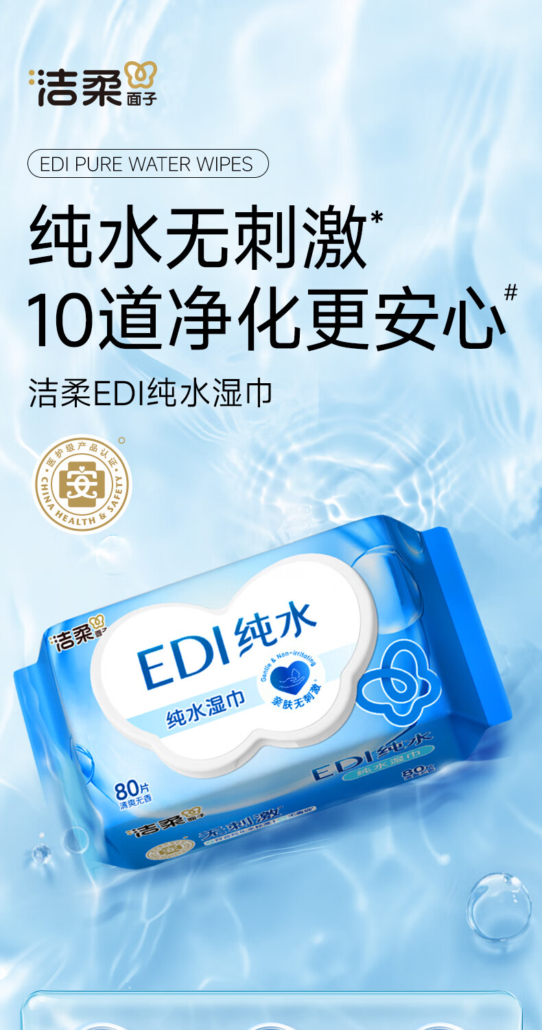 洁柔湿巾EDI纯水面子湿巾纸不含酒精亲肤无刺激清爽无香家用80片6包 6包共480片整箱