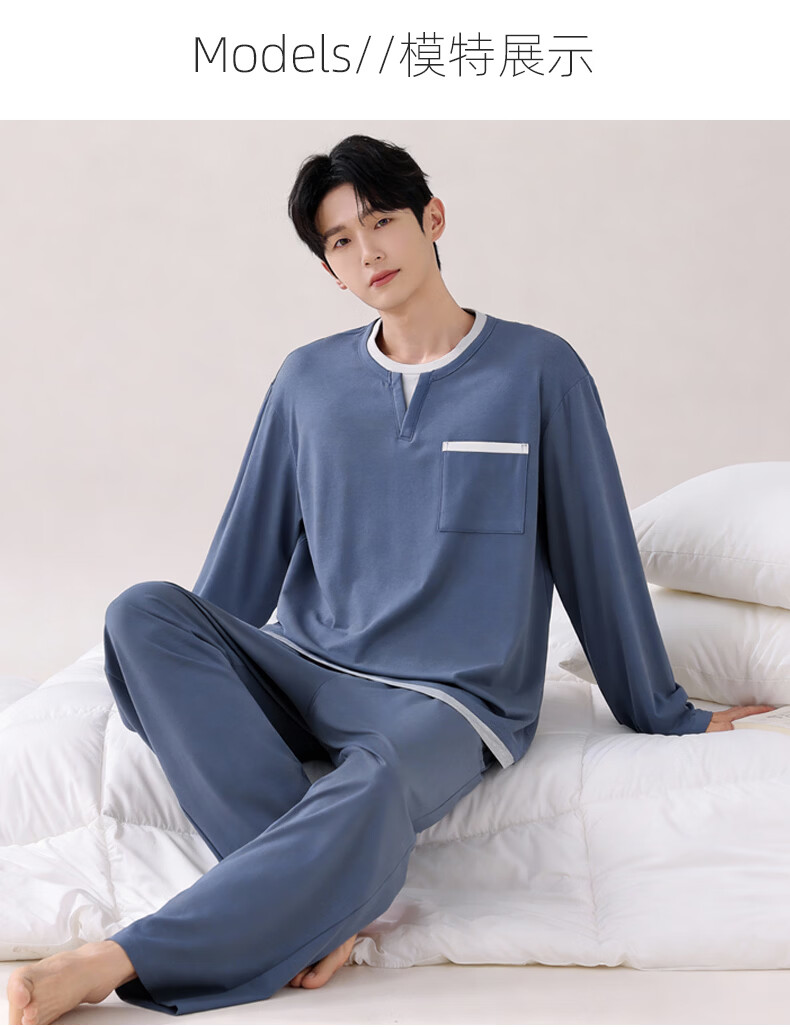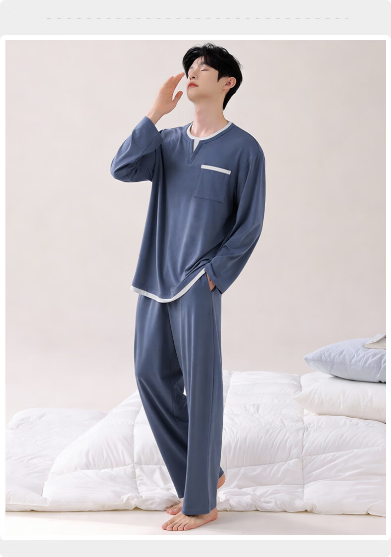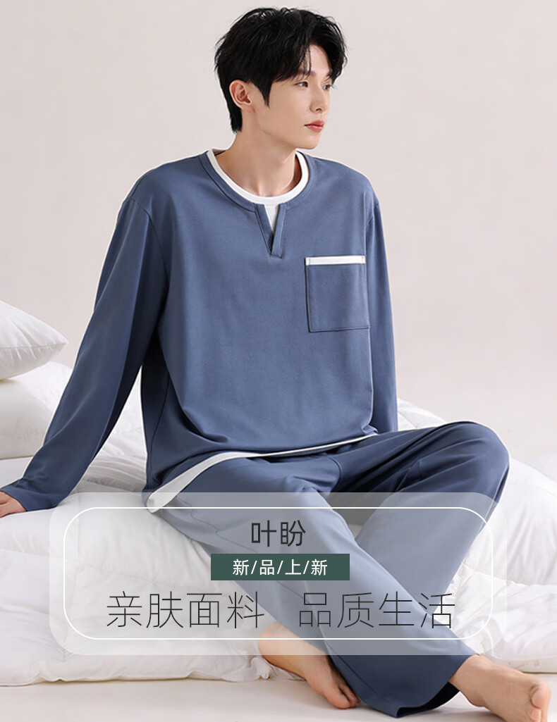 叶盼(yepan)【柔软】莱卡纯棉睡衣男春秋长袖套头男款宽松大码舒适家居服套装 8601-宝蓝 L (170) :建议100-135斤穿着