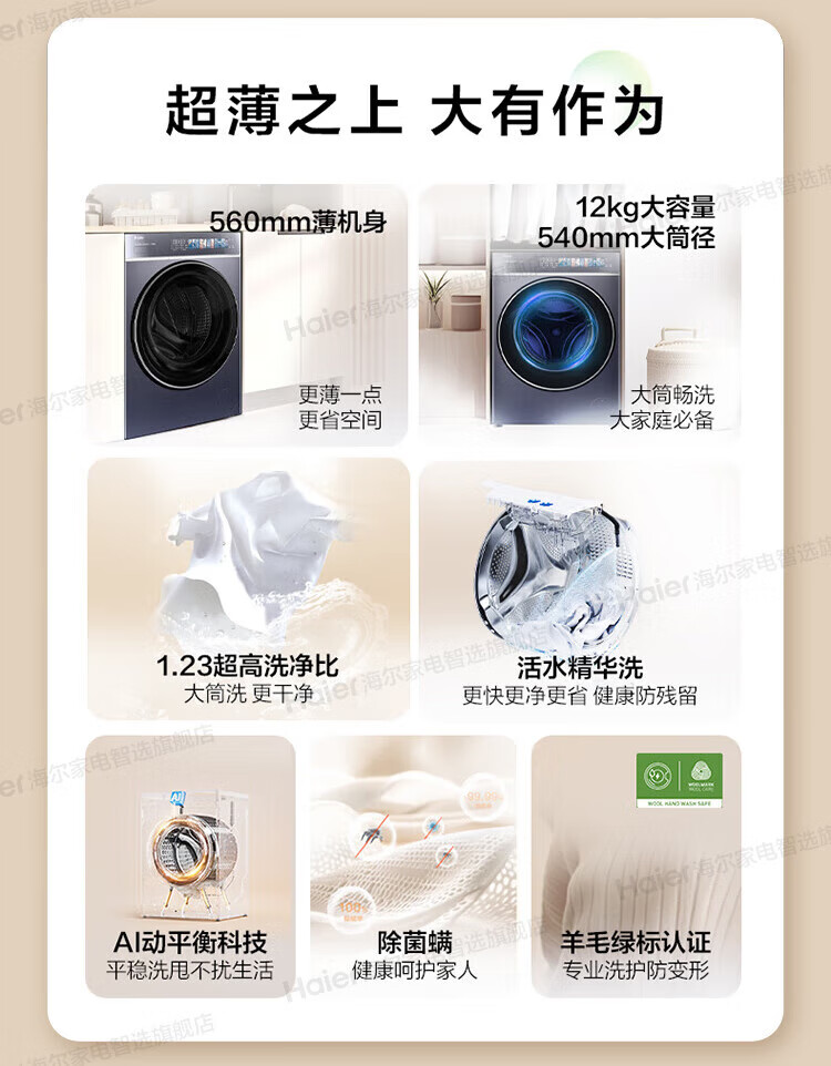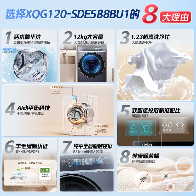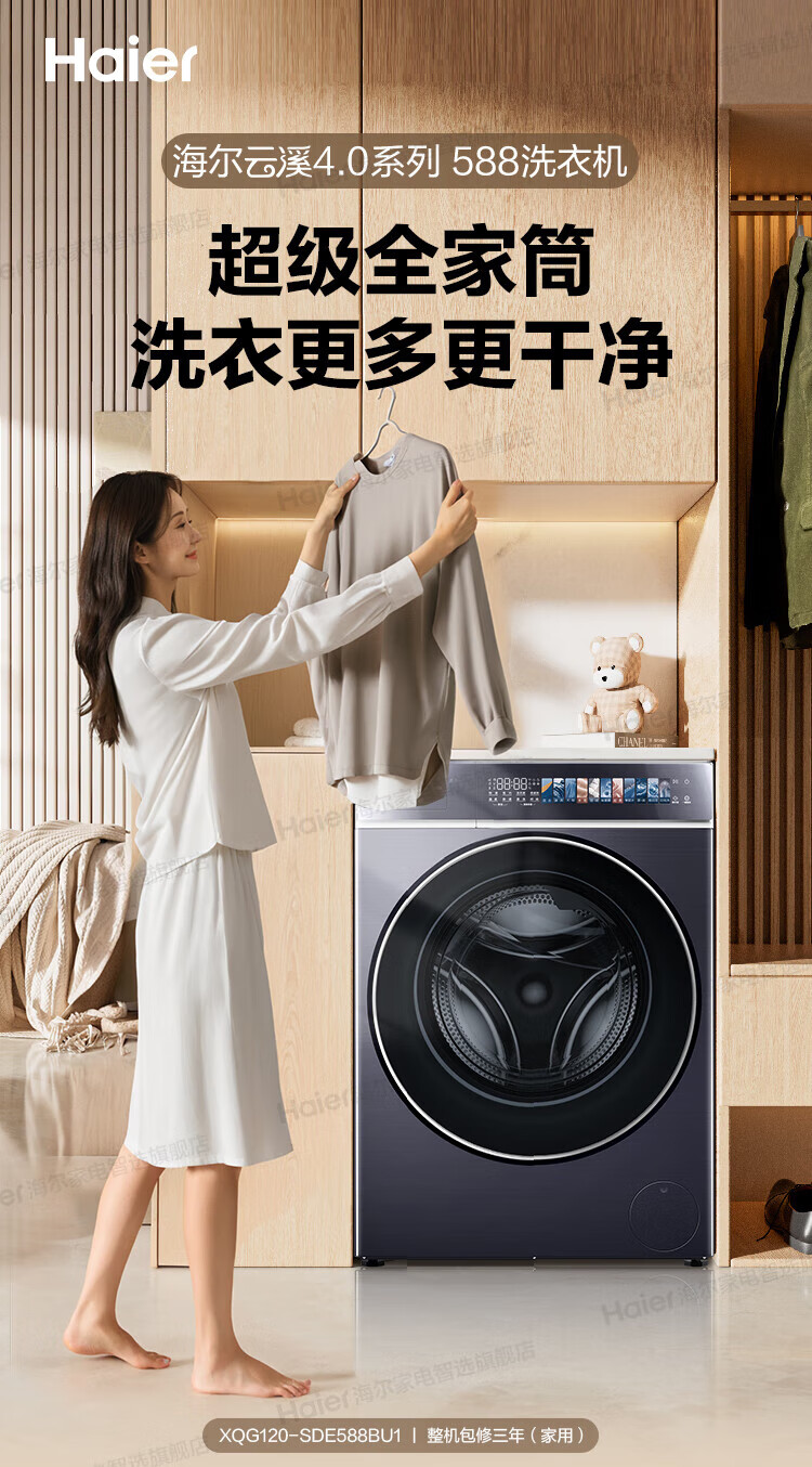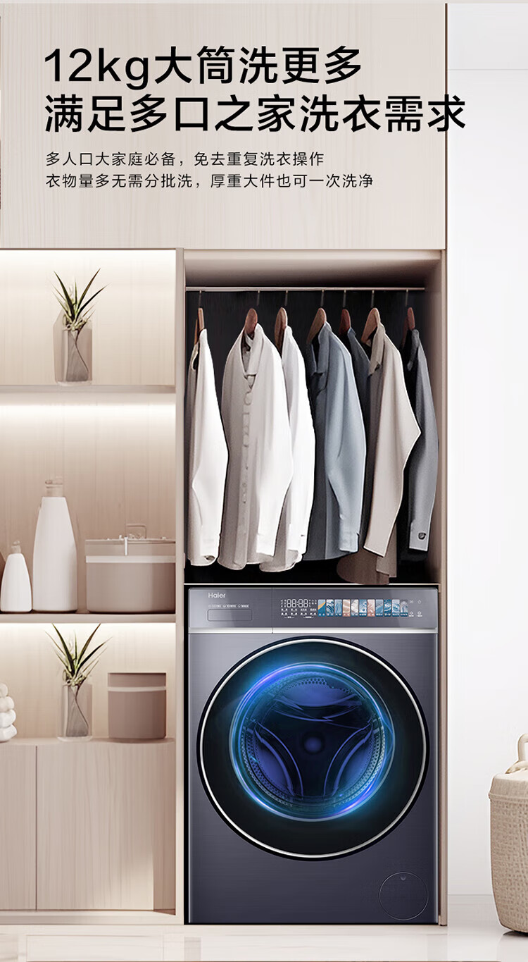 海尔云溪4.0极致超薄款12公斤滚筒洗衣机全自动超薄平嵌家用大容量588一级能效540大筒精华洗 国家补贴 12KG单洗+双智投+540大筒+1.23高洗净比