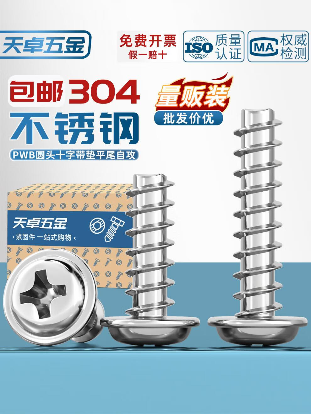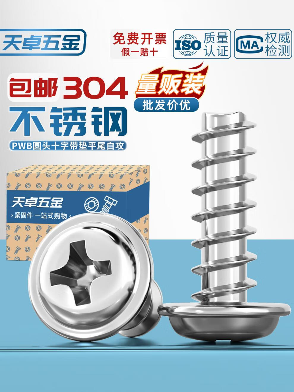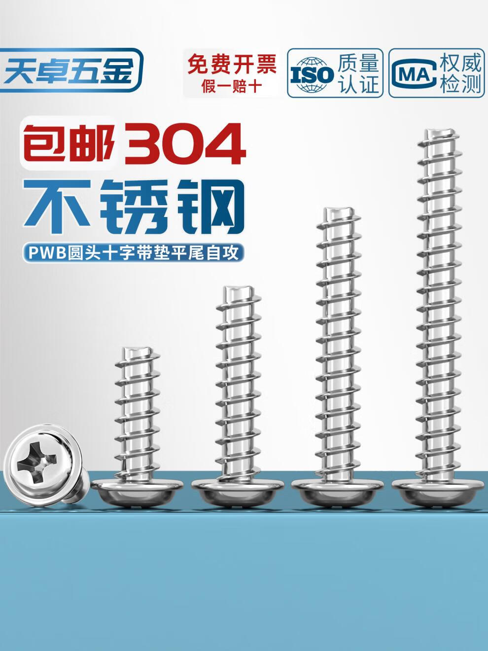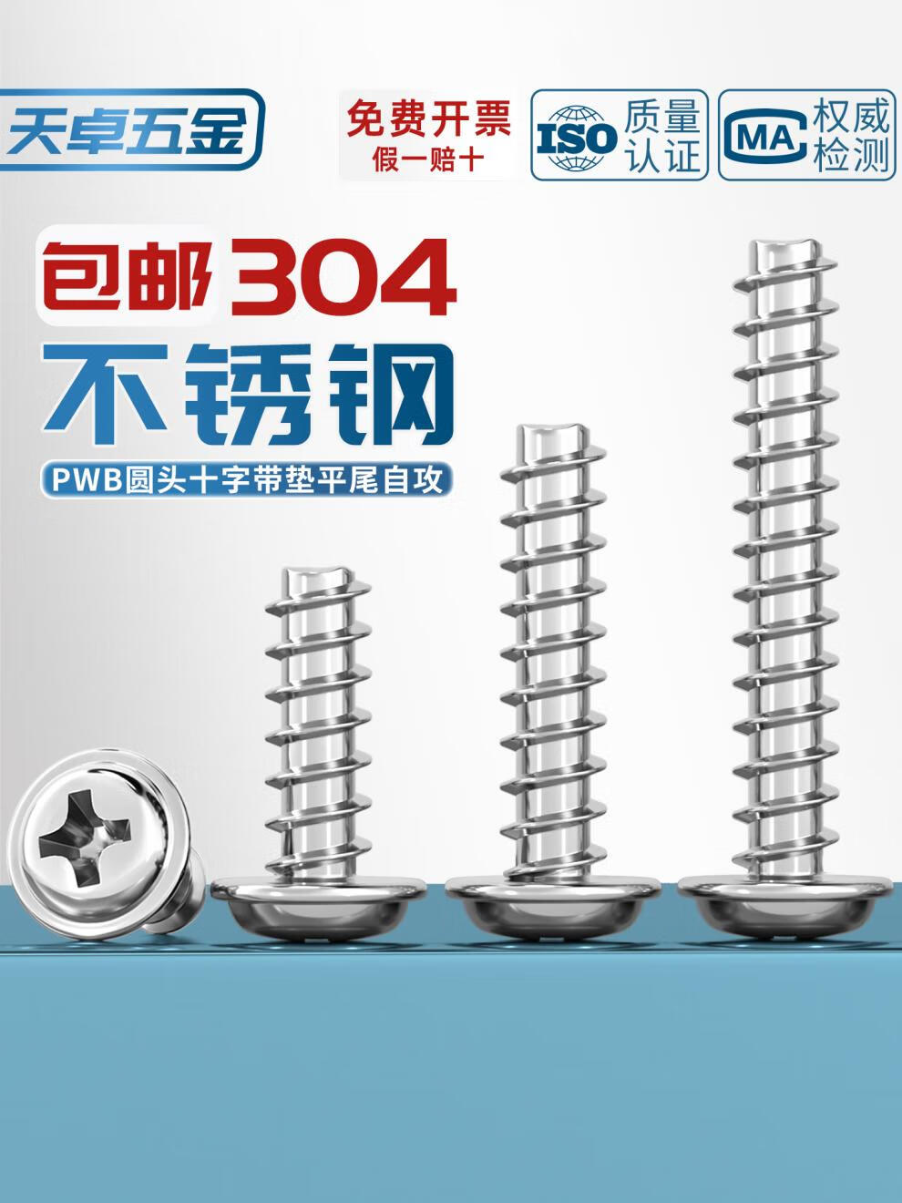 天卓五金PWB 304不锈钢十字圆头带垫平尾自攻螺丝盘头螺钉M2M2.6M3M4M5mm M1.7*3-500个【304材质】
