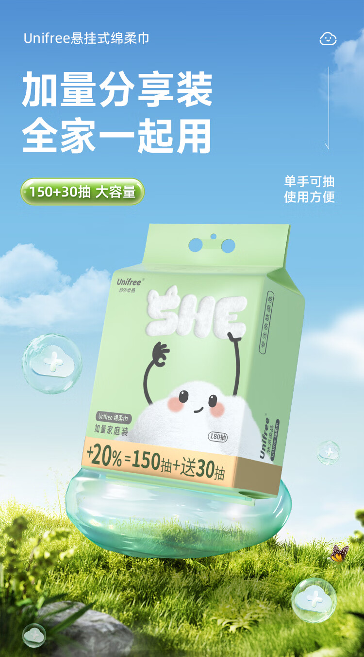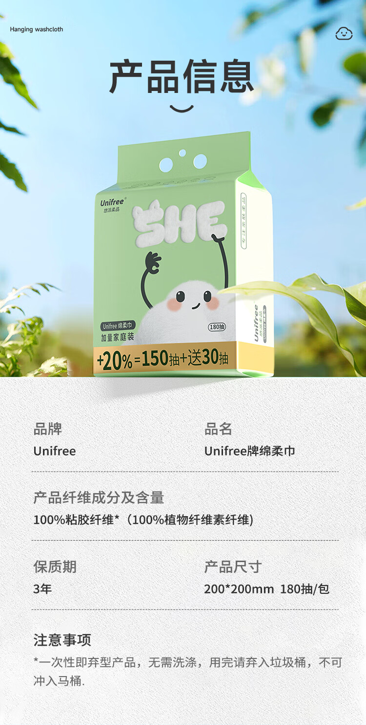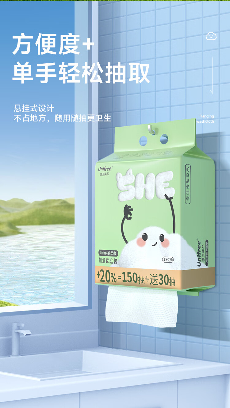 unifree悬挂洗脸巾一次性珍珠纹擦脸巾洁面巾加大加厚干湿两用 悬挂洗脸巾180抽1提