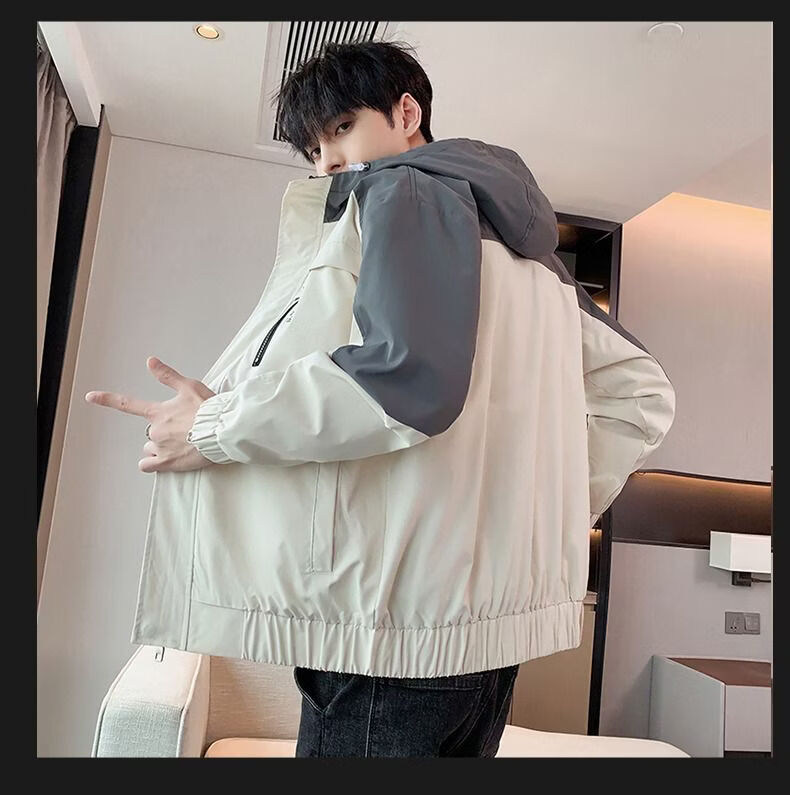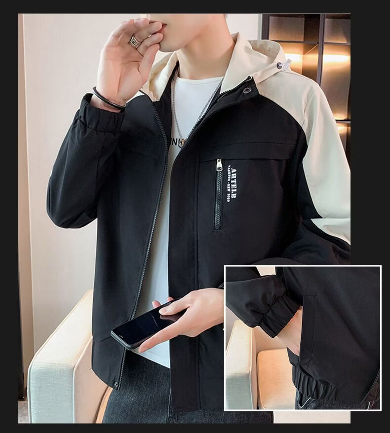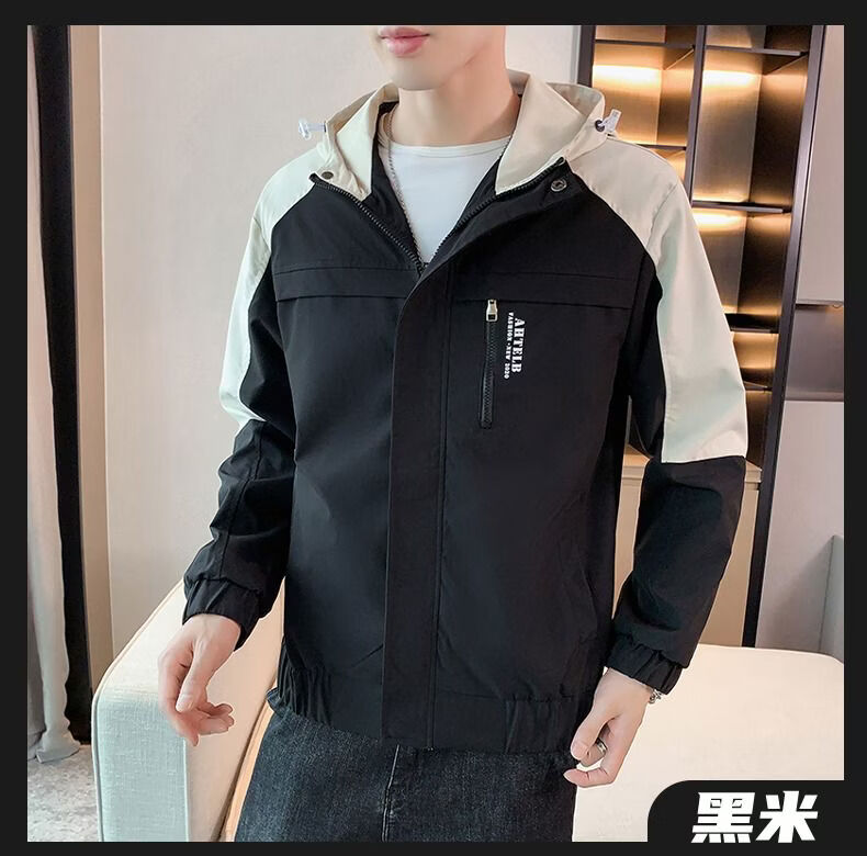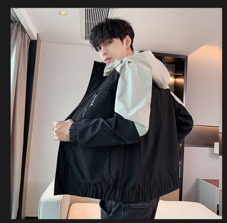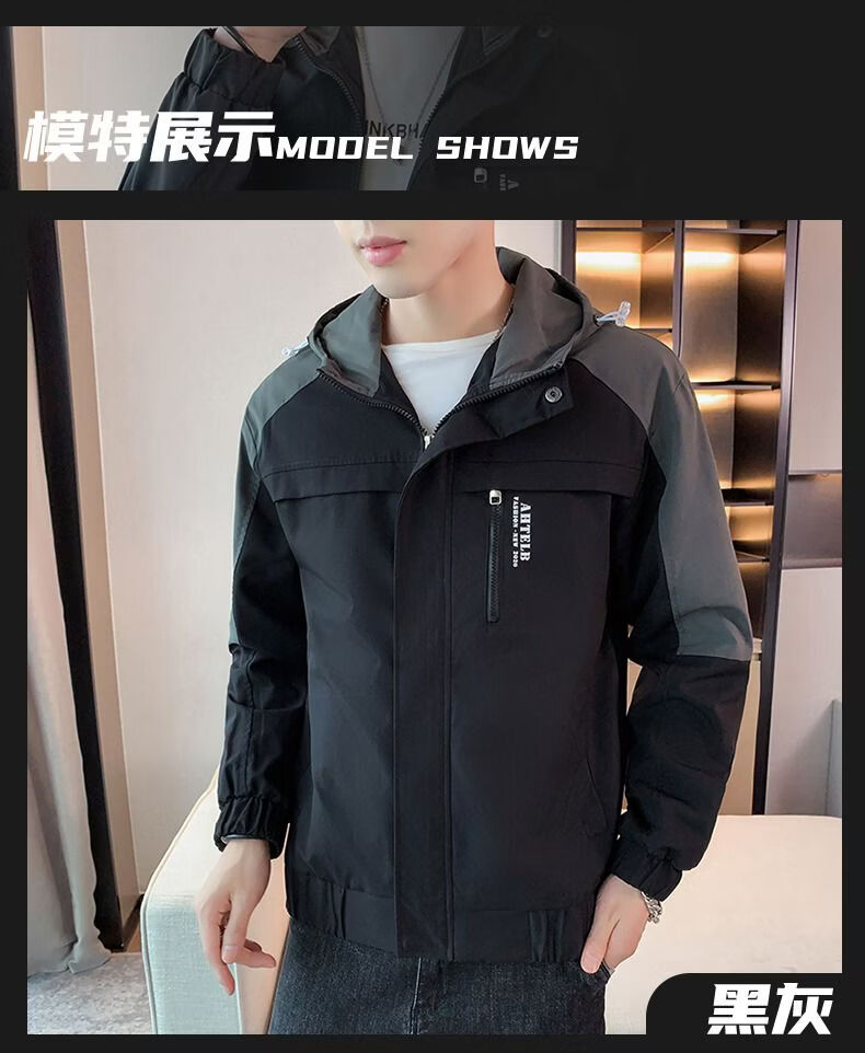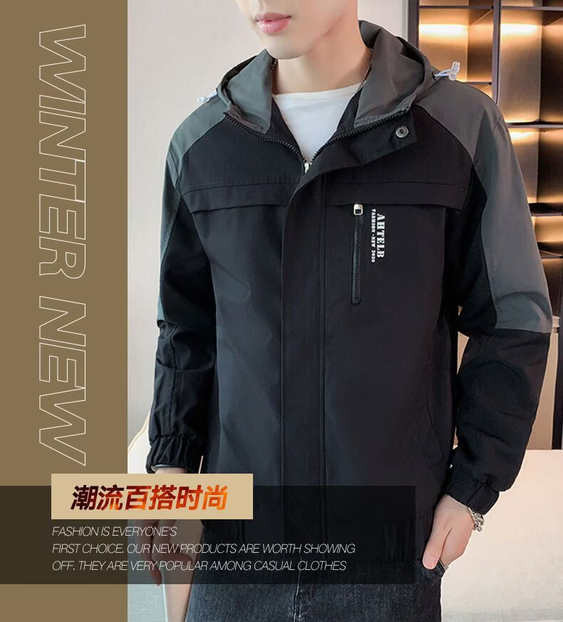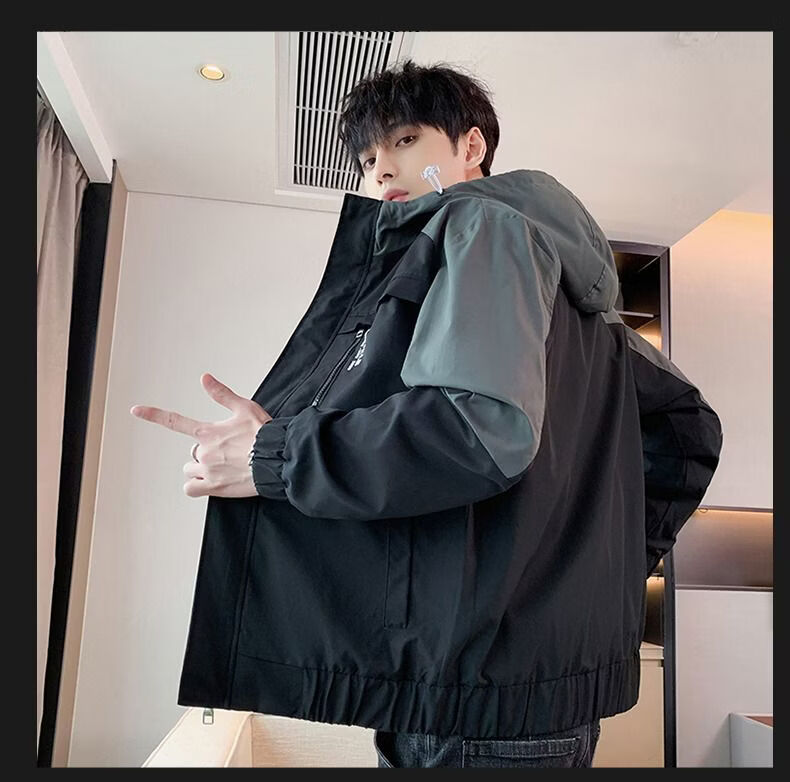 啄木鸟外套男春秋新款休闲夹克男生连帽上衣男潮流拼接夹克衫男衣服 黑灰色 M