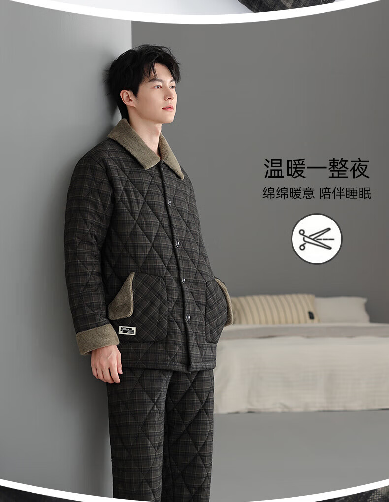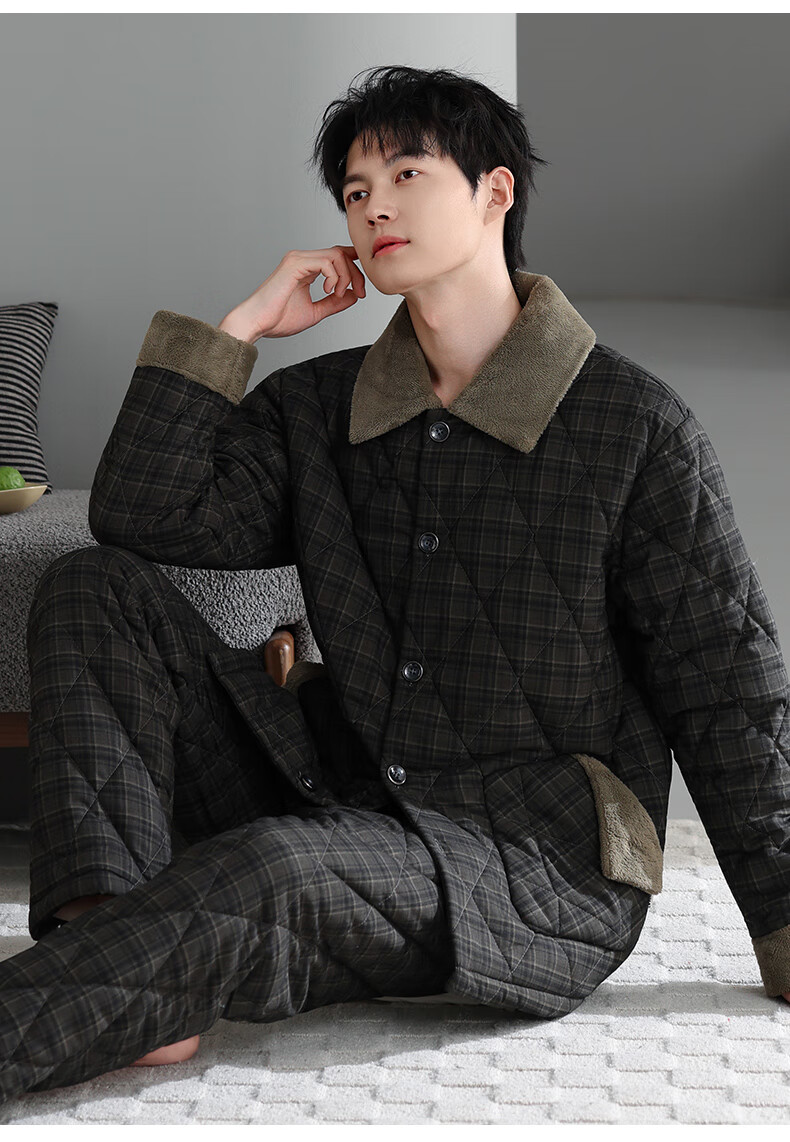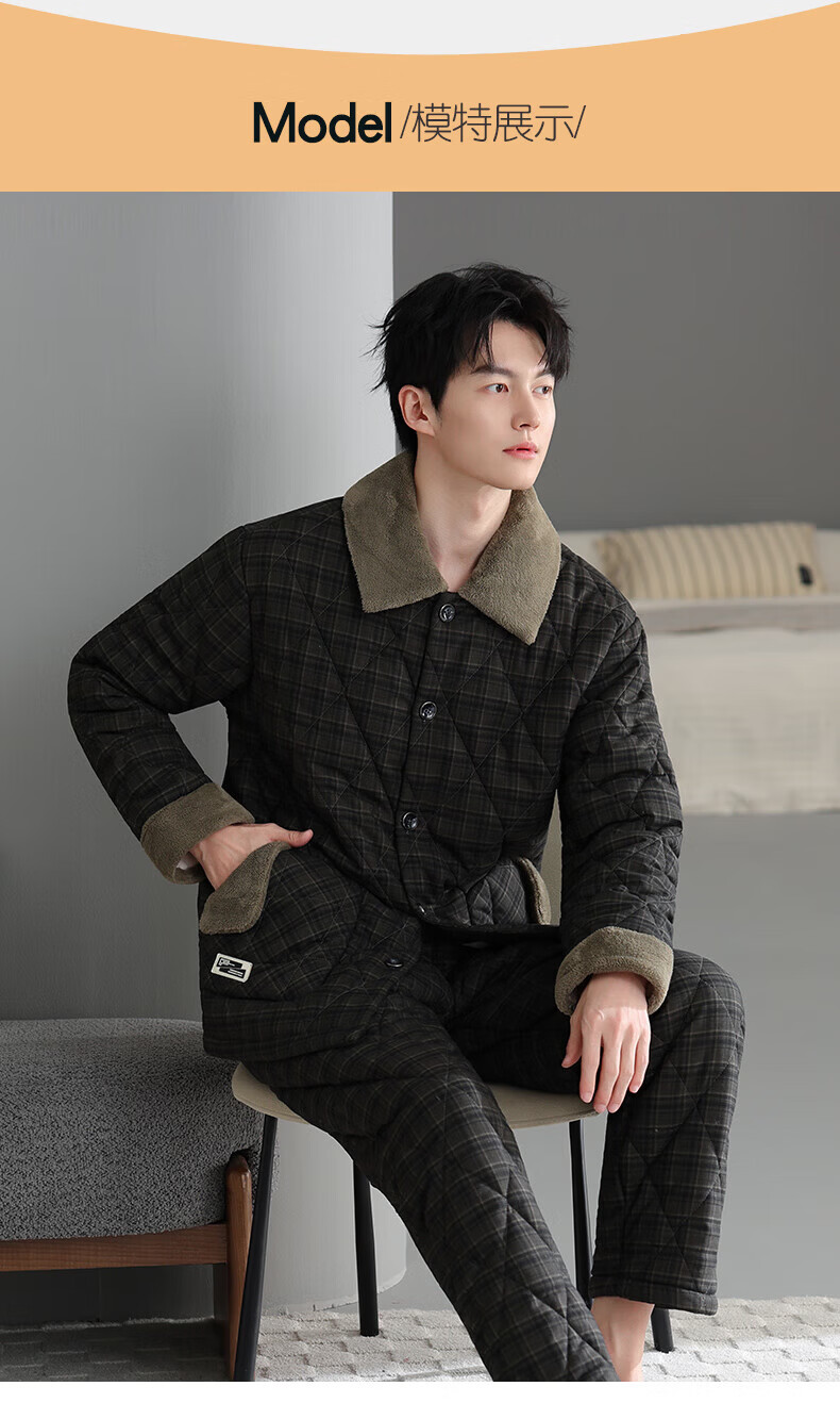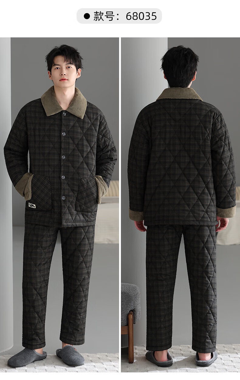 允织睡衣男士冬季三层加厚加绒梭织纯棉夹棉秋冬款珊瑚绒加大码家居服 68035-黑灰 L (170) :建议100-130斤穿着